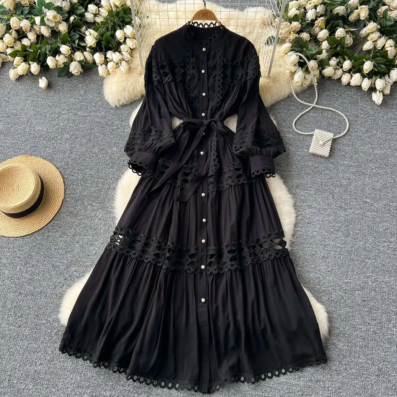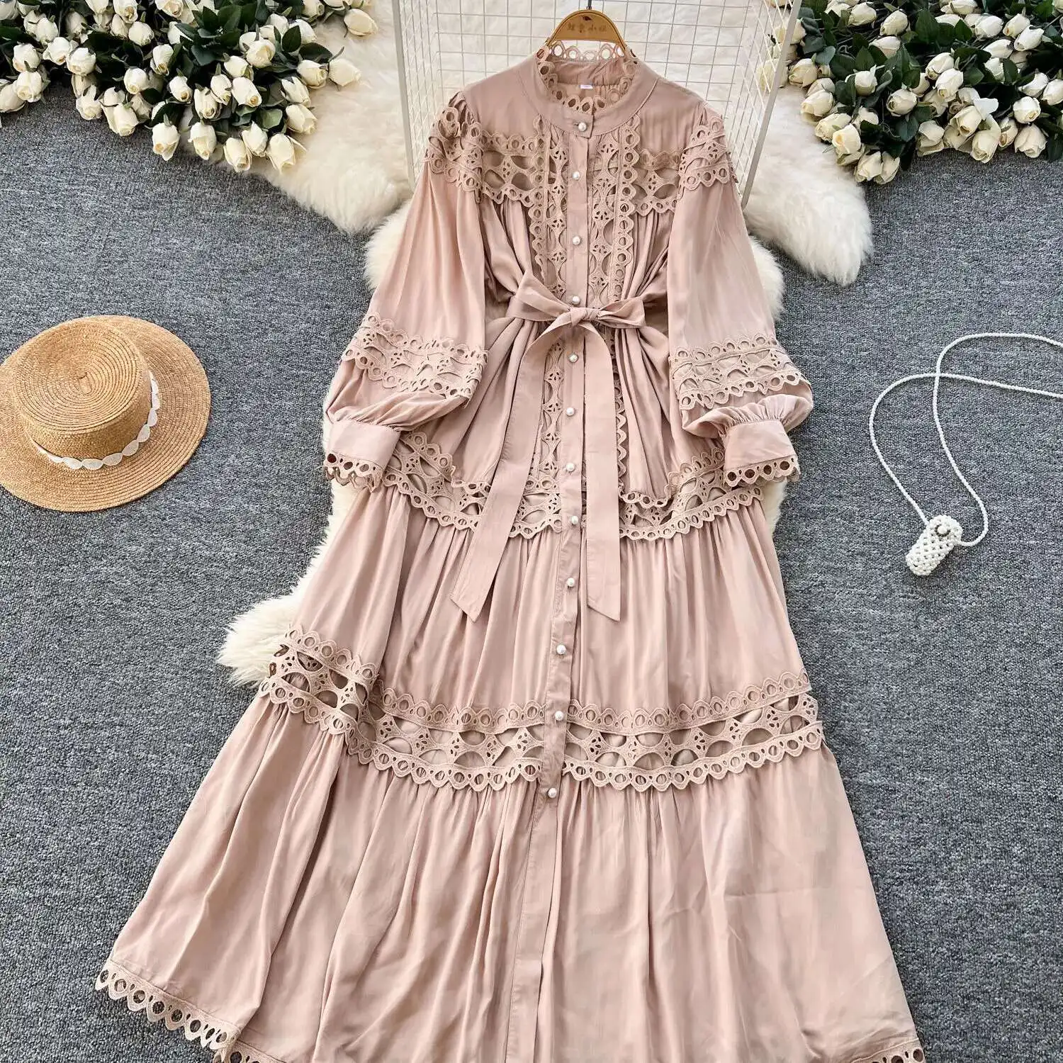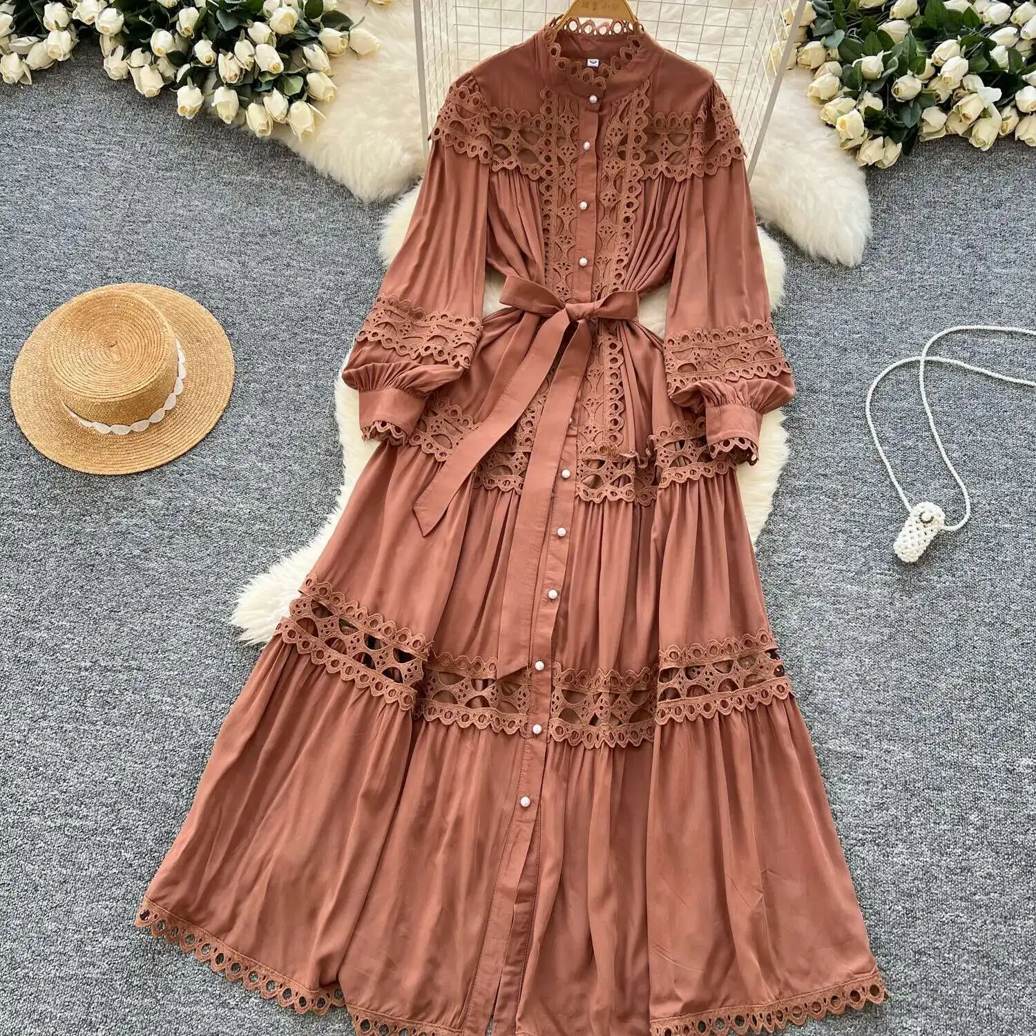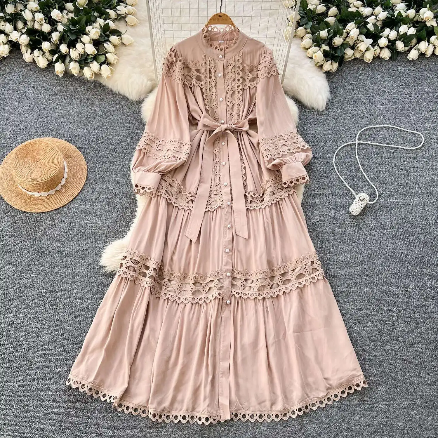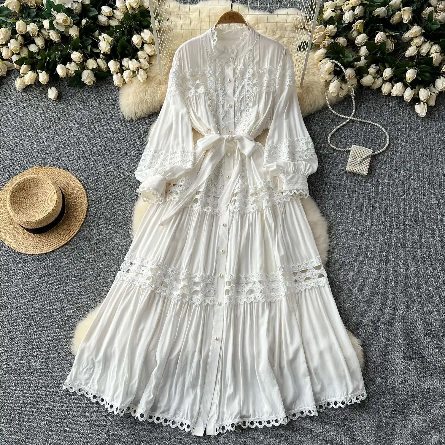 أنيقة طويلة ماكسي الجوف خارج فستان قميص المرأة الصيف الخريف قصر الرجعية زر اللؤلؤ التطريز الكروشيه مساء فساتين الحفلات