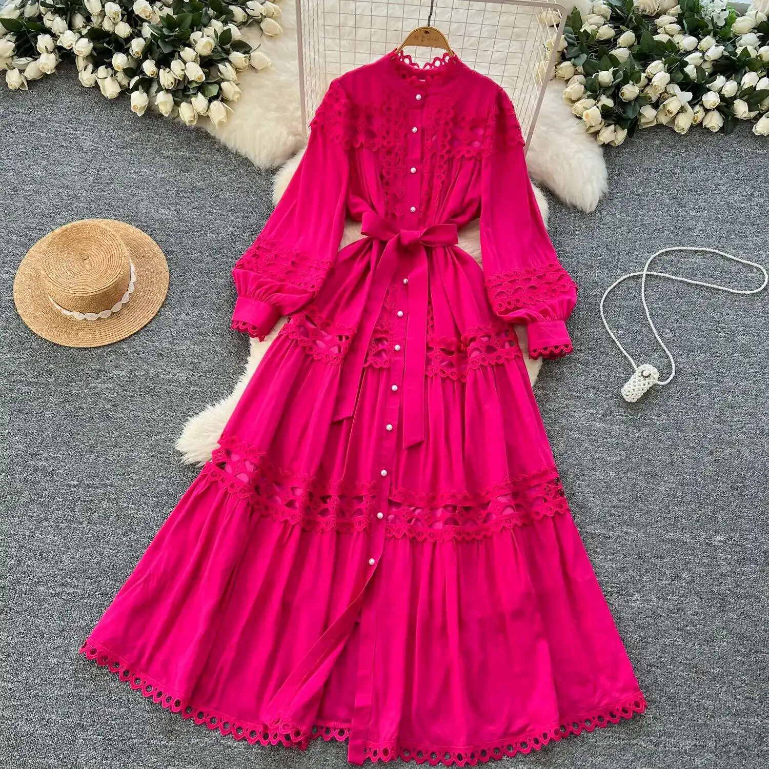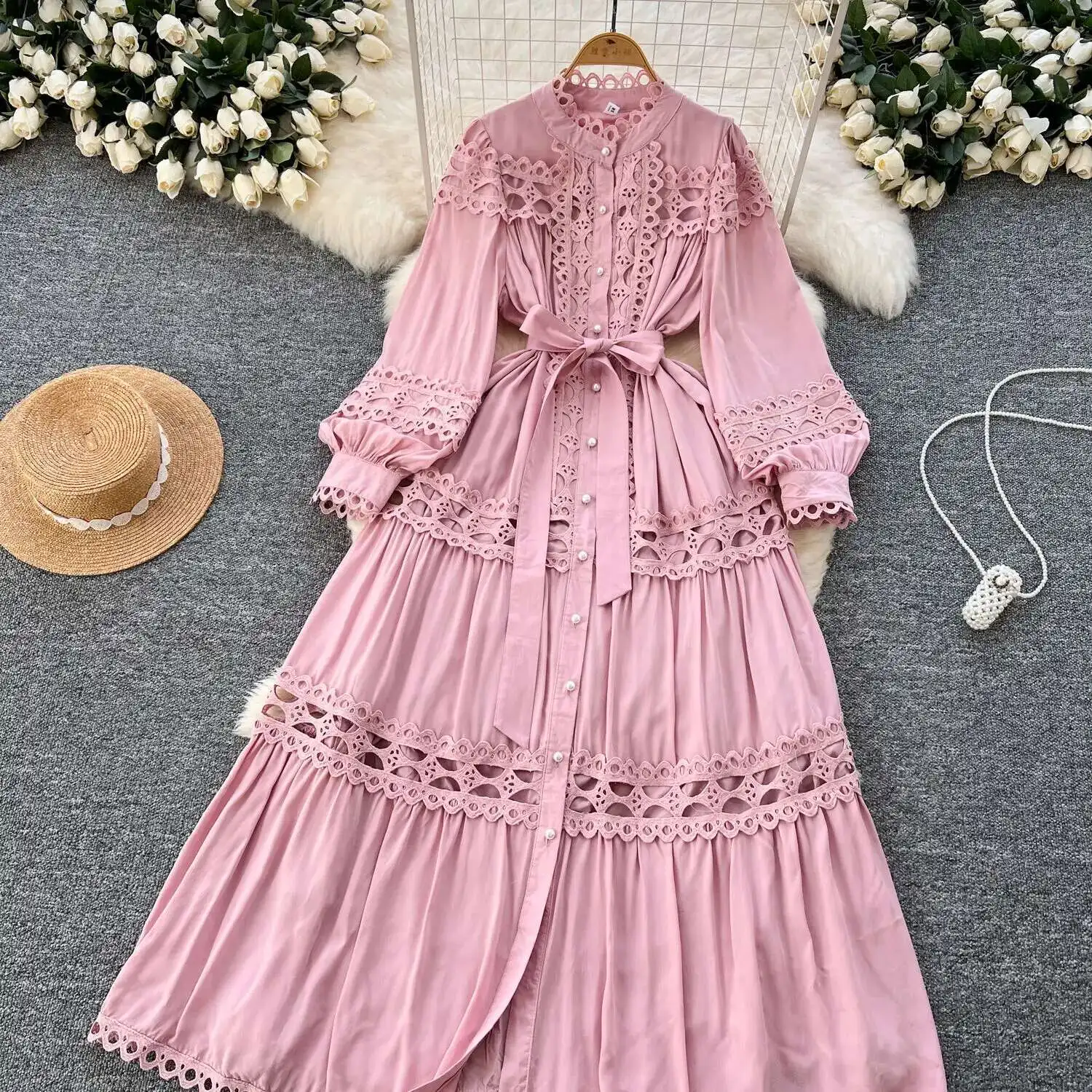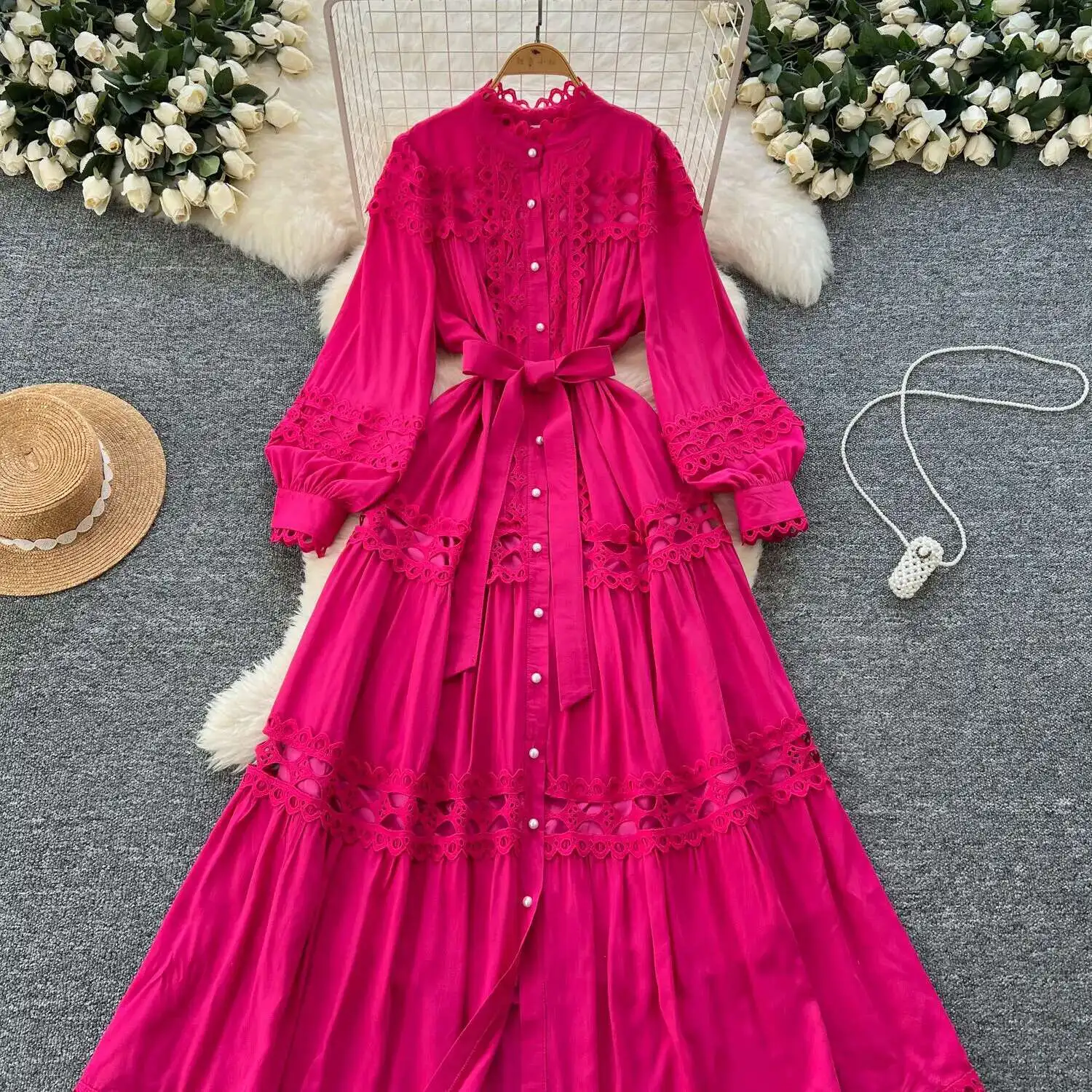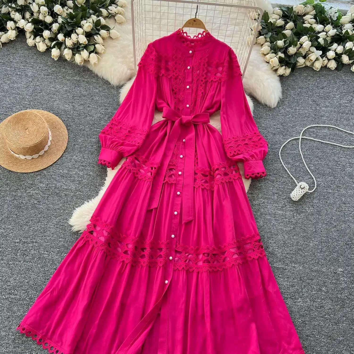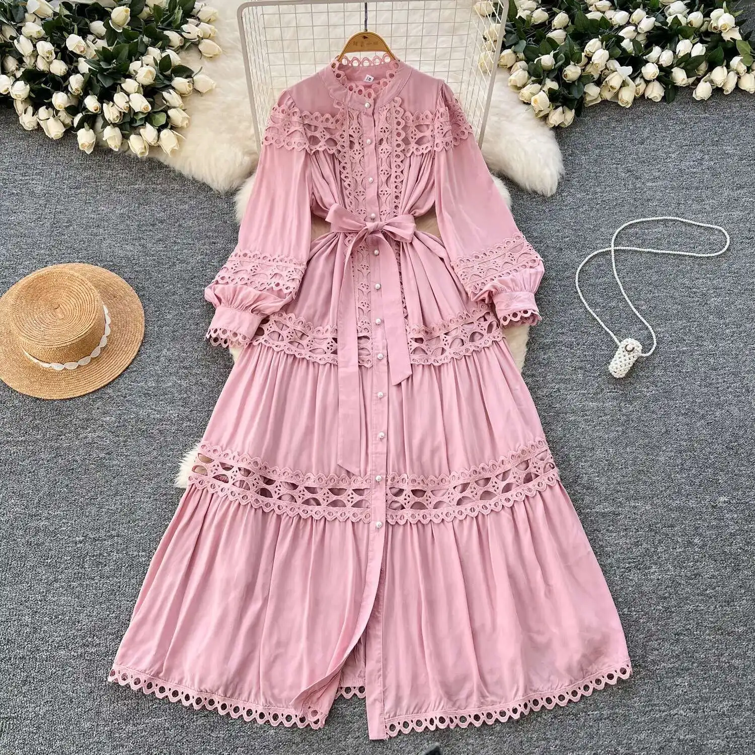أنيقة طويلة ماكسي الجوف خارج فستان قميص المرأة الصيف الخريف قصر الرجعية زر اللؤلؤ التطريز الكروشيه مساء فساتين الحفلات