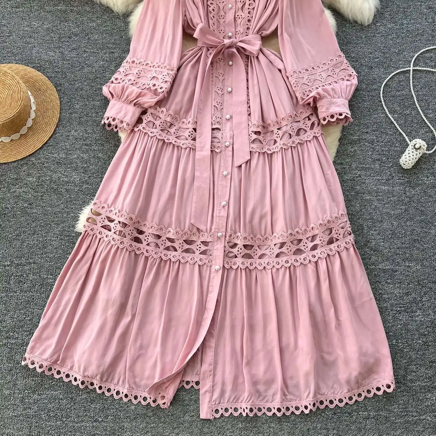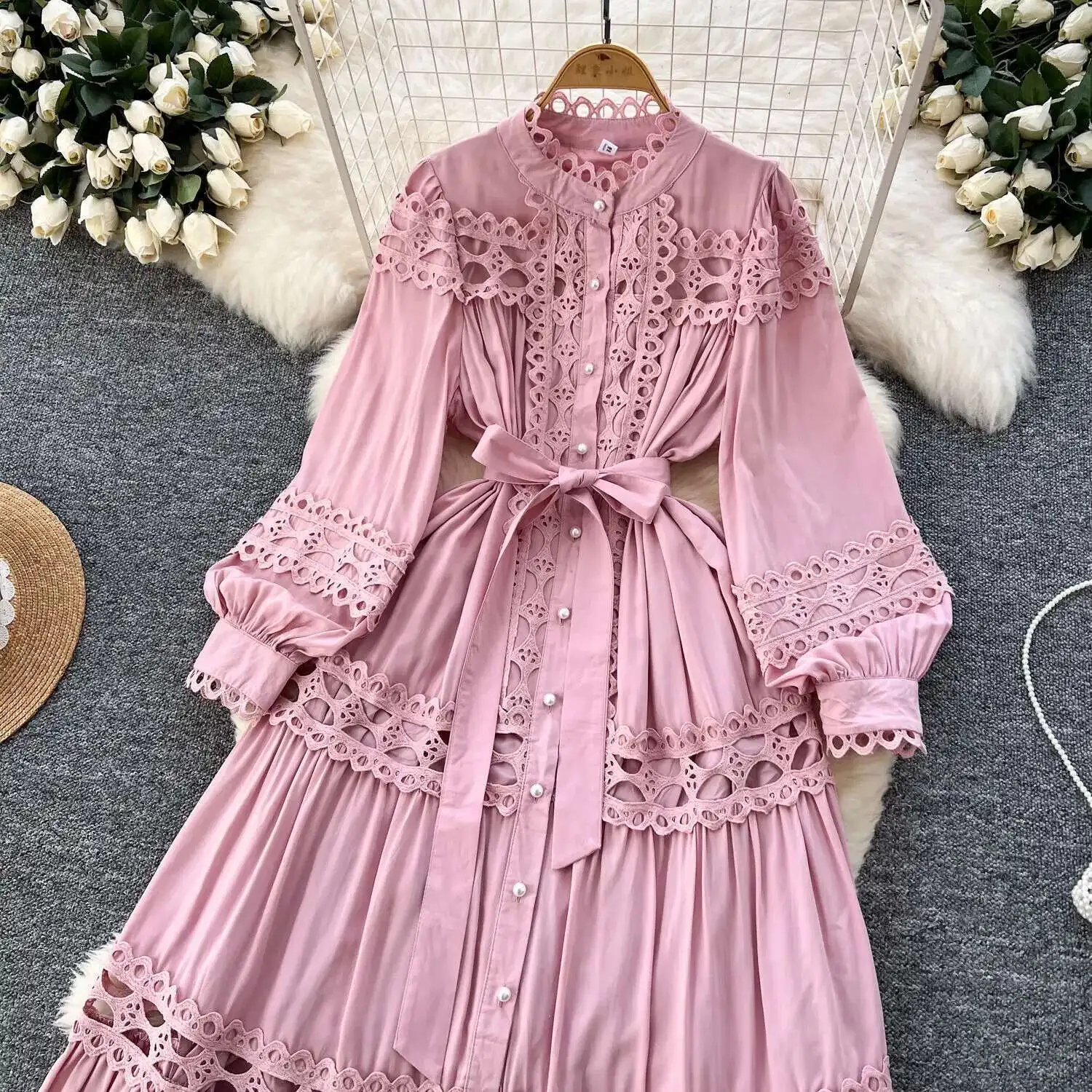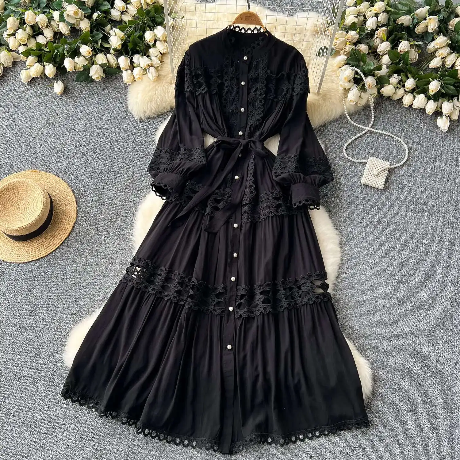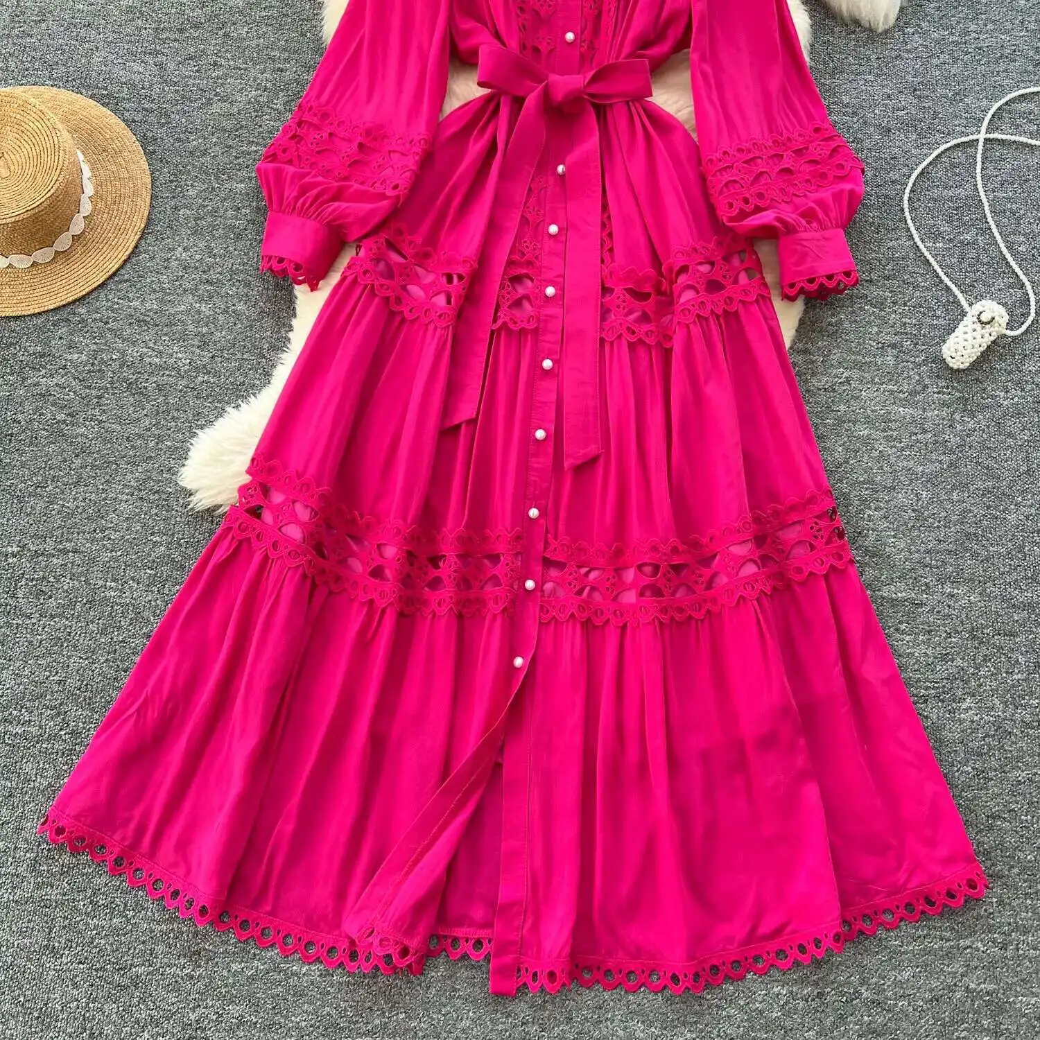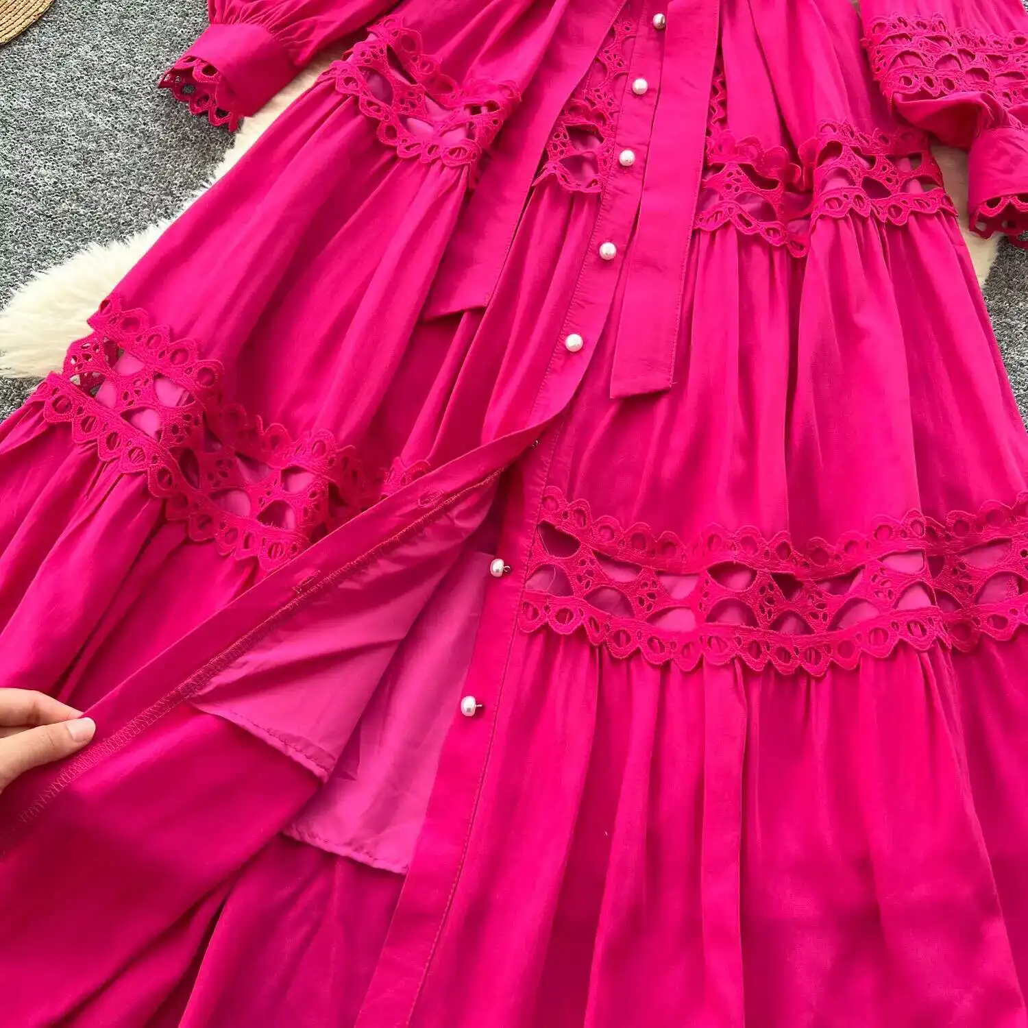 أنيقة طويلة ماكسي الجوف خارج فستان قميص المرأة الصيف الخريف قصر الرجعية زر اللؤلؤ التطريز الكروشيه مساء فساتين الحفلات