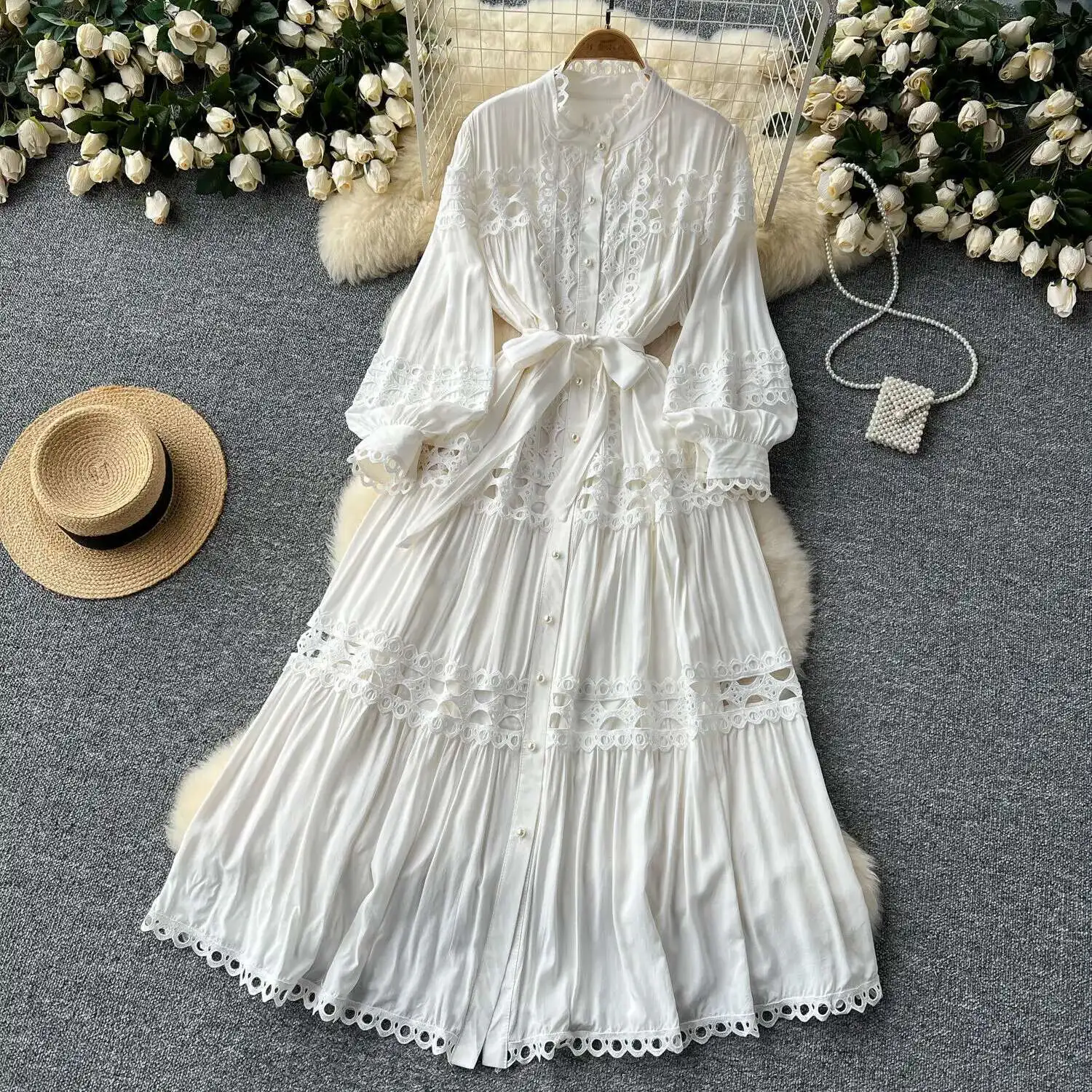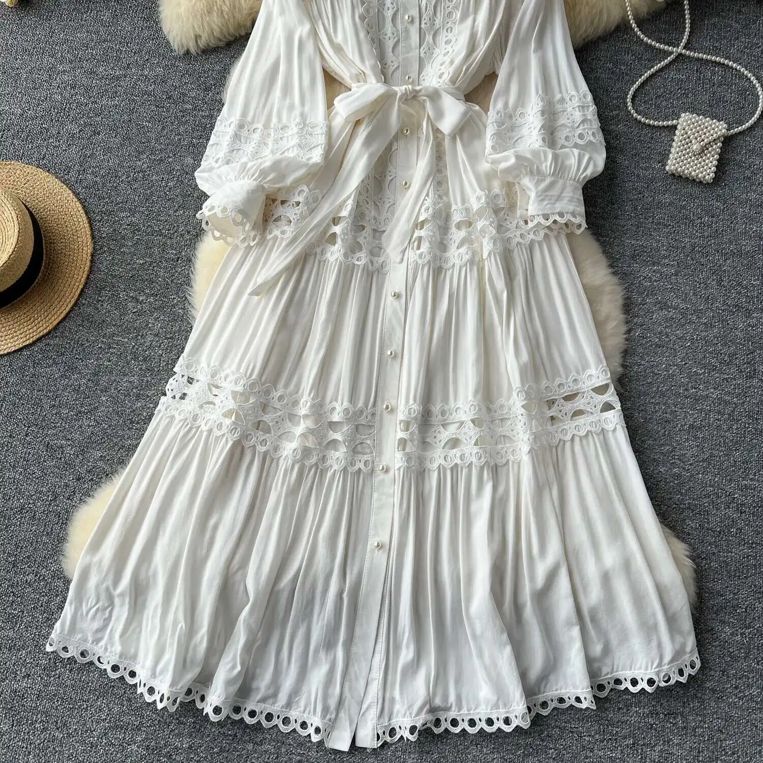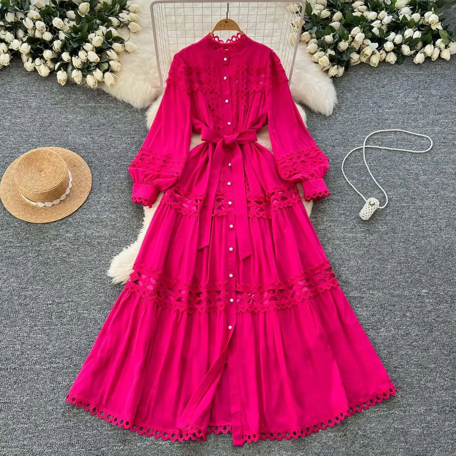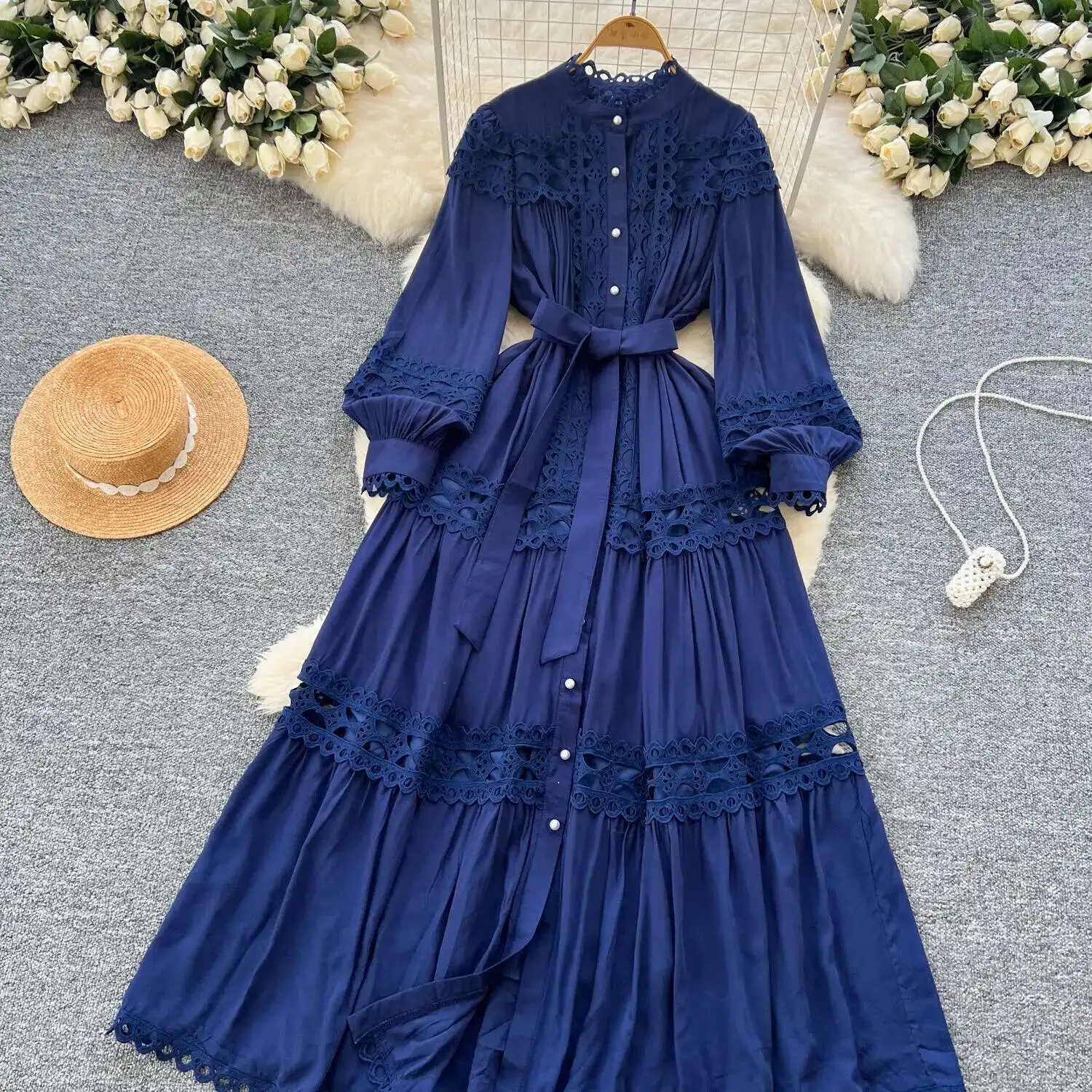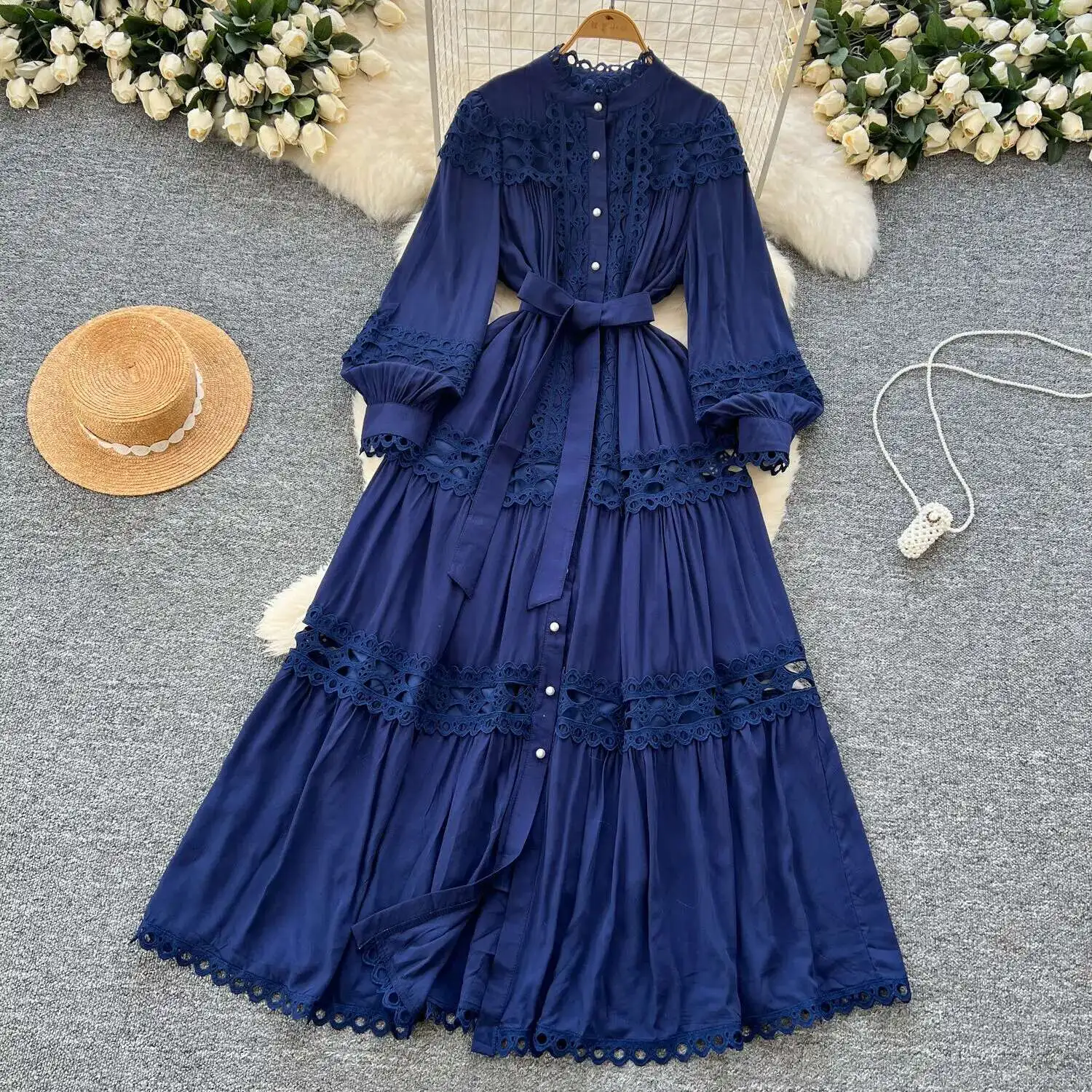 أنيقة طويلة ماكسي الجوف خارج فستان قميص المرأة الصيف الخريف قصر الرجعية زر اللؤلؤ التطريز الكروشيه مساء فساتين الحفلات