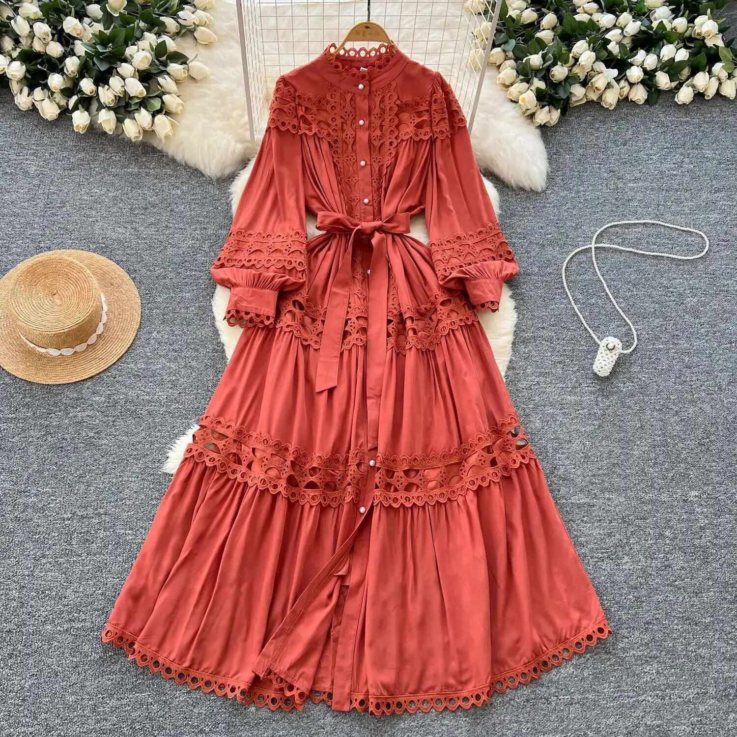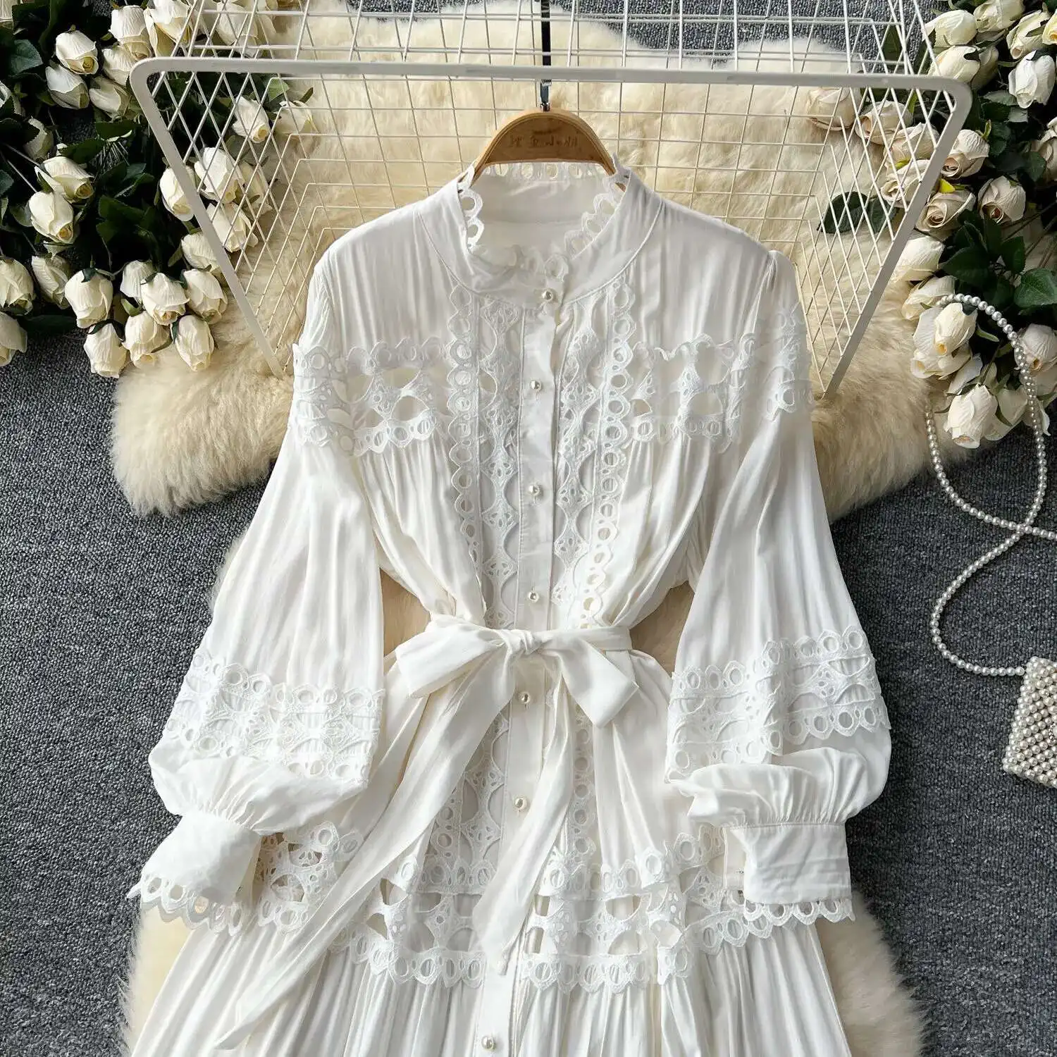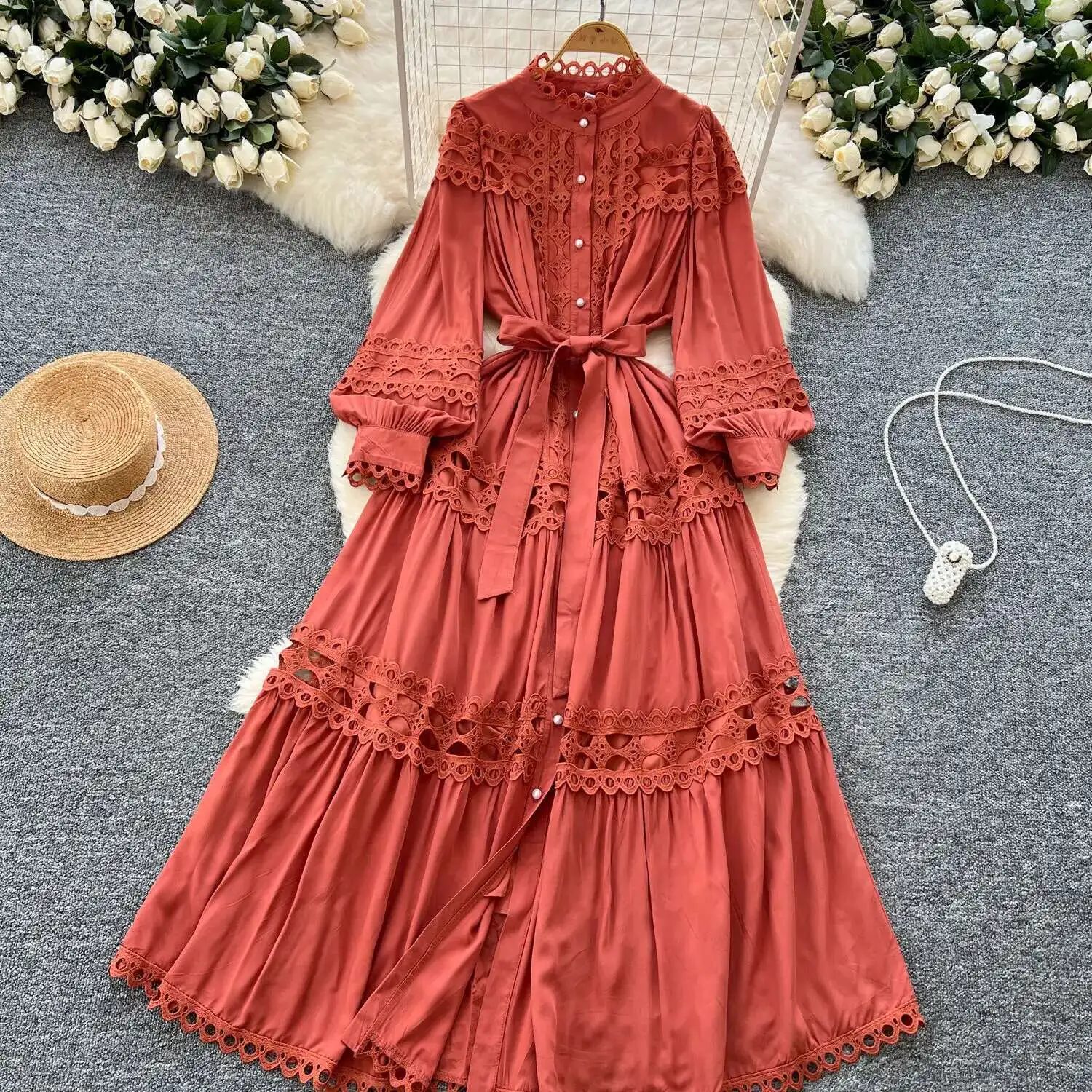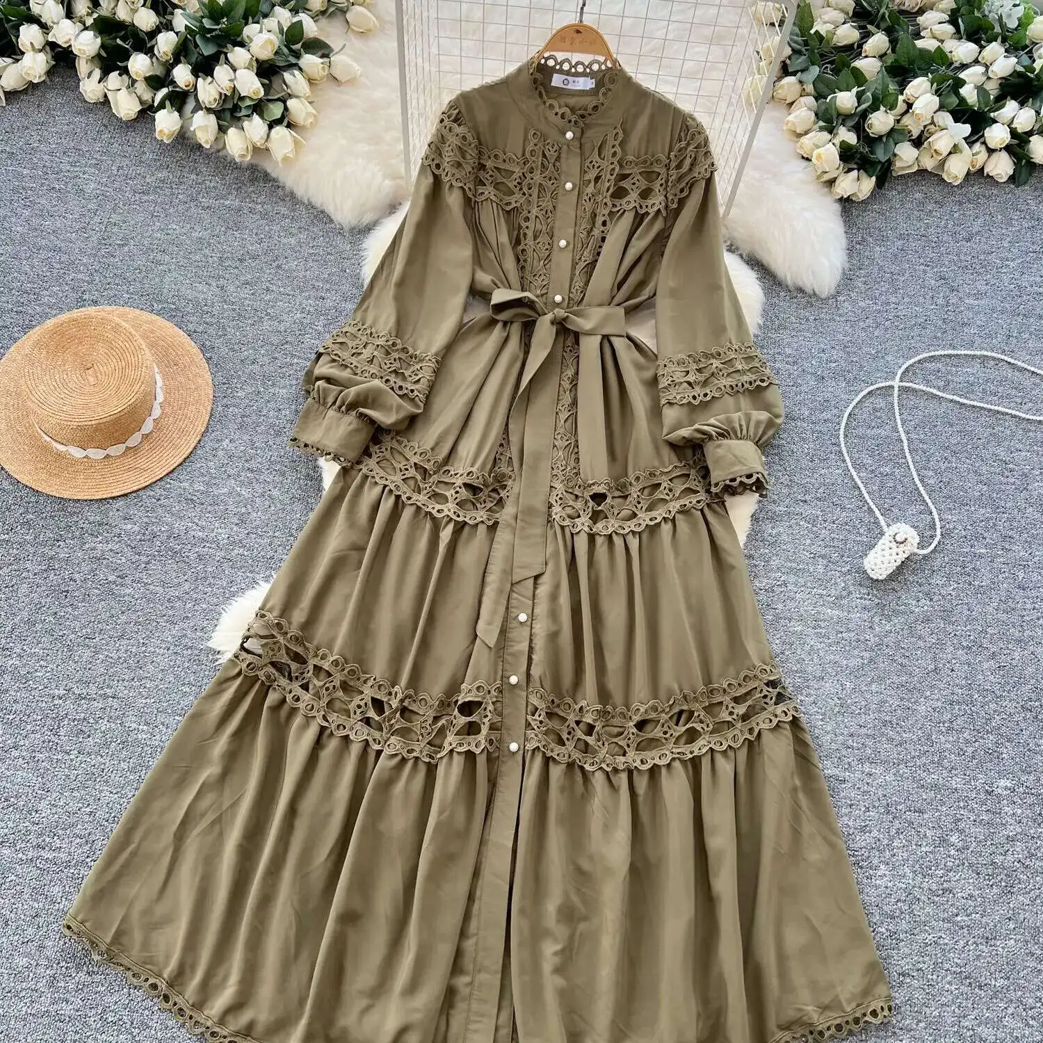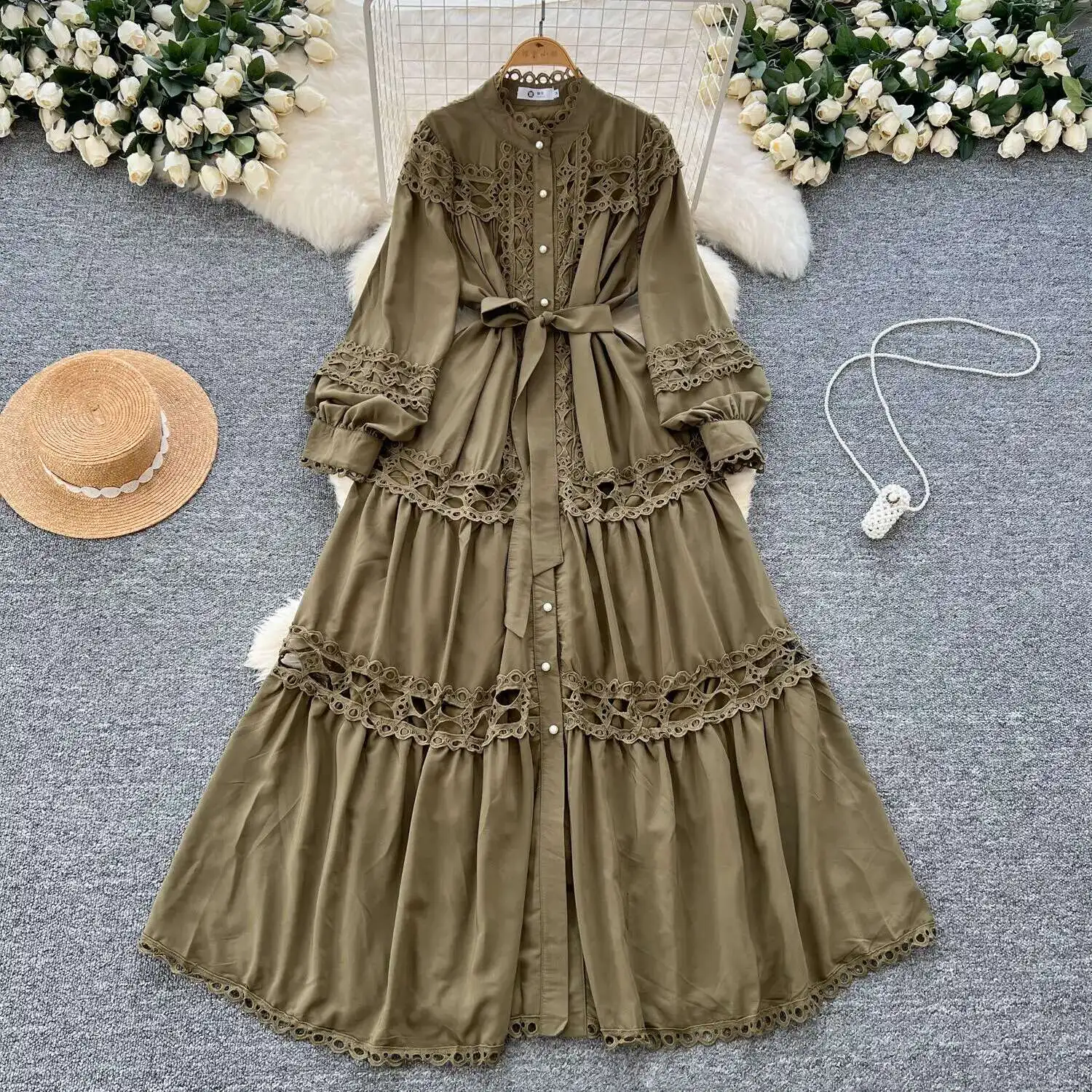 أنيقة طويلة ماكسي الجوف خارج فستان قميص المرأة الصيف الخريف قصر الرجعية زر اللؤلؤ التطريز الكروشيه مساء فساتين الحفلات