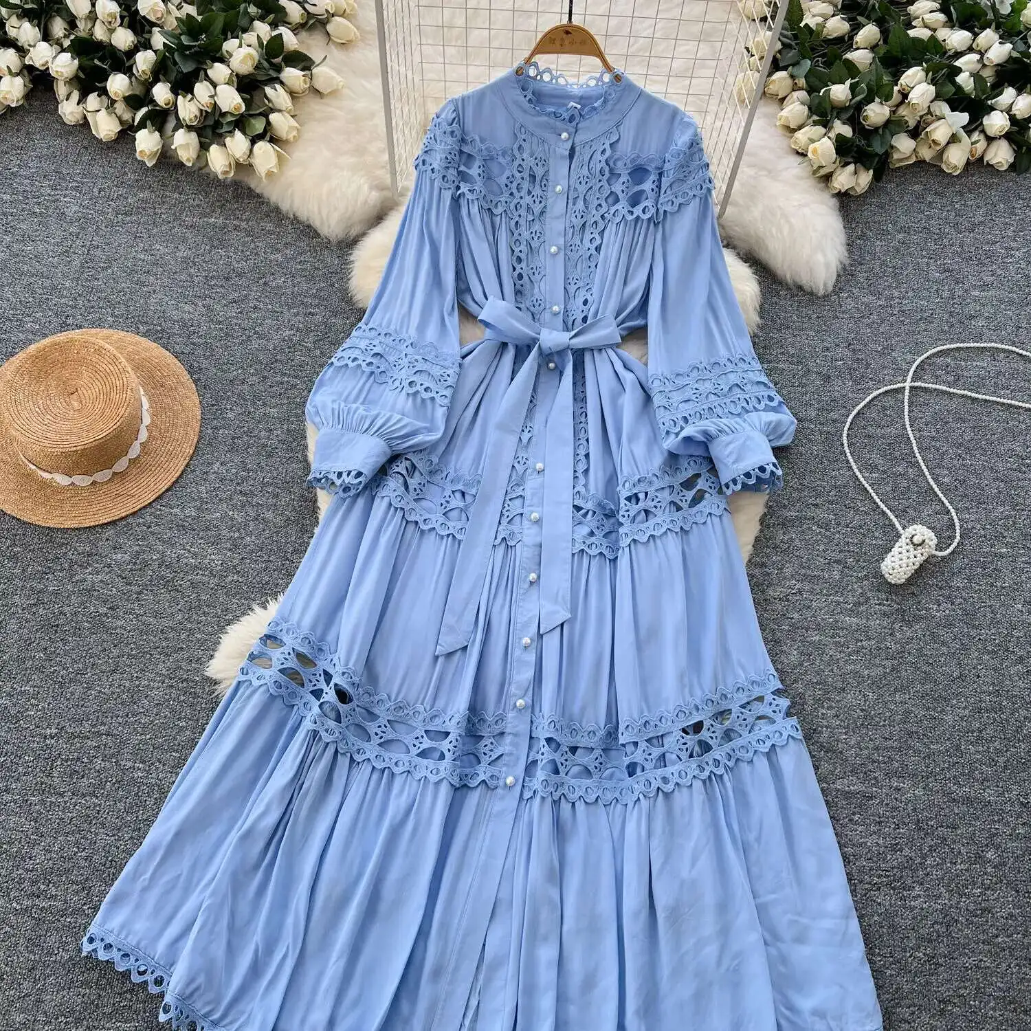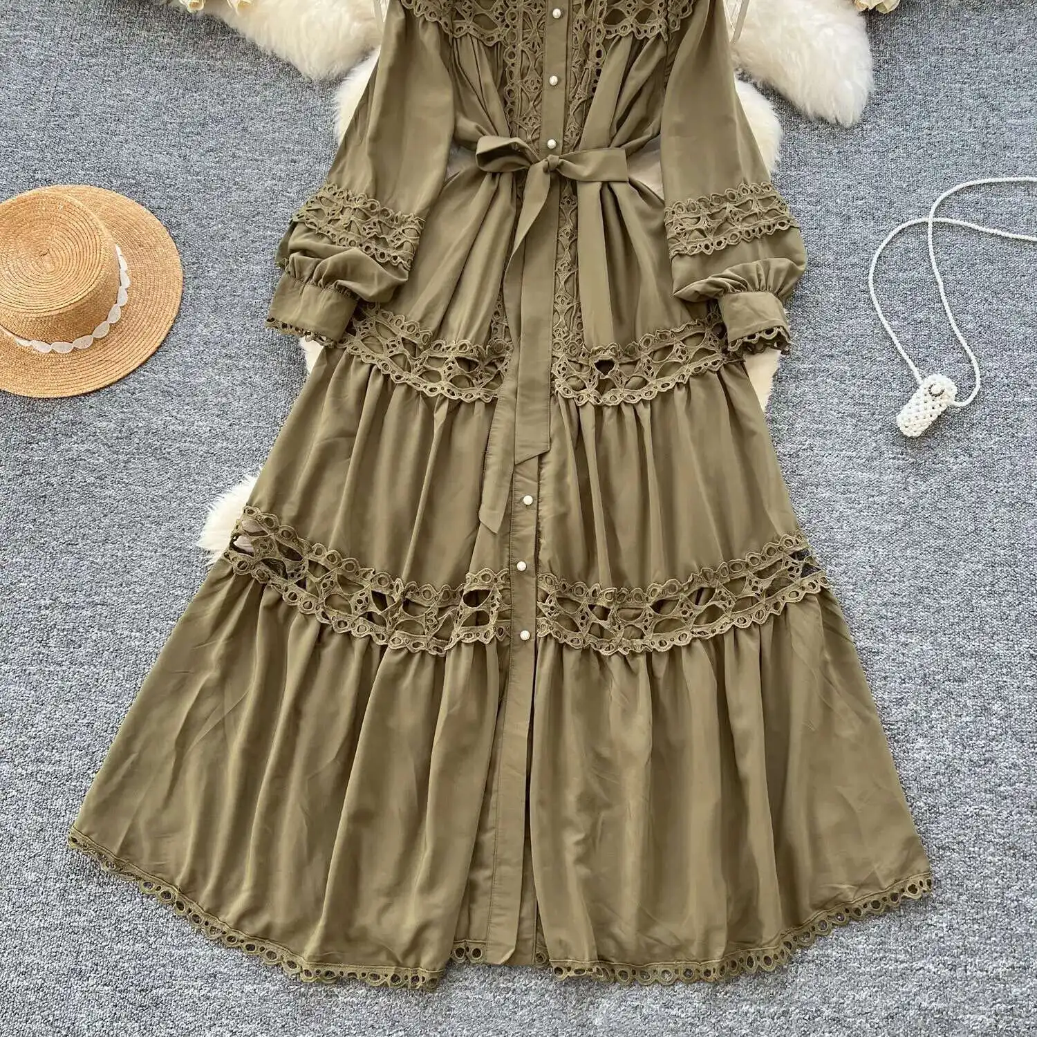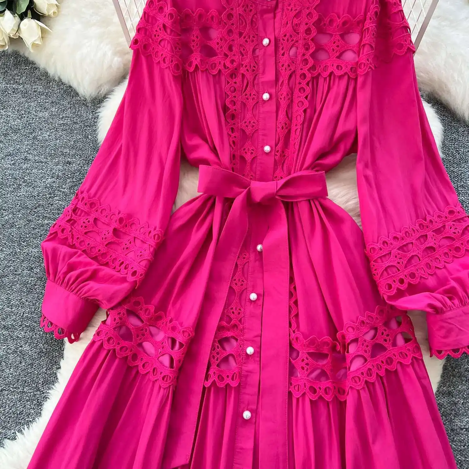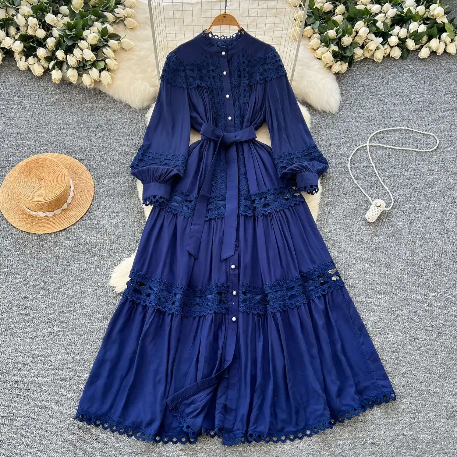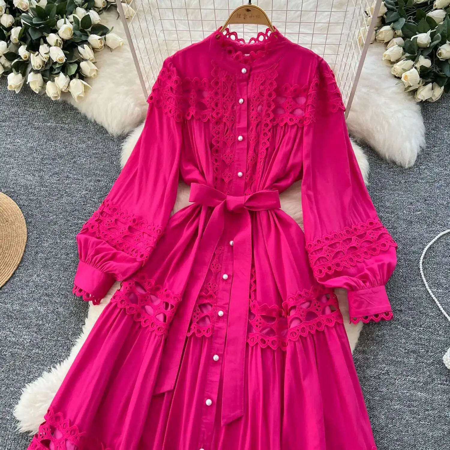 أنيقة طويلة ماكسي الجوف خارج فستان قميص المرأة الصيف الخريف قصر الرجعية زر اللؤلؤ التطريز الكروشيه مساء فساتين الحفلات