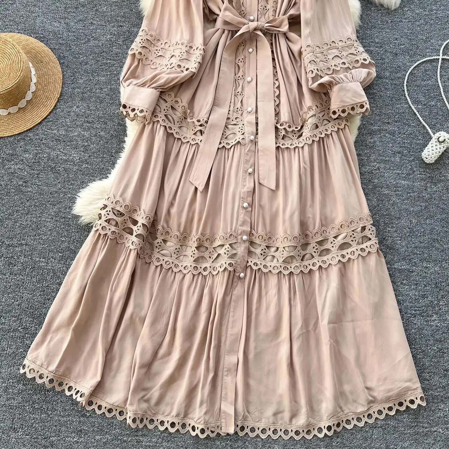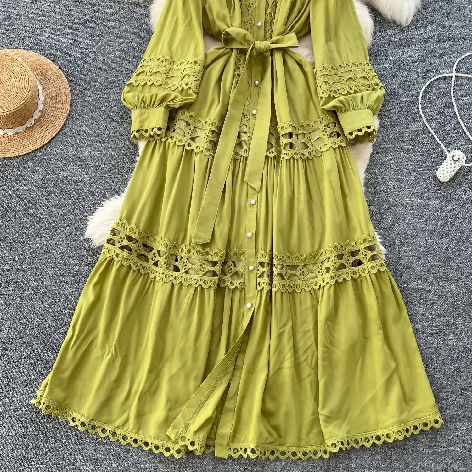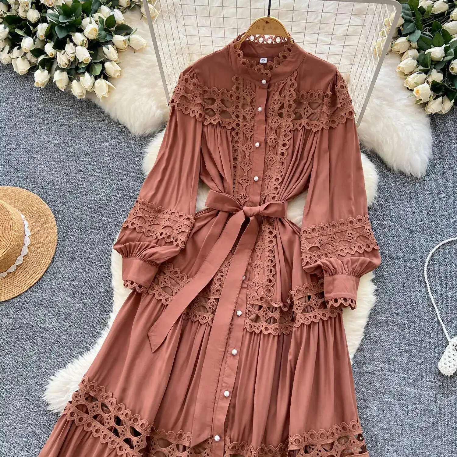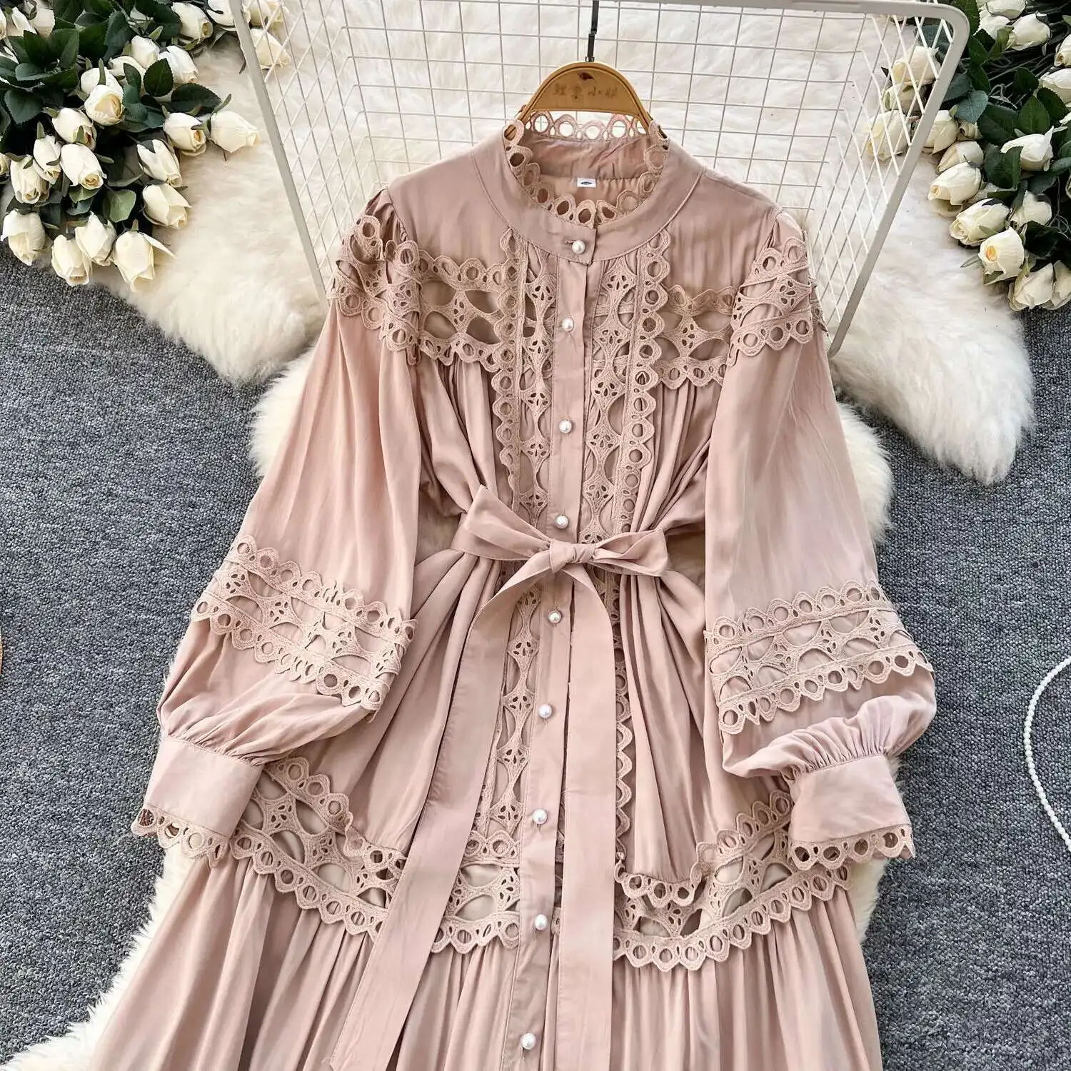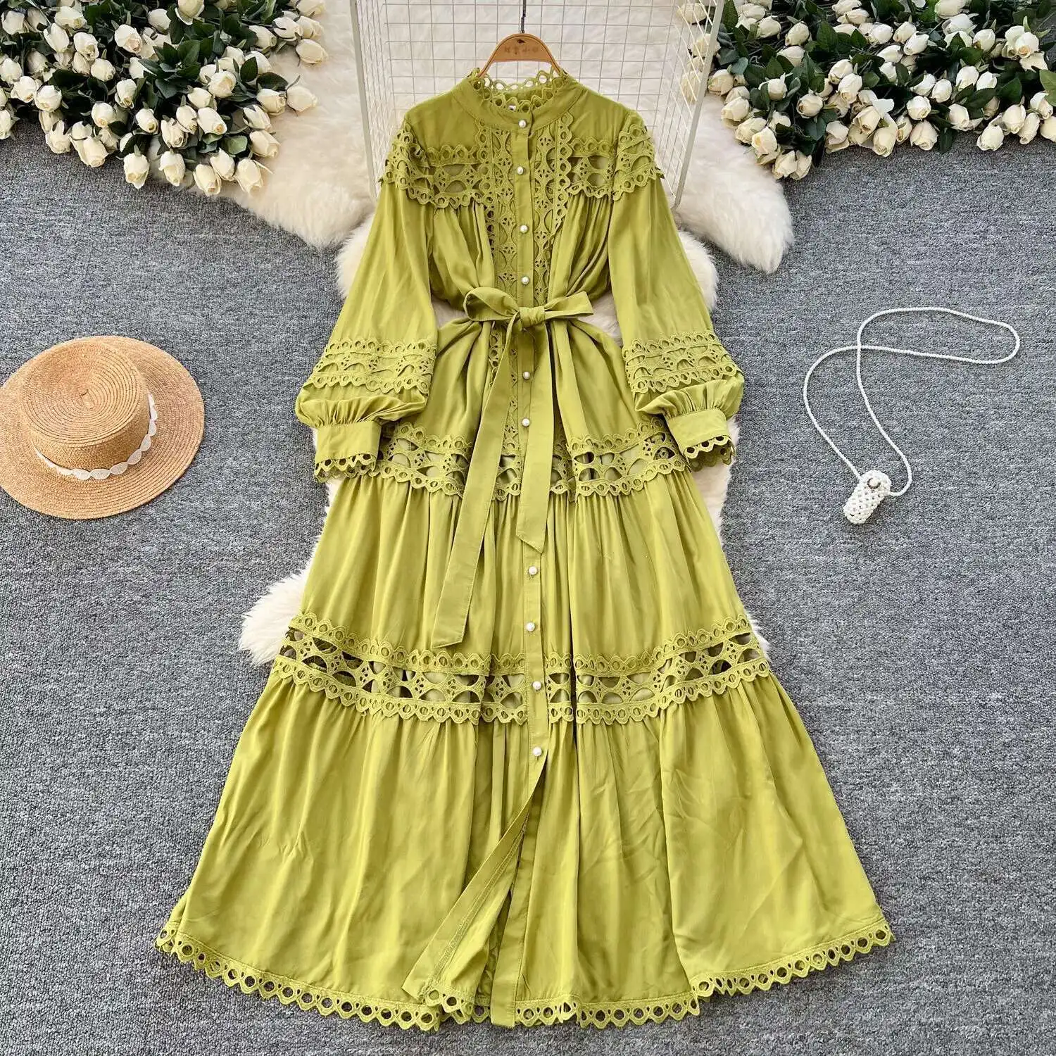 أنيقة طويلة ماكسي الجوف خارج فستان قميص المرأة الصيف الخريف قصر الرجعية زر اللؤلؤ التطريز الكروشيه مساء فساتين الحفلات