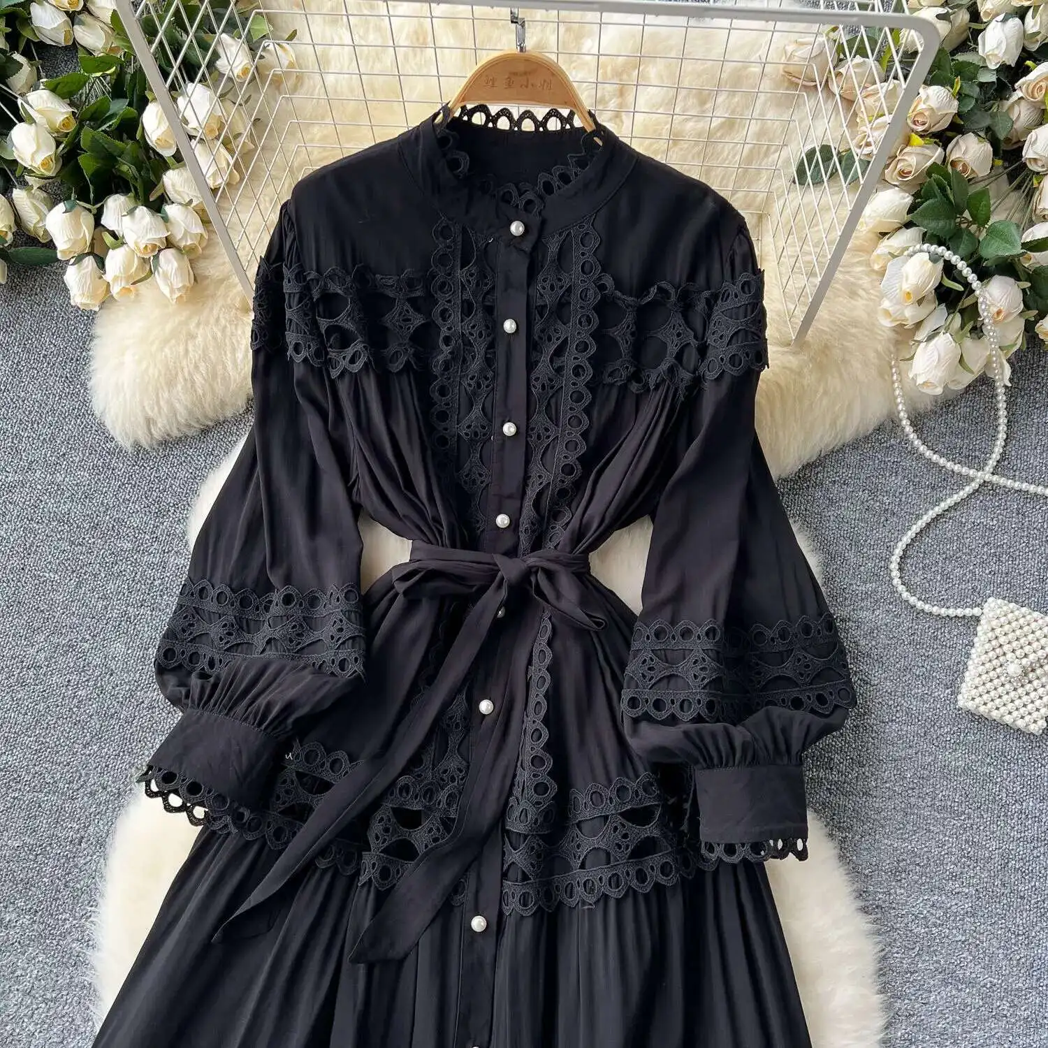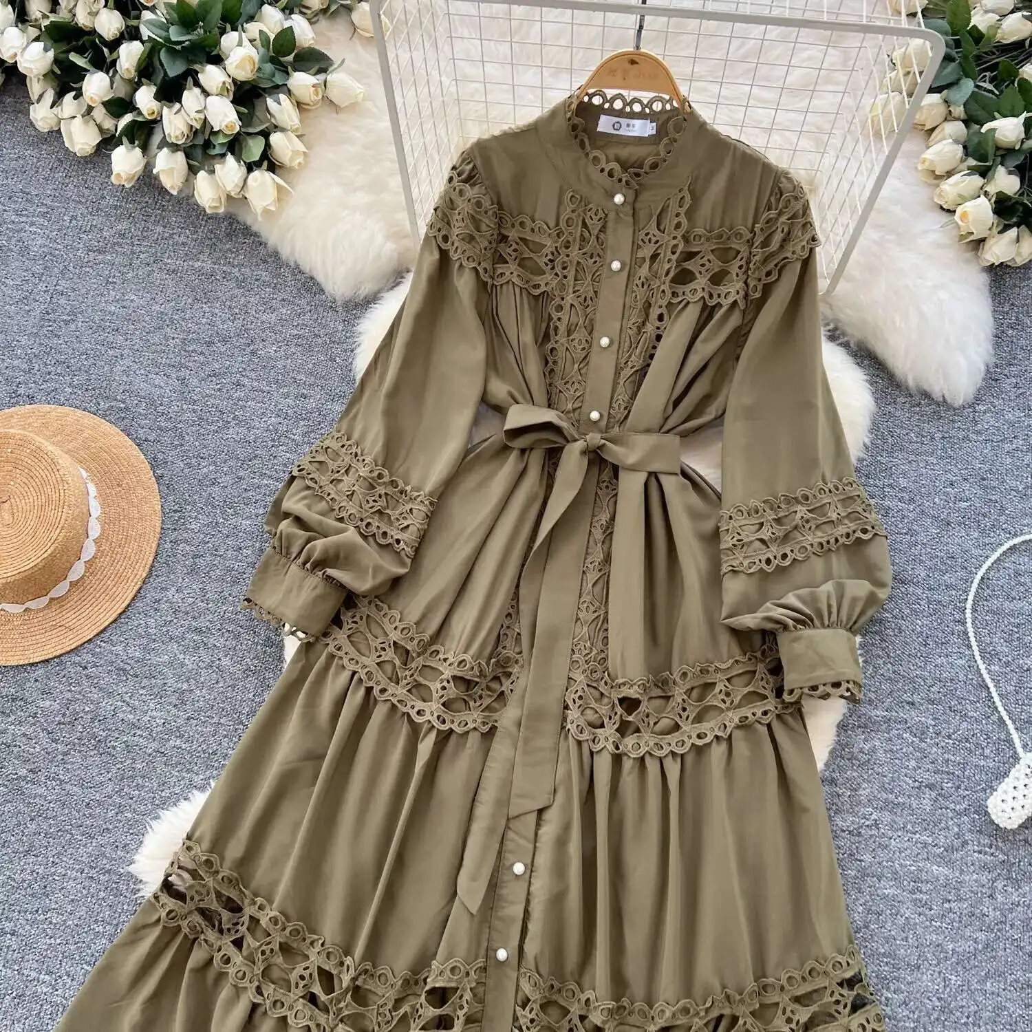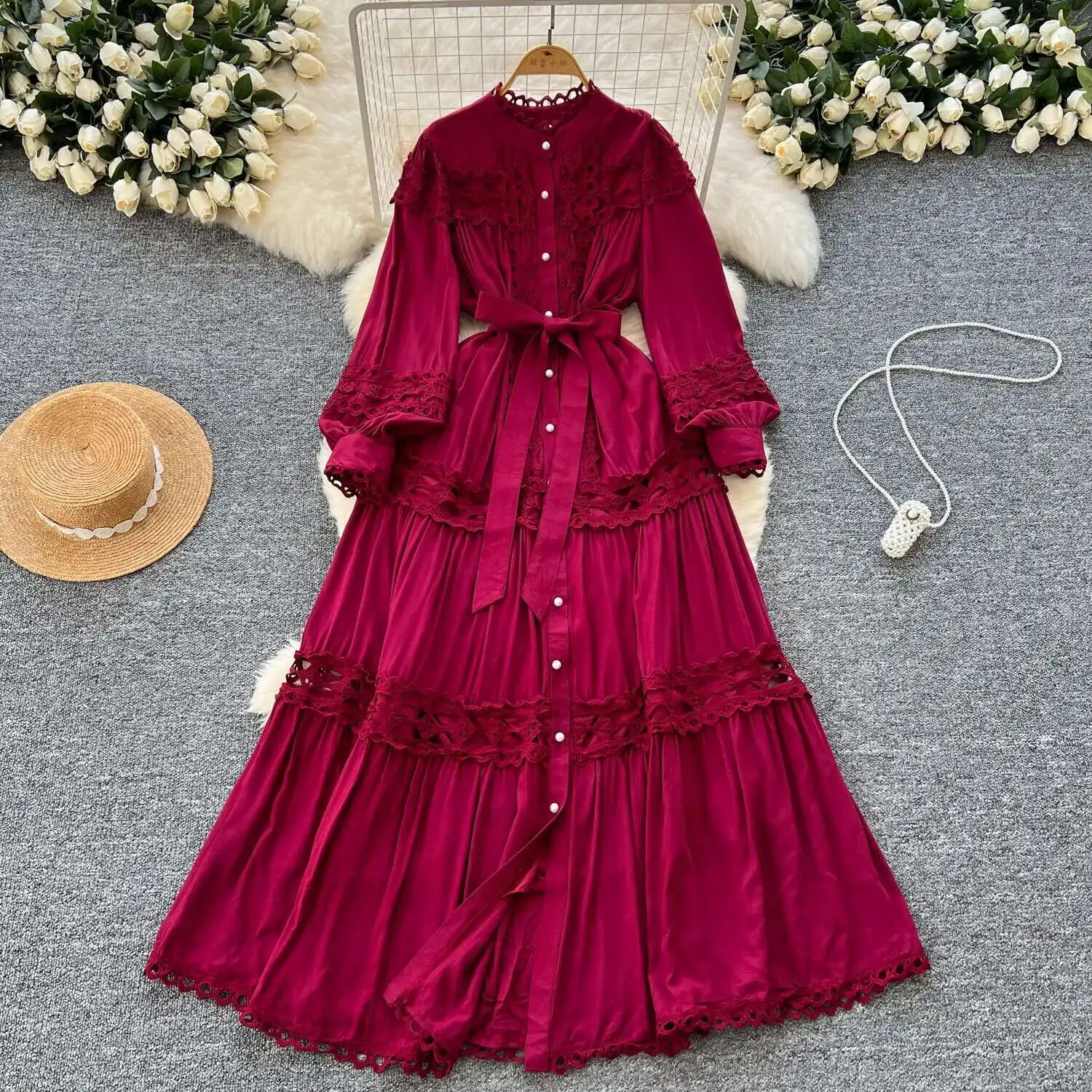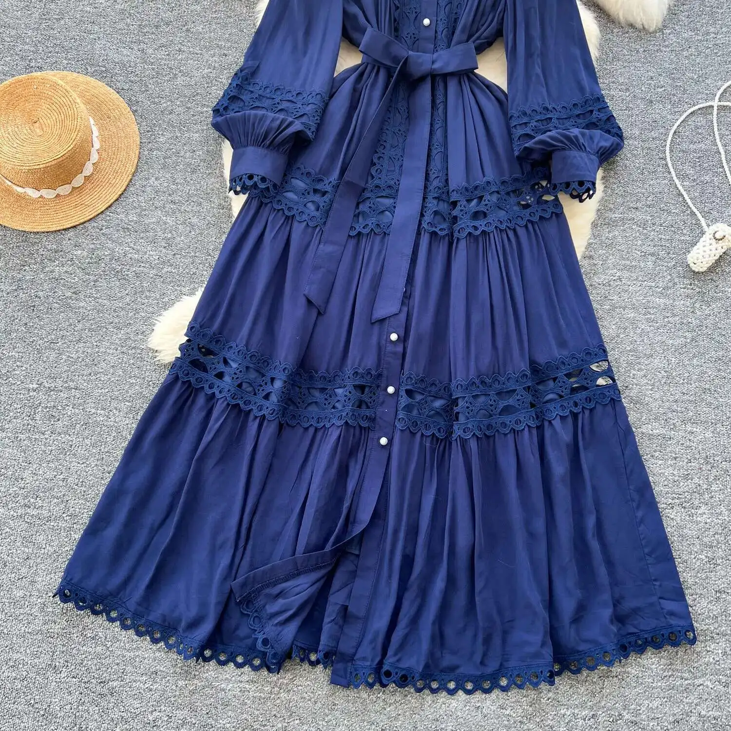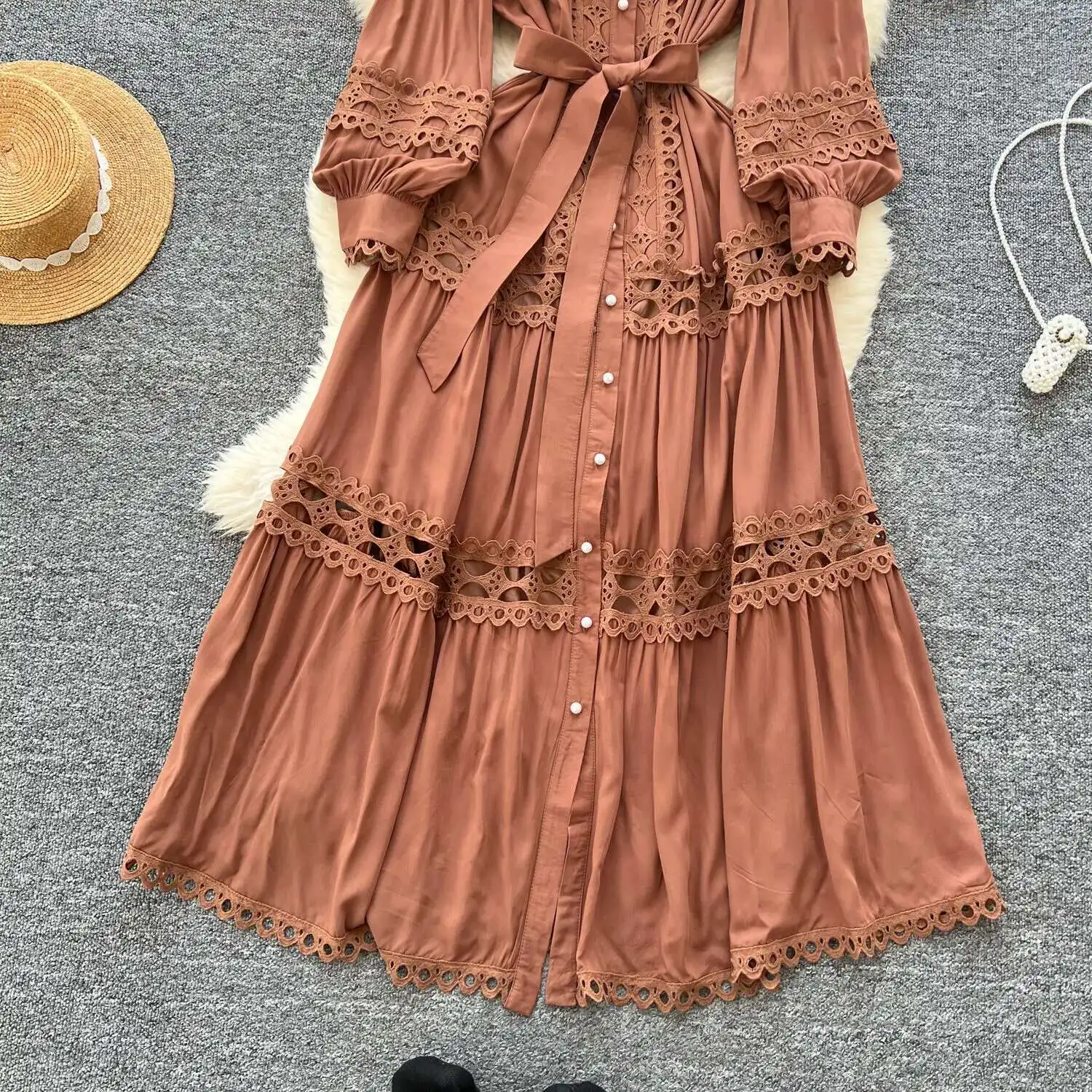أنيقة طويلة ماكسي الجوف خارج فستان قميص المرأة الصيف الخريف قصر الرجعية زر اللؤلؤ التطريز الكروشيه مساء فساتين الحفلات