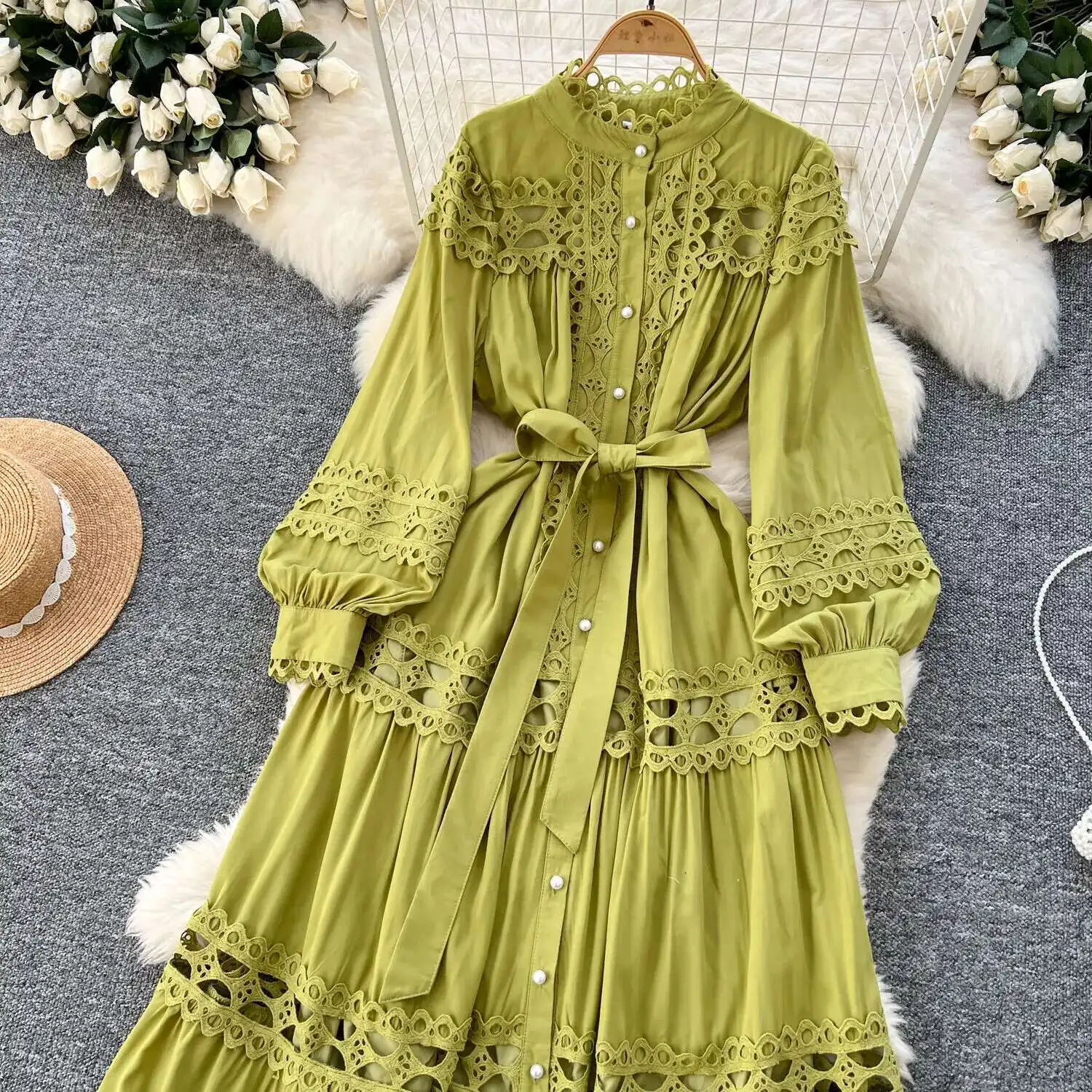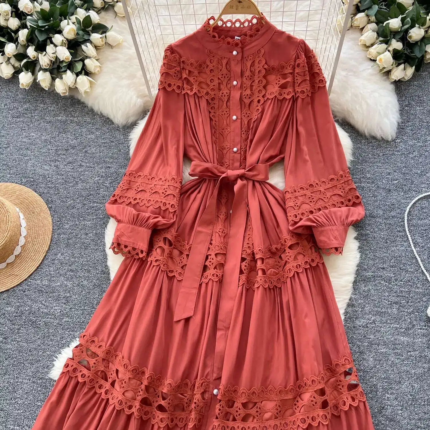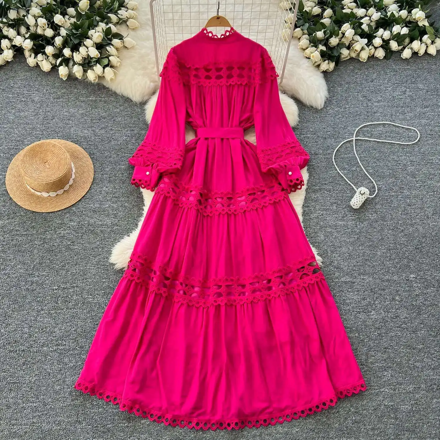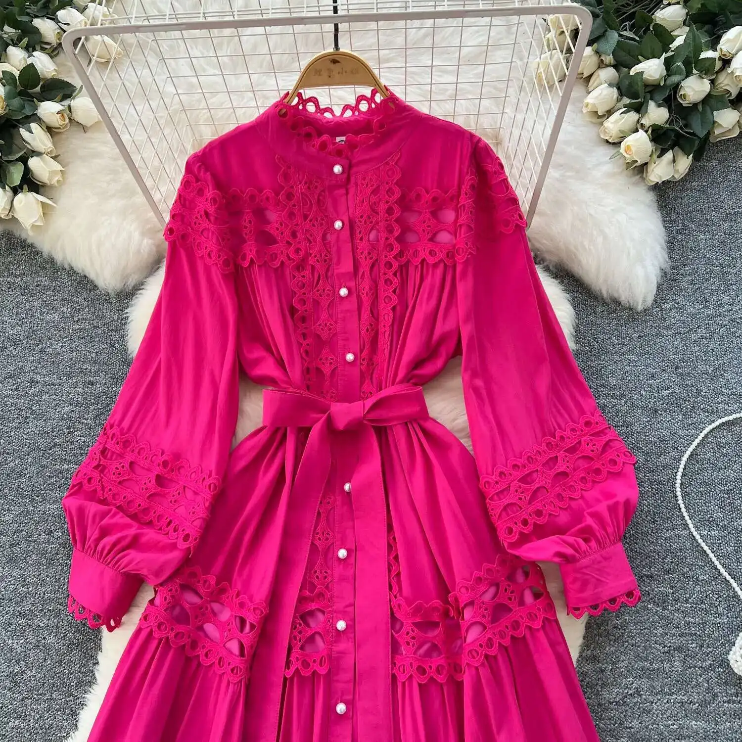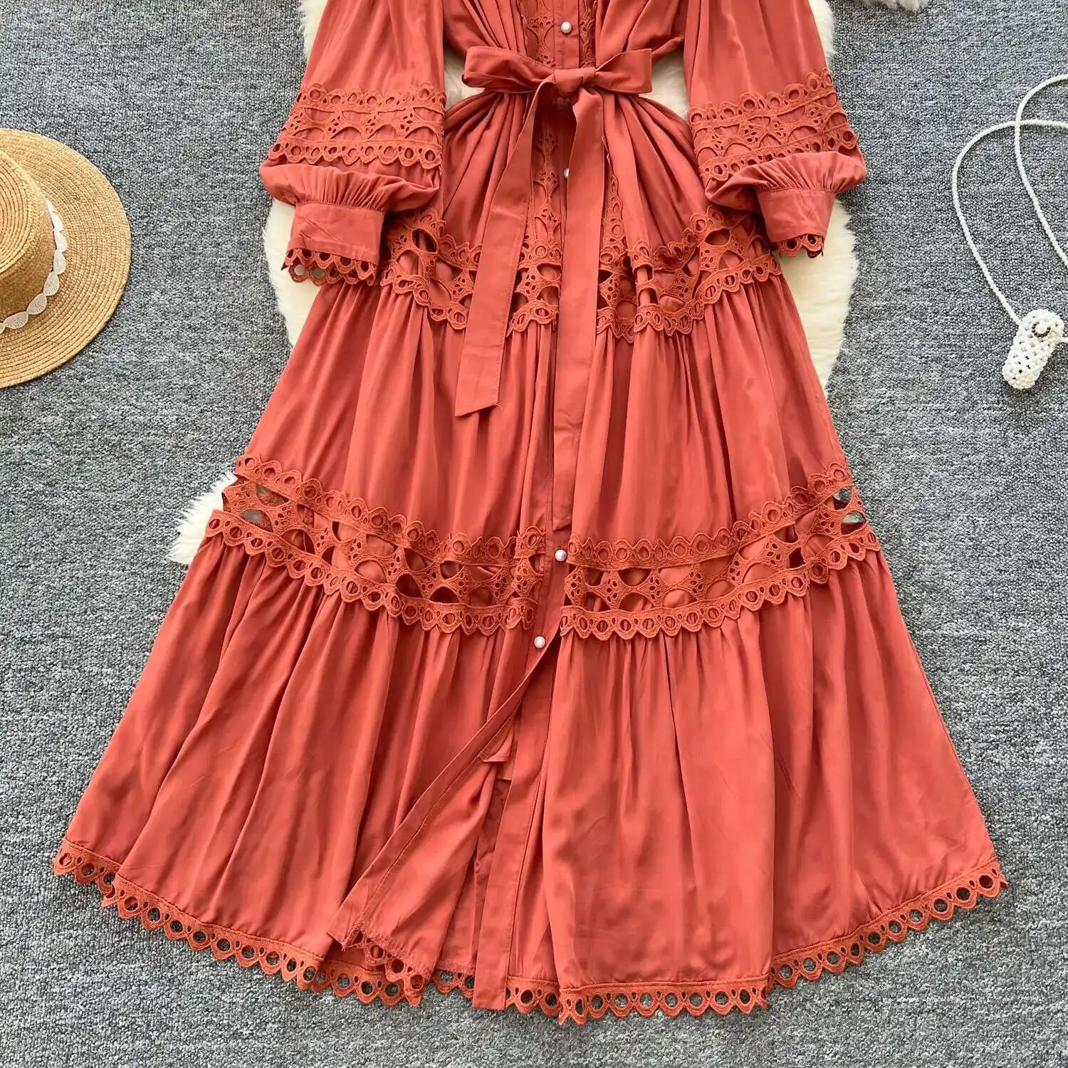 أنيقة طويلة ماكسي الجوف خارج فستان قميص المرأة الصيف الخريف قصر الرجعية زر اللؤلؤ التطريز الكروشيه مساء فساتين الحفلات