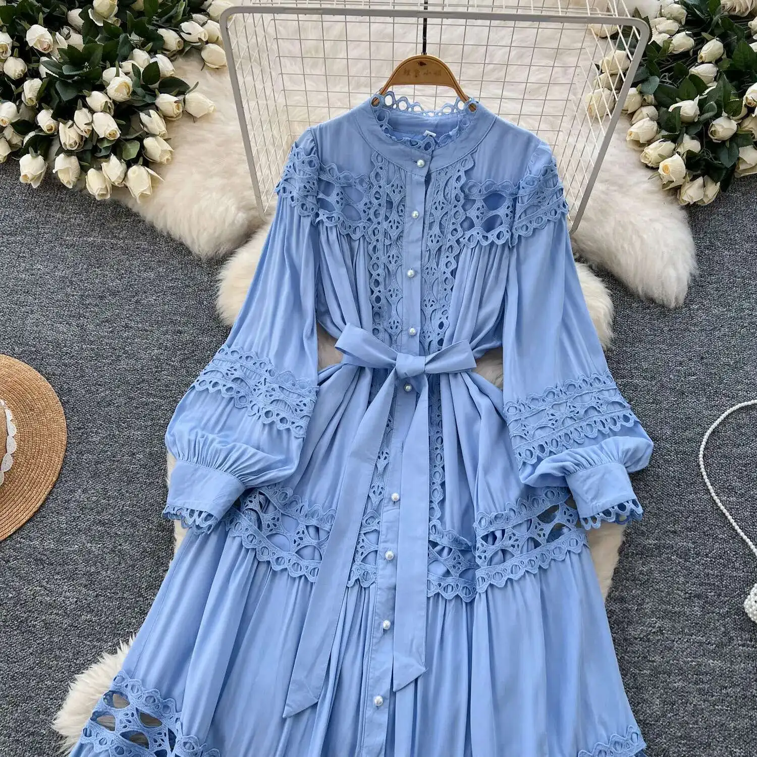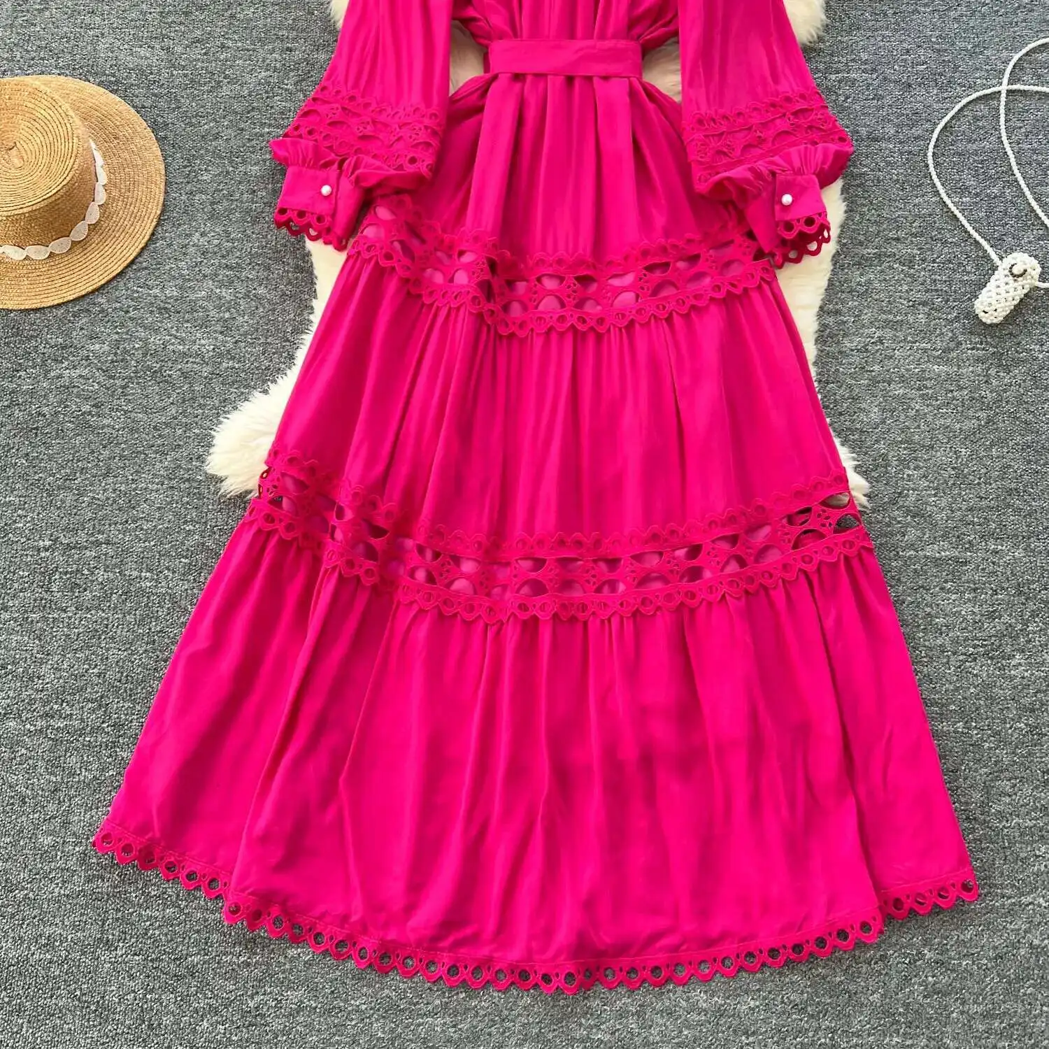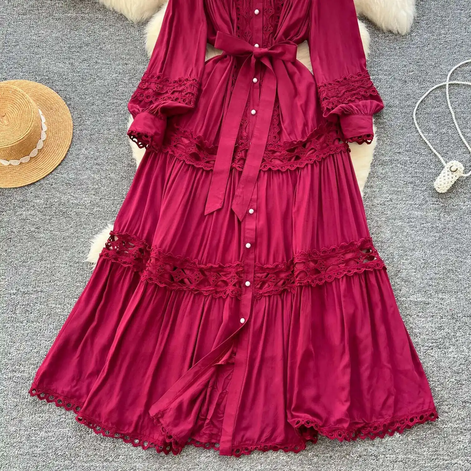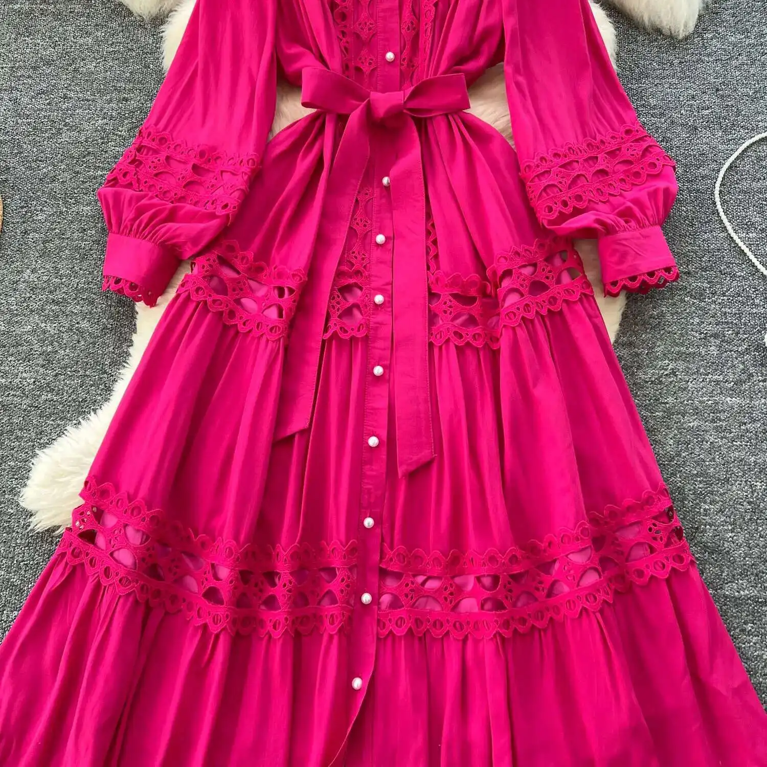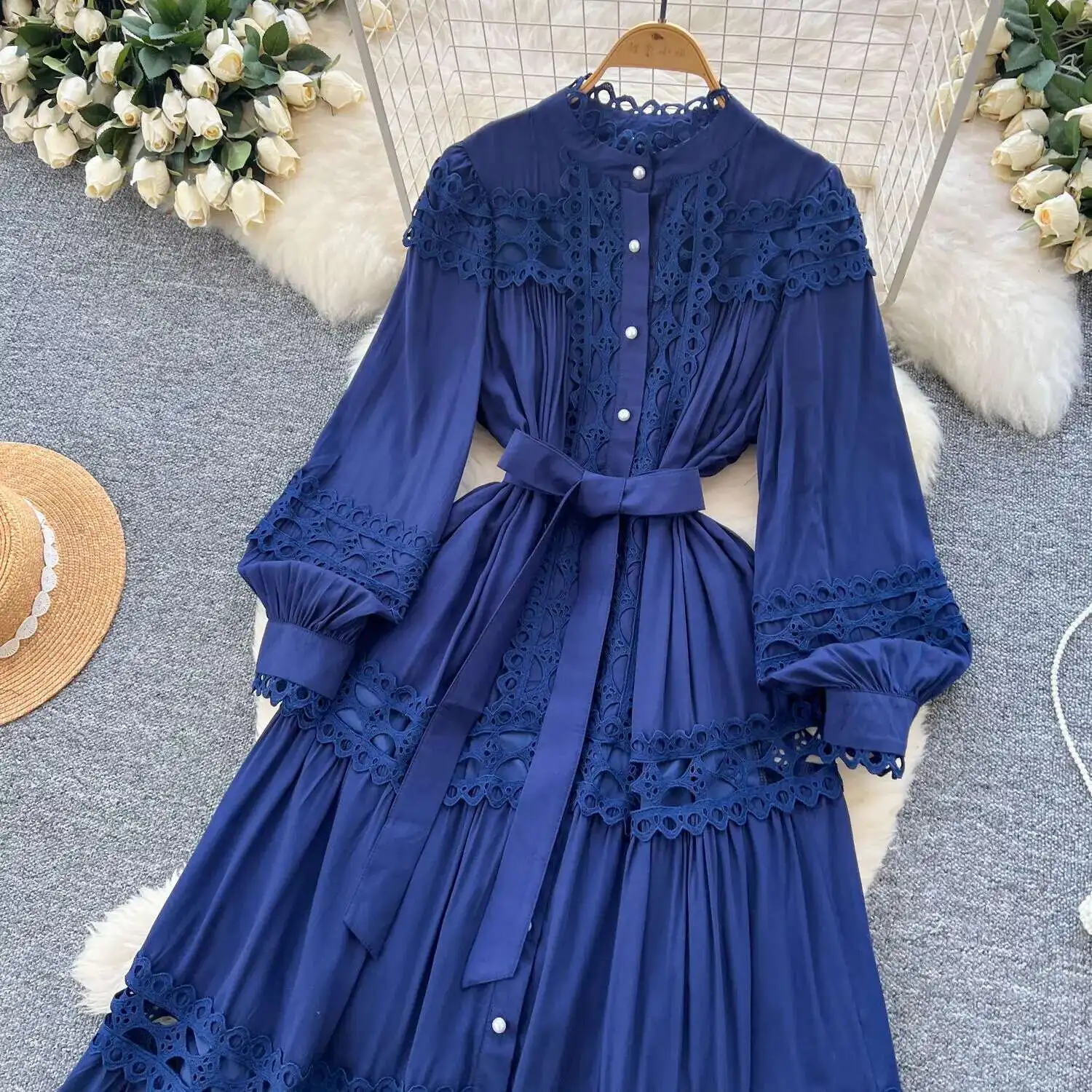 أنيقة طويلة ماكسي الجوف خارج فستان قميص المرأة الصيف الخريف قصر الرجعية زر اللؤلؤ التطريز الكروشيه مساء فساتين الحفلات