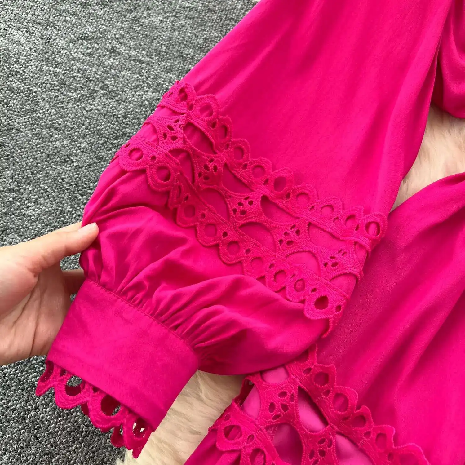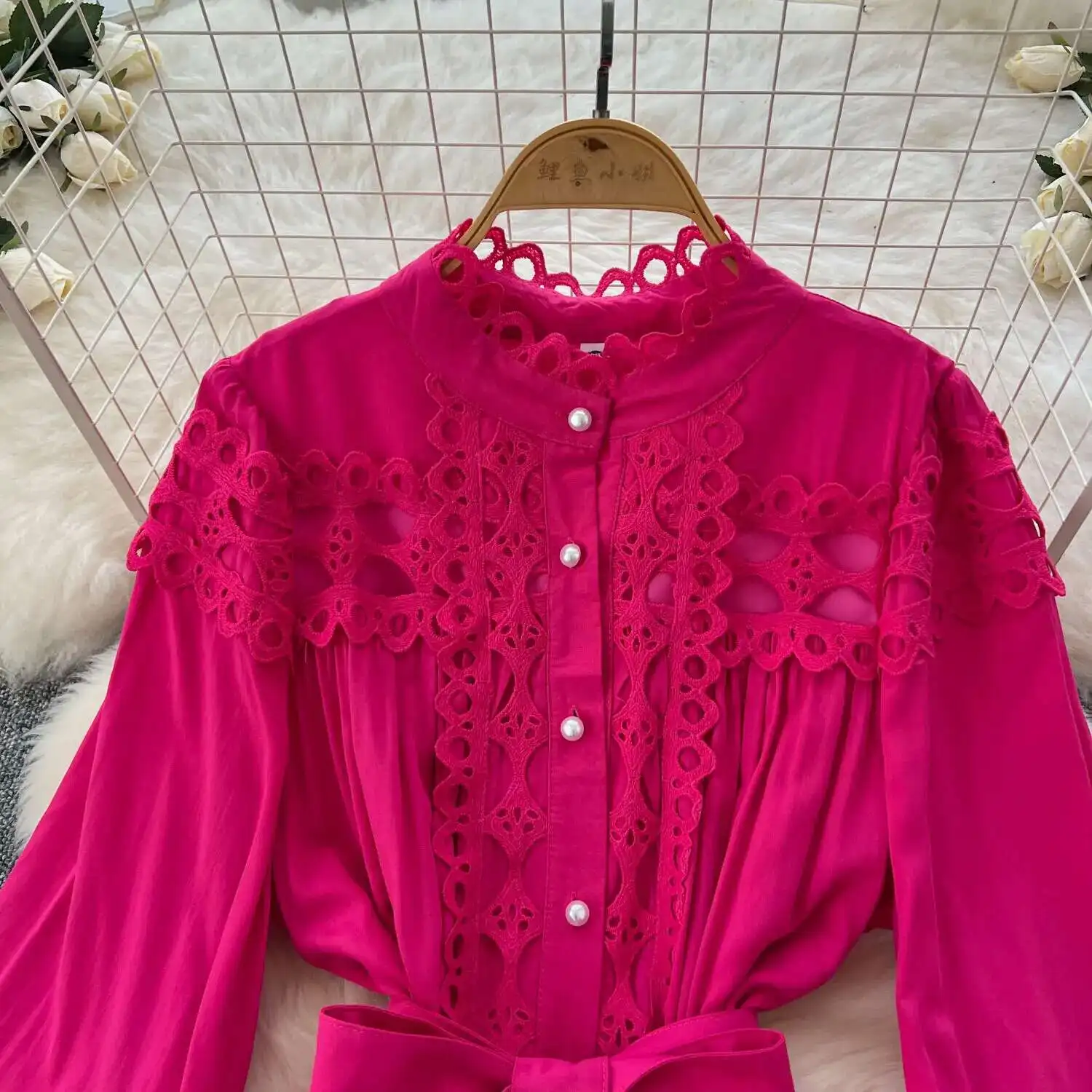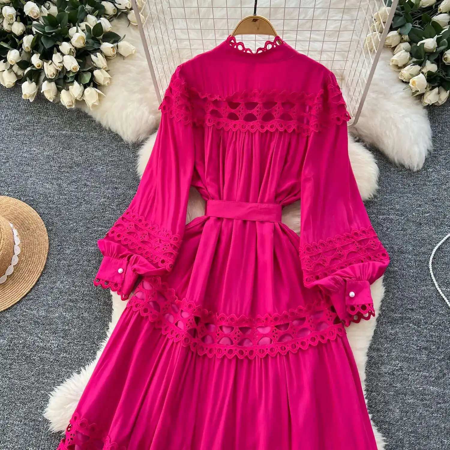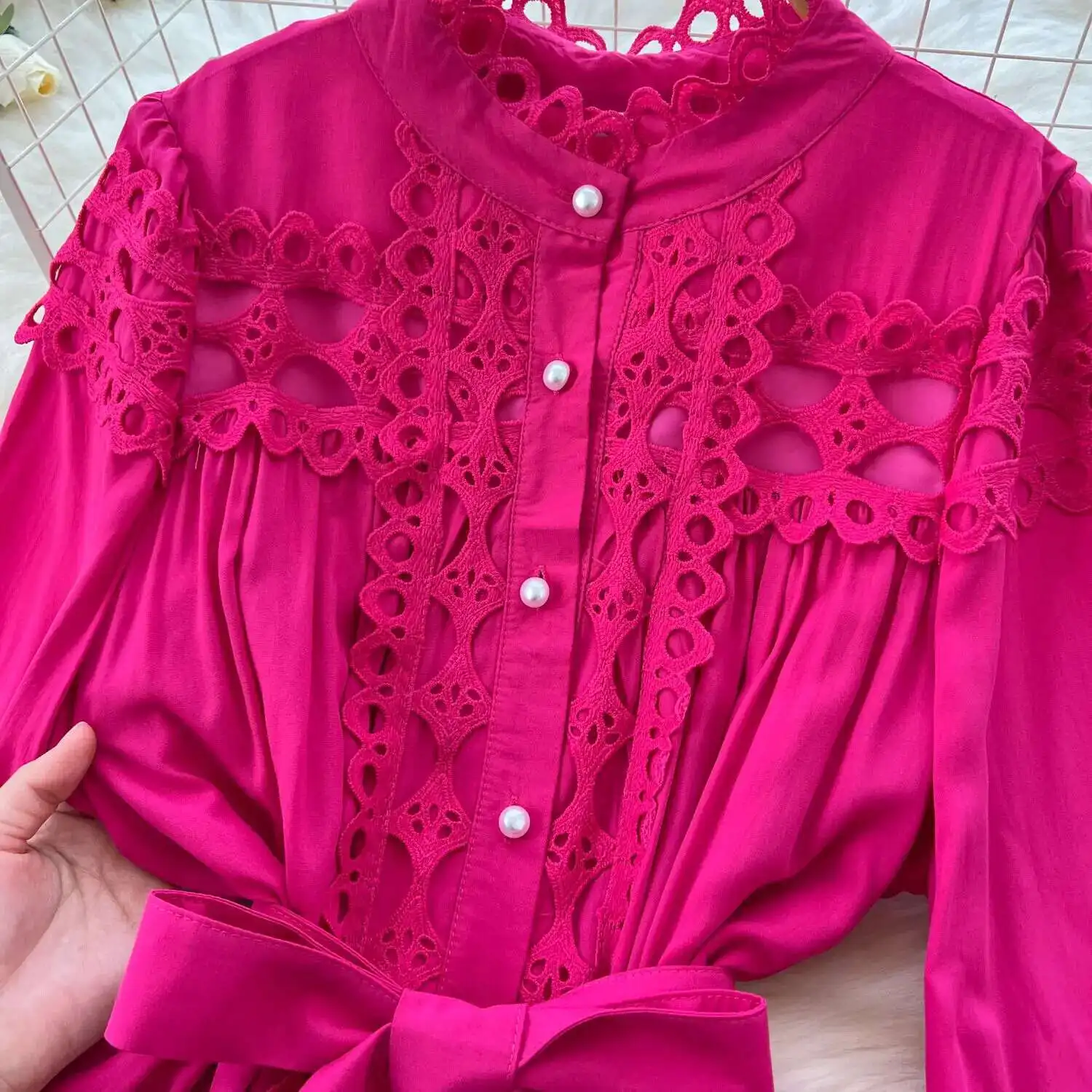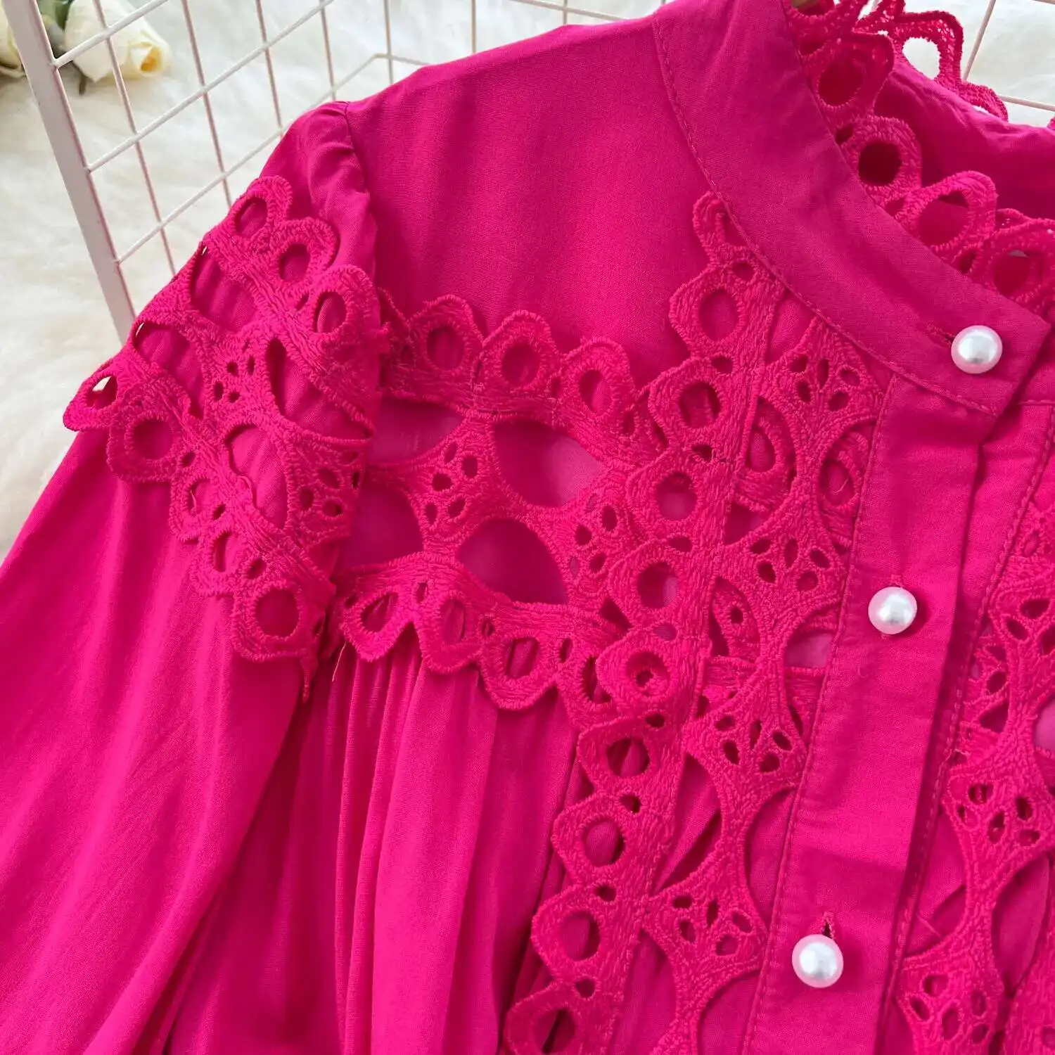 أنيقة طويلة ماكسي الجوف خارج فستان قميص المرأة الصيف الخريف قصر الرجعية زر اللؤلؤ التطريز الكروشيه مساء فساتين الحفلات
