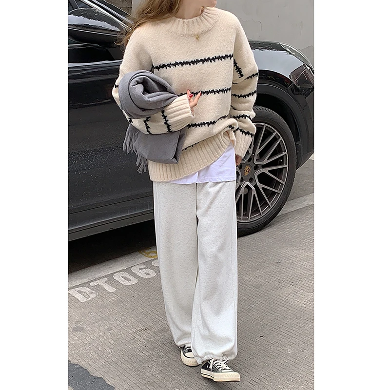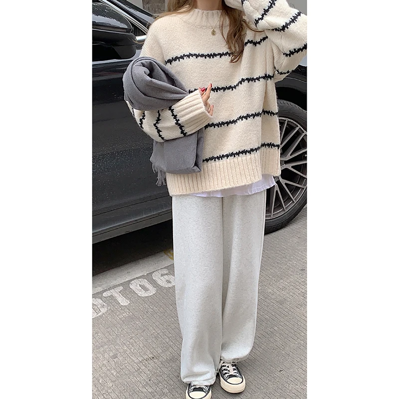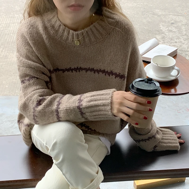 البيج شريط فضفاض سترة المرأة البلوز الشارع الشهير طويلة الأكمام محبوك القمم الإناث البلوز الخريف الشتاء فضفاض محبوك البلوزات