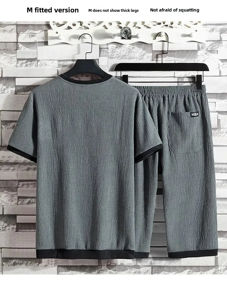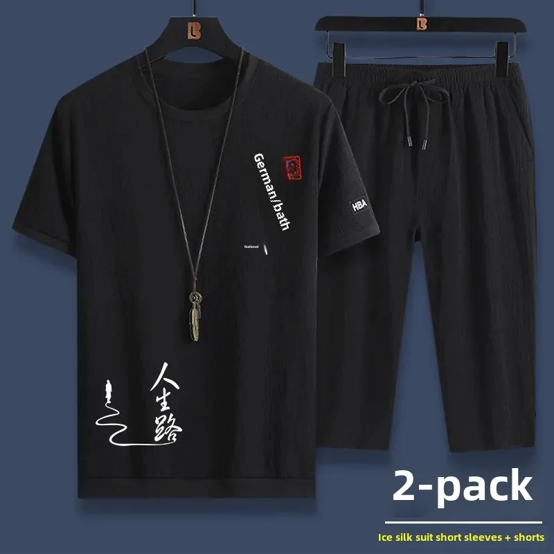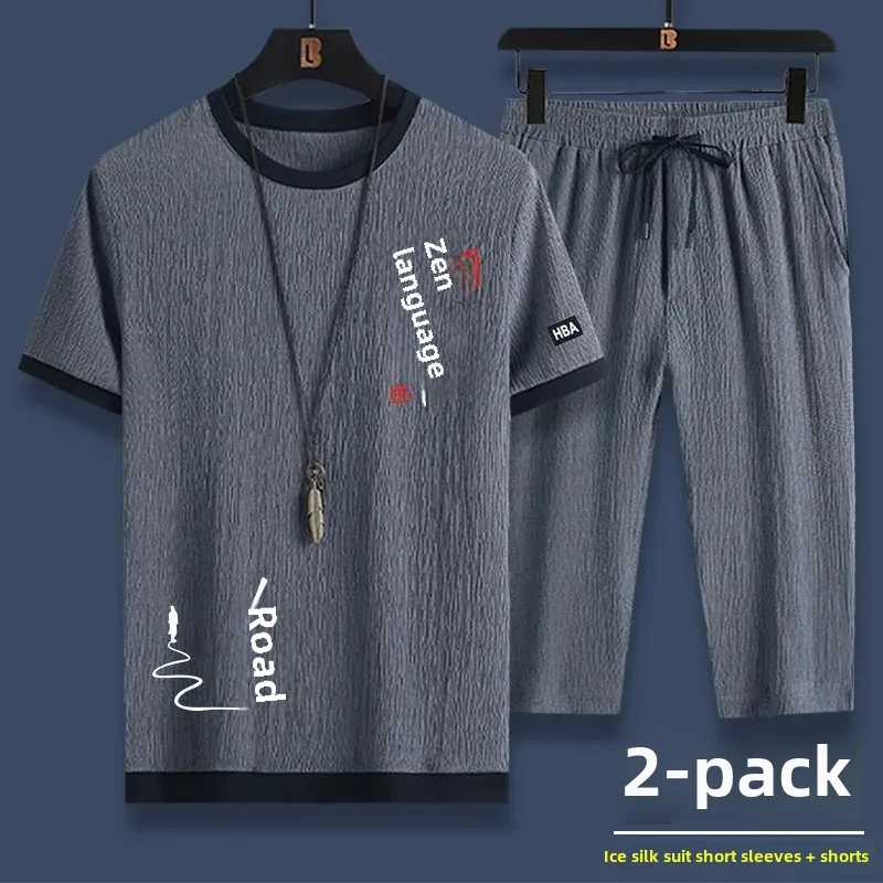 الحرير الجليد الصيف بدلة رياضية غير رسمية الرجال تي شيرتات قصيرة الاكمام مجموعة تي شيرتات قصيرة للأطفال المألوف قطعتين مجموعة للرجال مريحة للتنفس