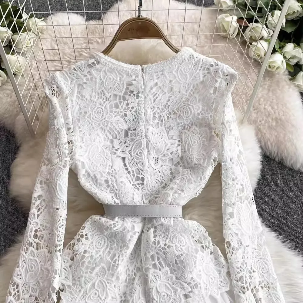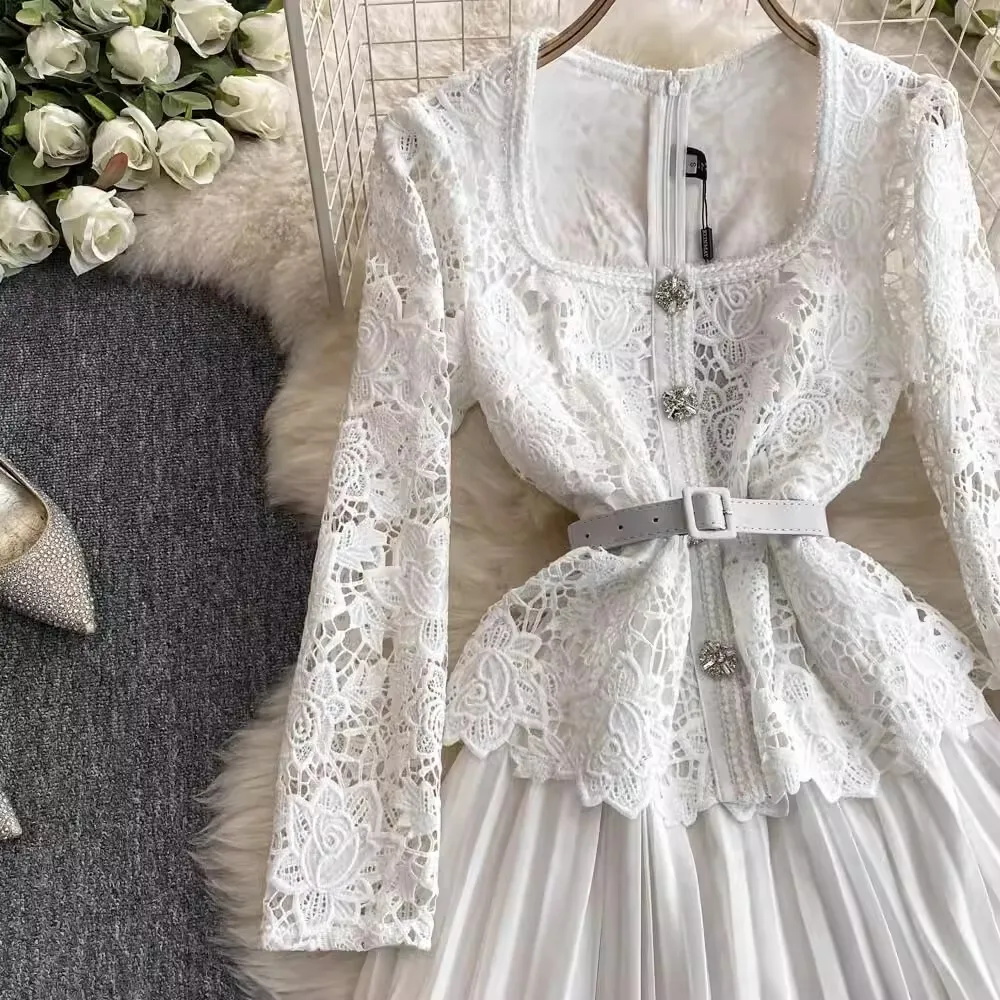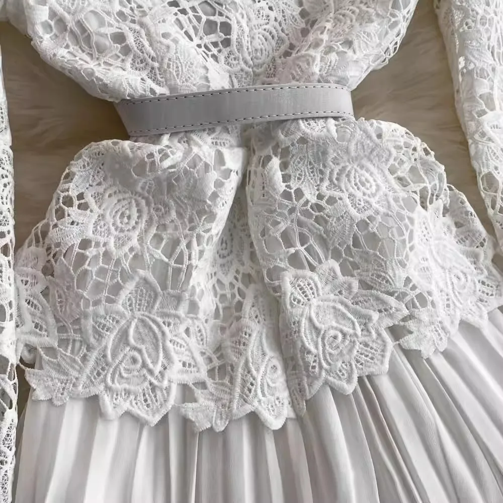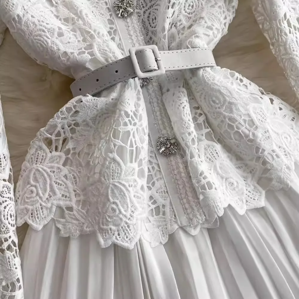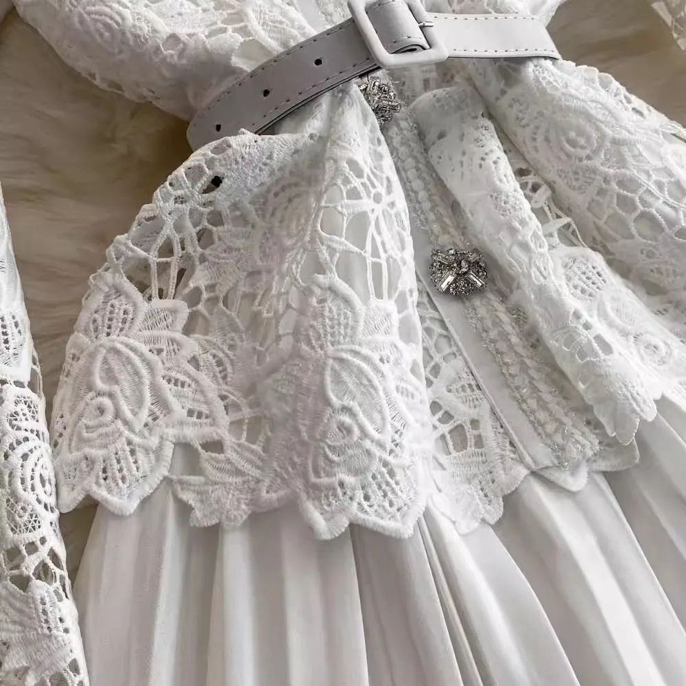 الخريف أنيقة الجوف خارج زهرة التطريز الأبيض الدانتيل فساتين الشيفون المرأة كريستال الماس حزام مطوي ماكسي فساتين الحفلات