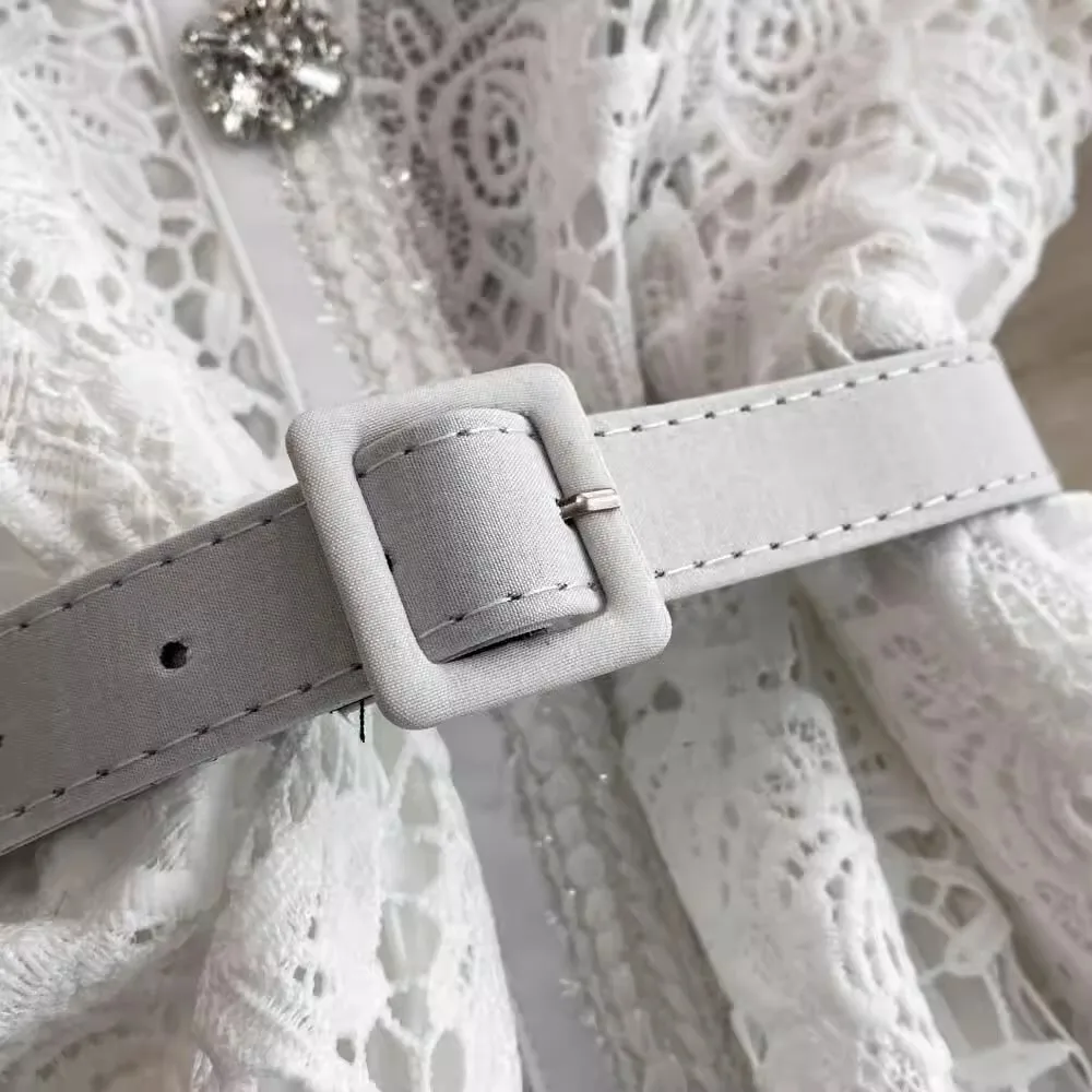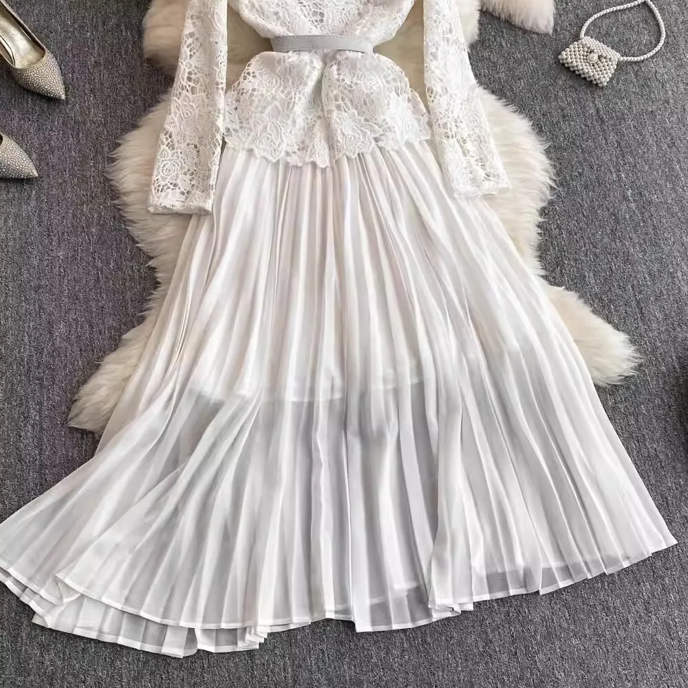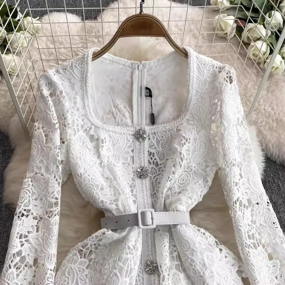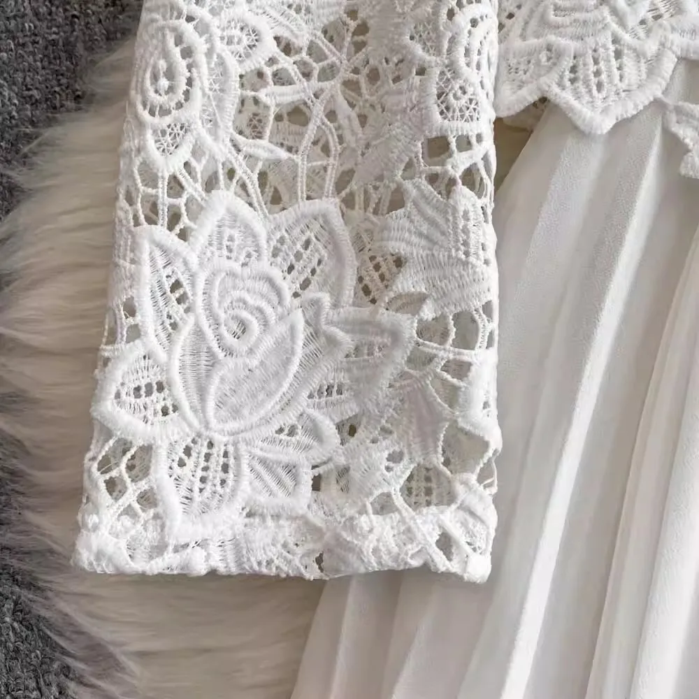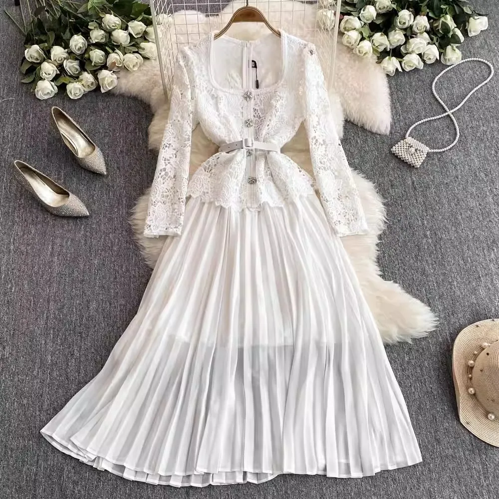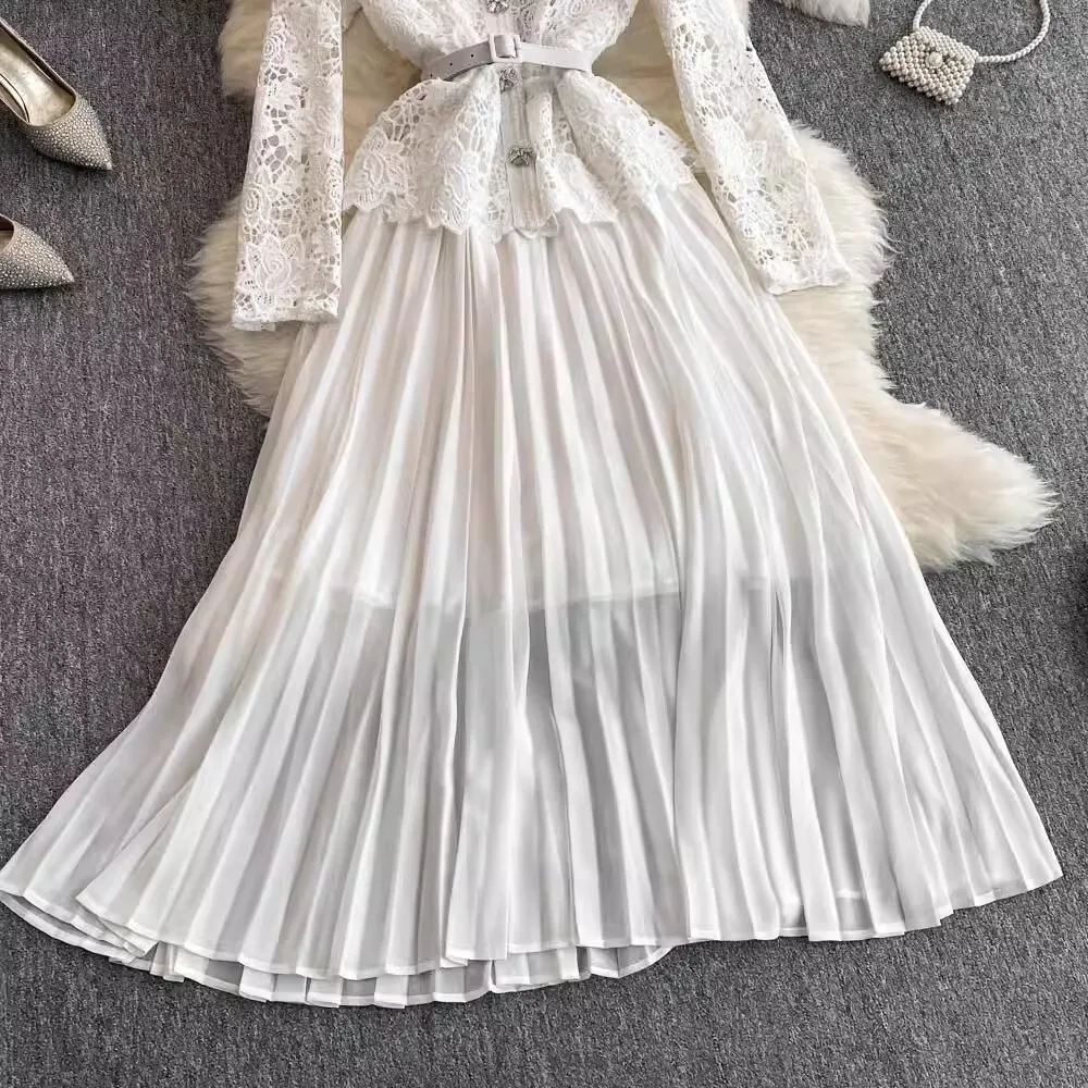 الخريف أنيقة الجوف خارج زهرة التطريز الأبيض الدانتيل فساتين الشيفون المرأة كريستال الماس حزام مطوي ماكسي فساتين الحفلات
