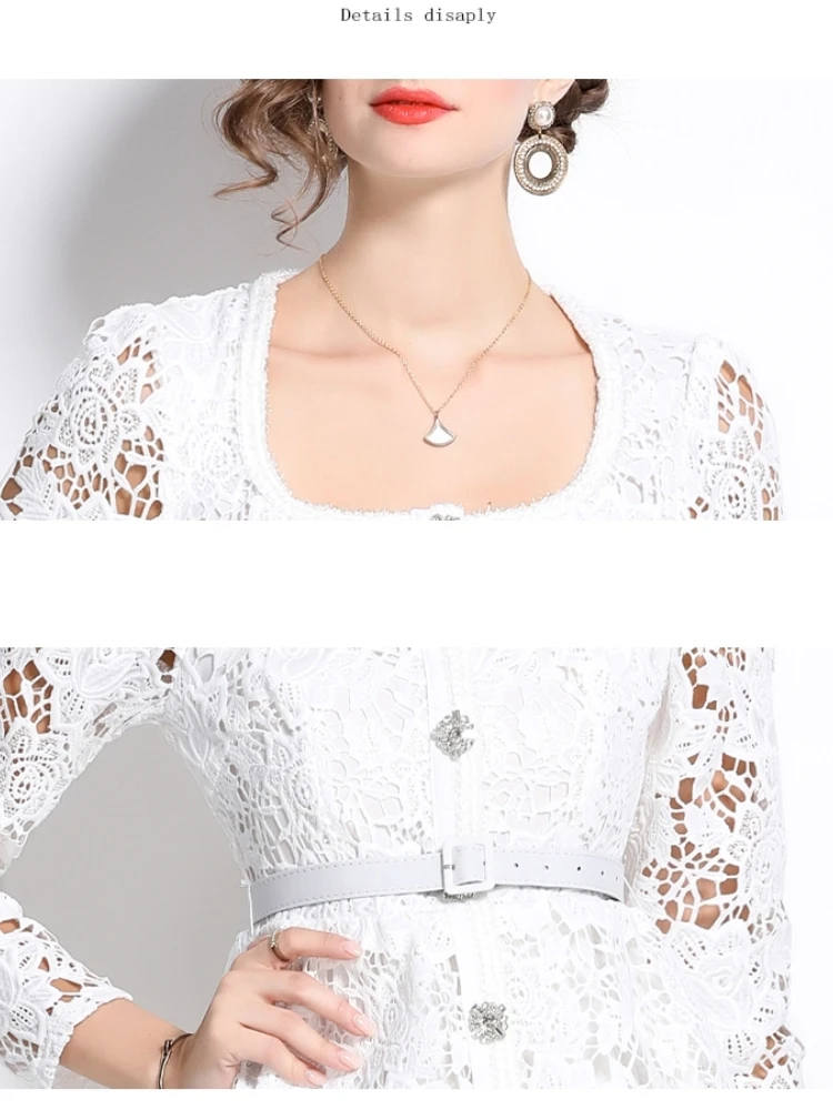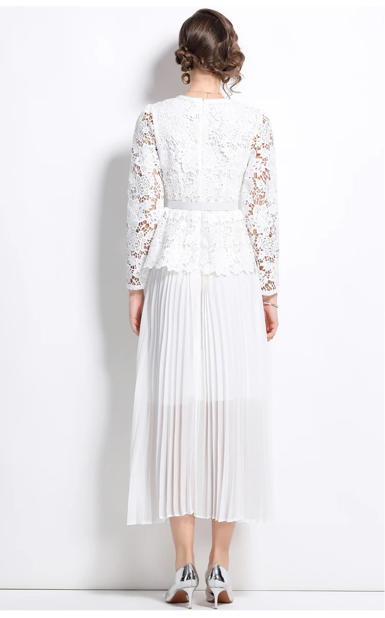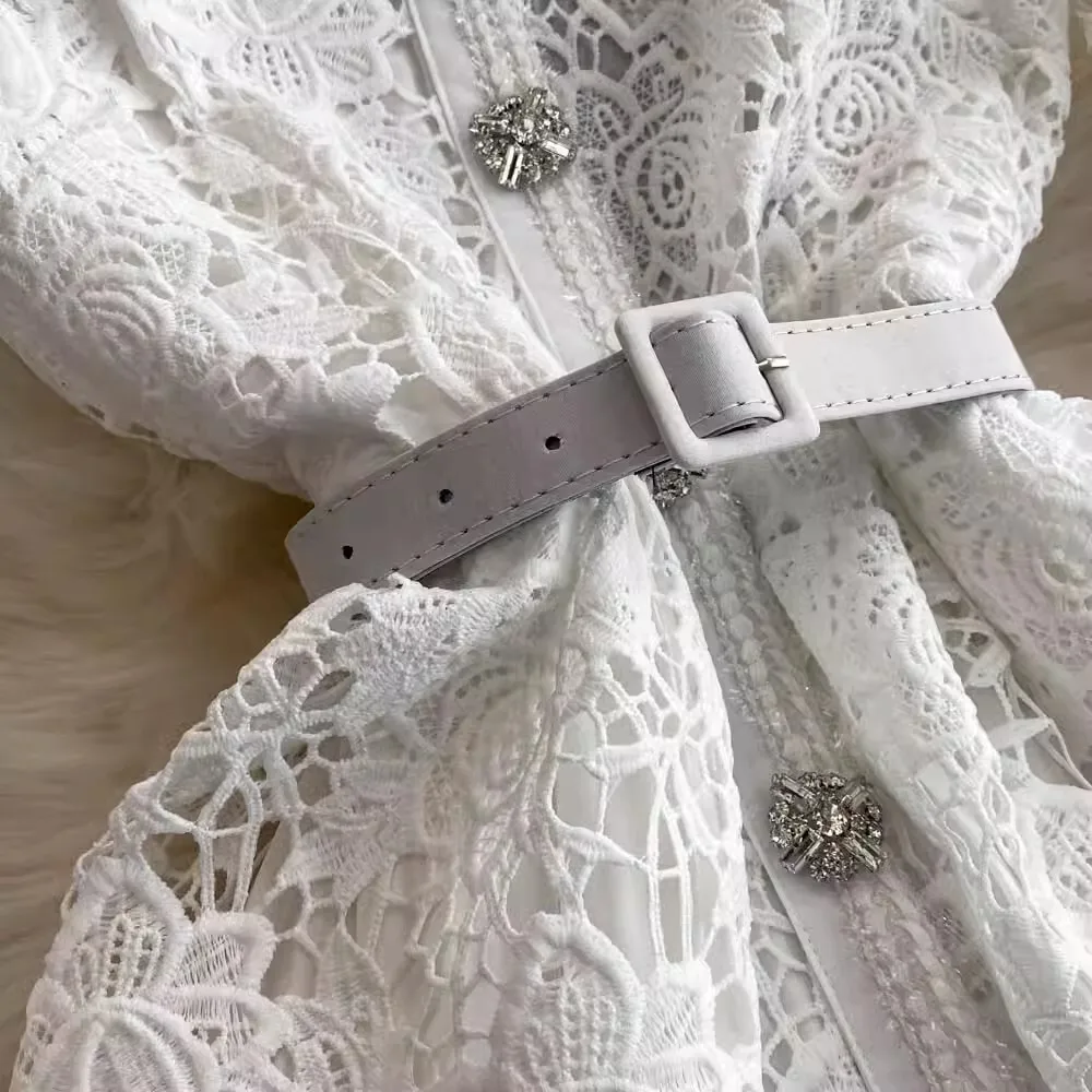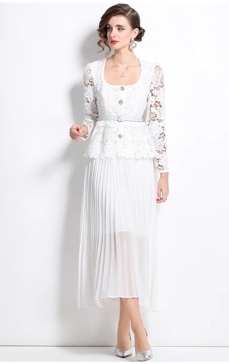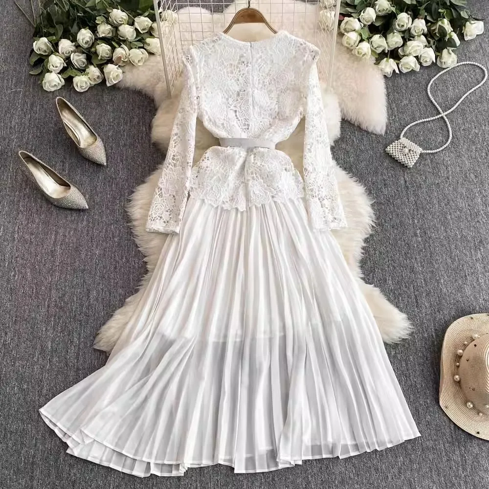الخريف أنيقة الجوف خارج زهرة التطريز الأبيض الدانتيل فساتين الشيفون المرأة كريستال الماس حزام مطوي ماكسي فساتين الحفلات