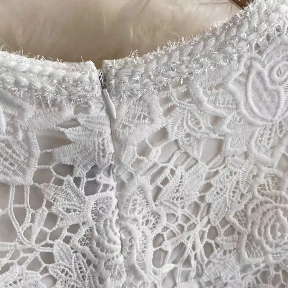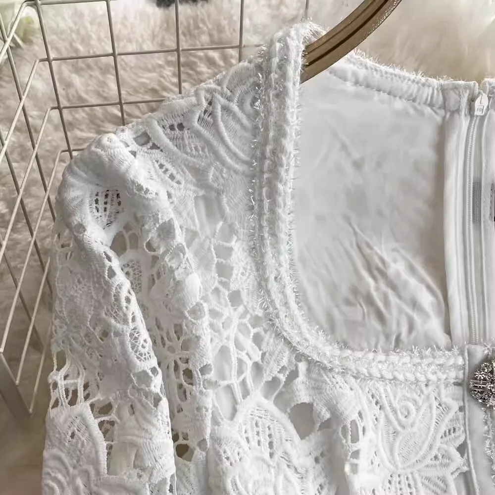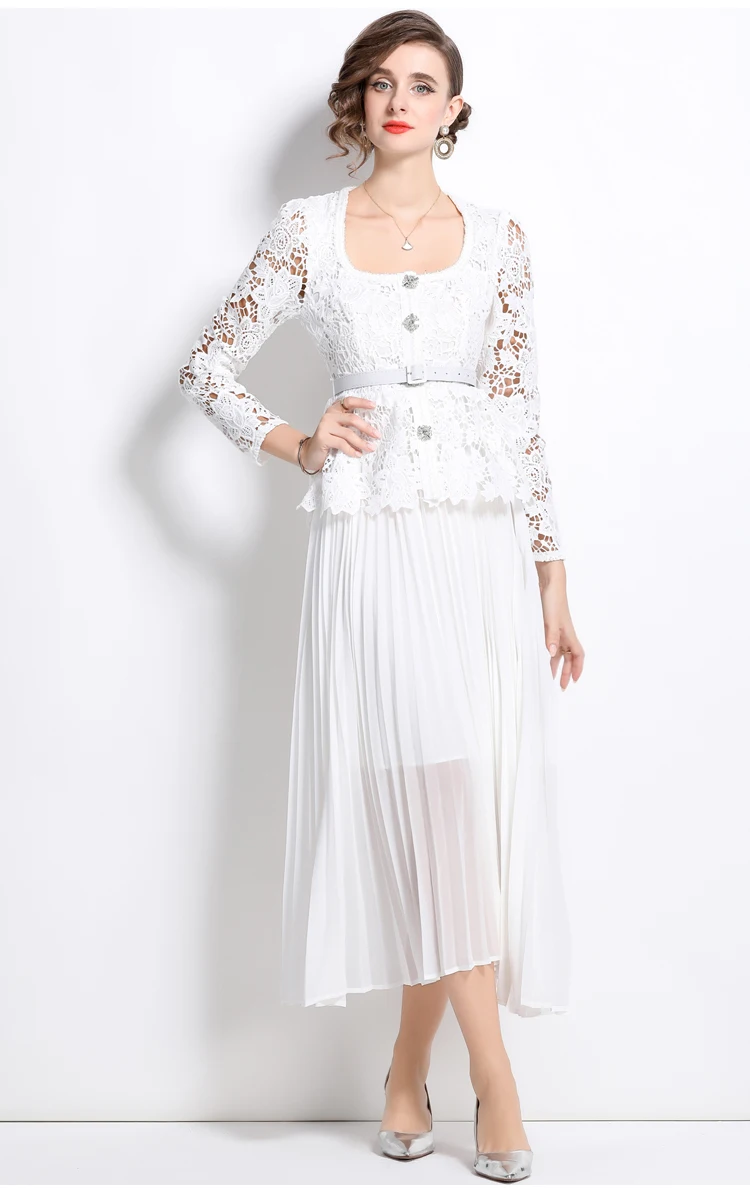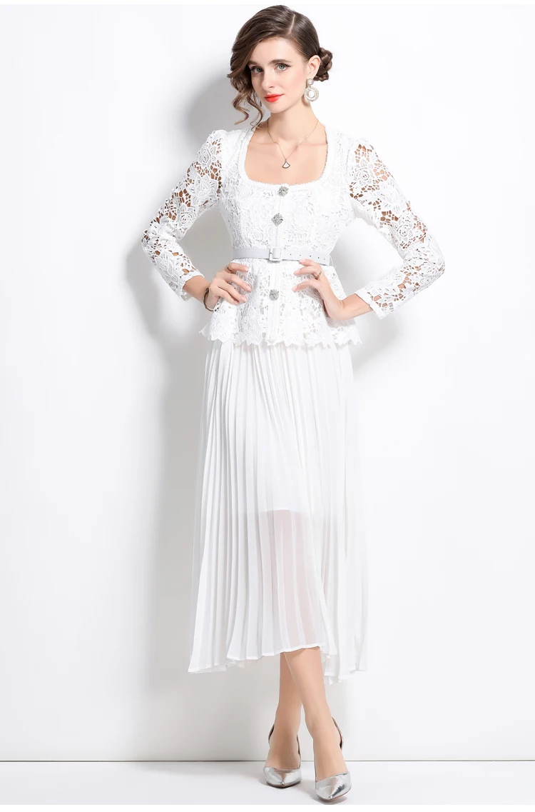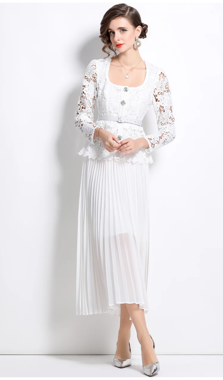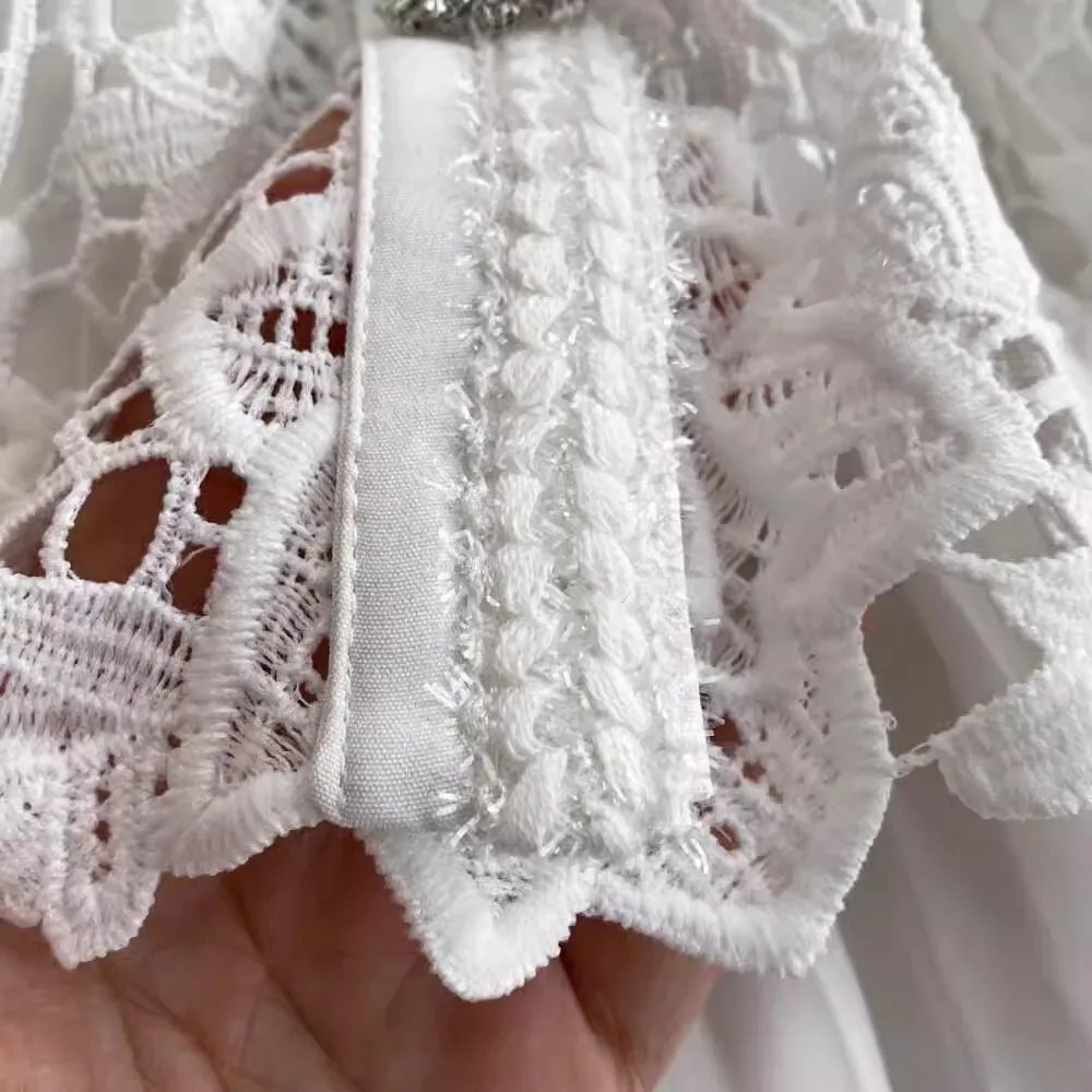 الخريف أنيقة الجوف خارج زهرة التطريز الأبيض الدانتيل فساتين الشيفون المرأة كريستال الماس حزام مطوي ماكسي فساتين الحفلات