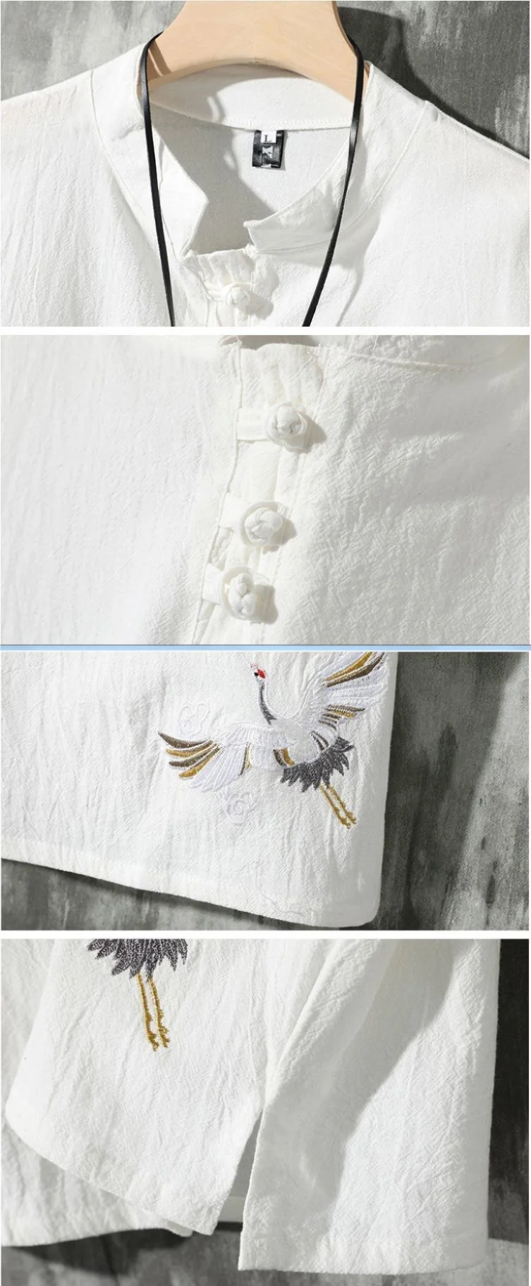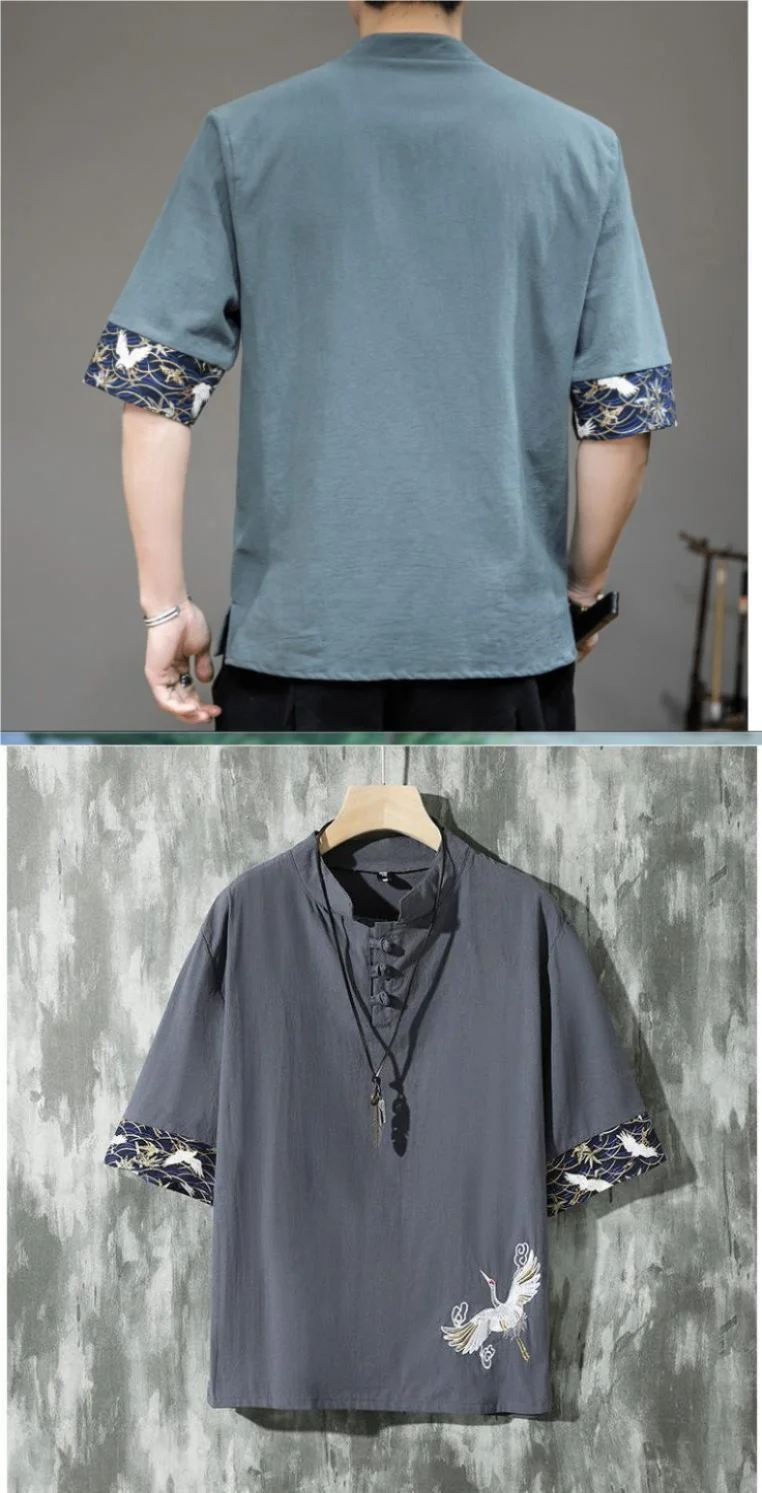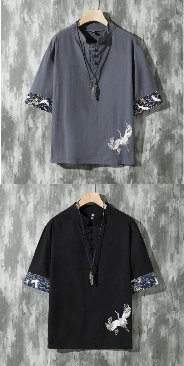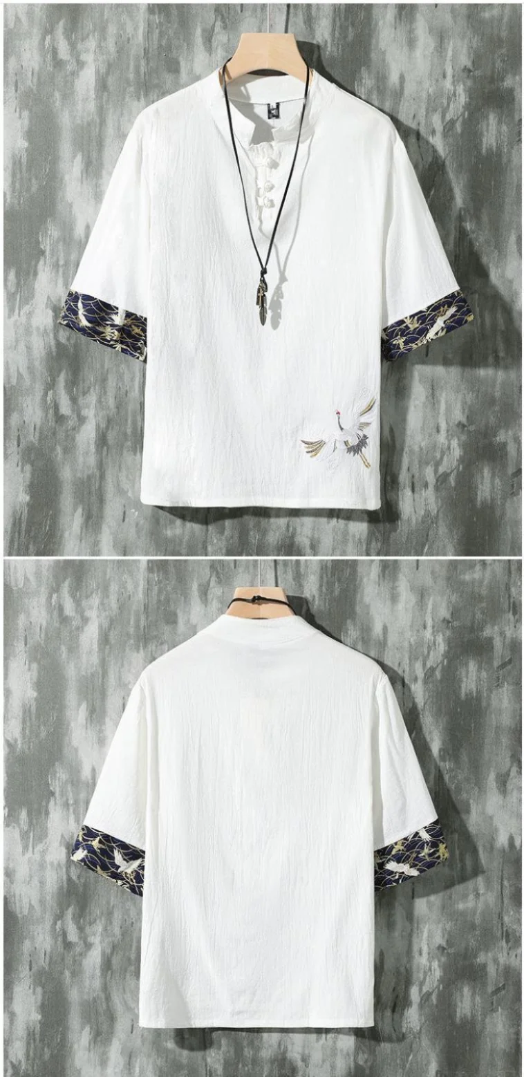 الصيف رقيقة الكتان قصيرة الأكمام تي شيرت الرجال نمط كرين التطريز القطن العصرية فضفاض خمر الأعلى