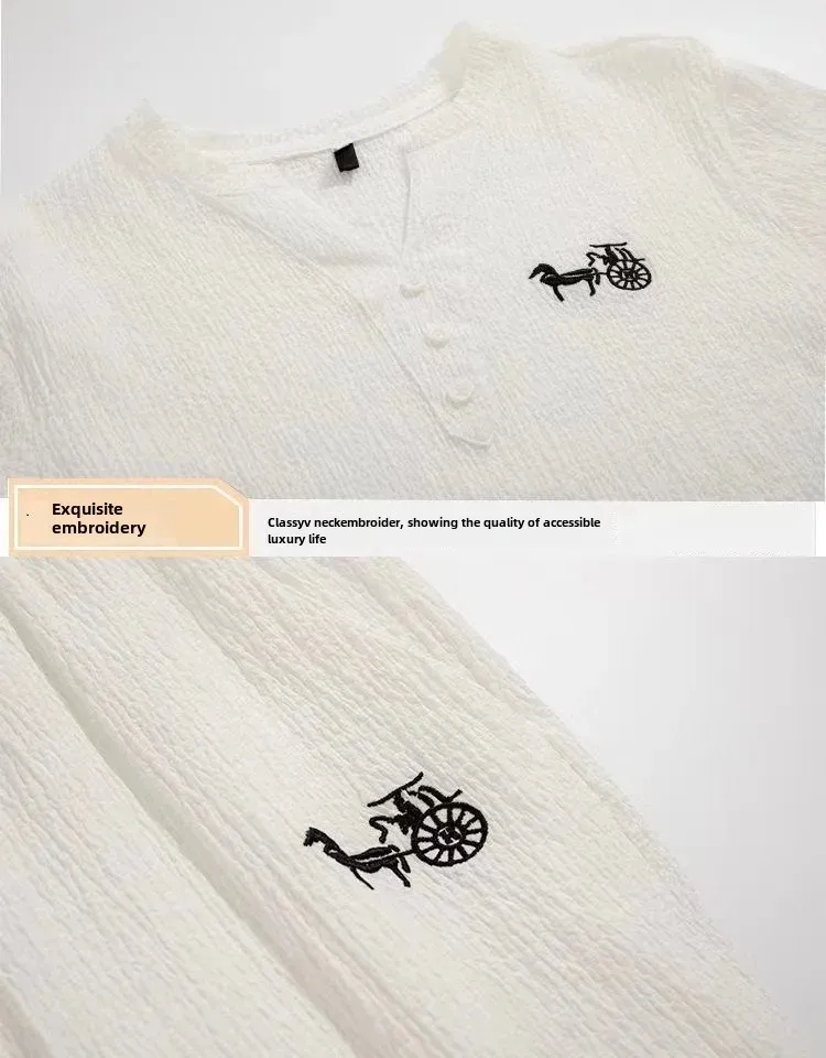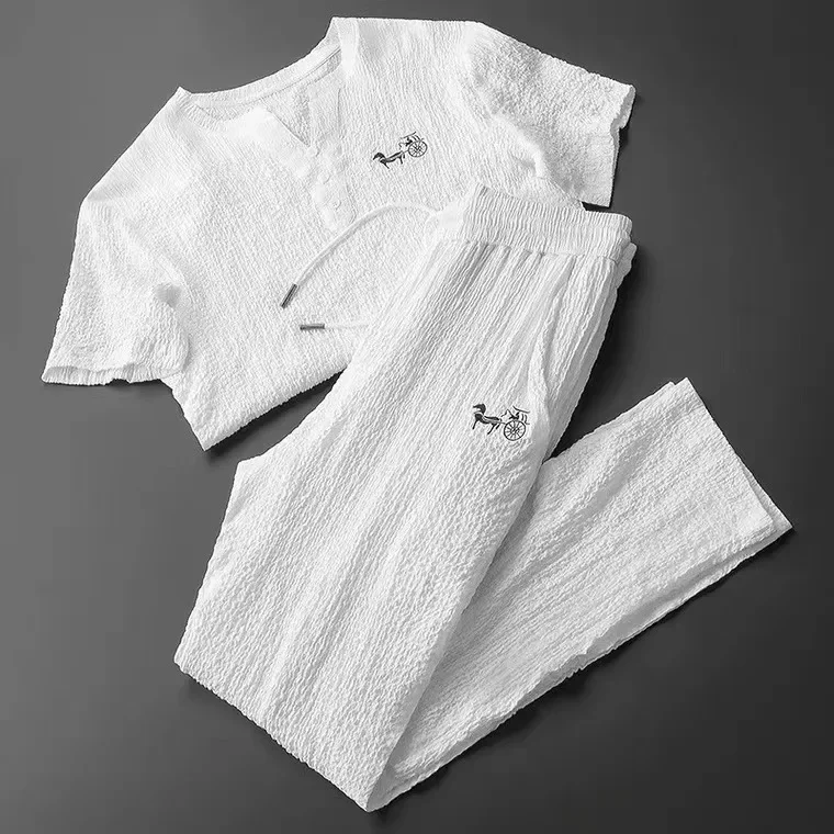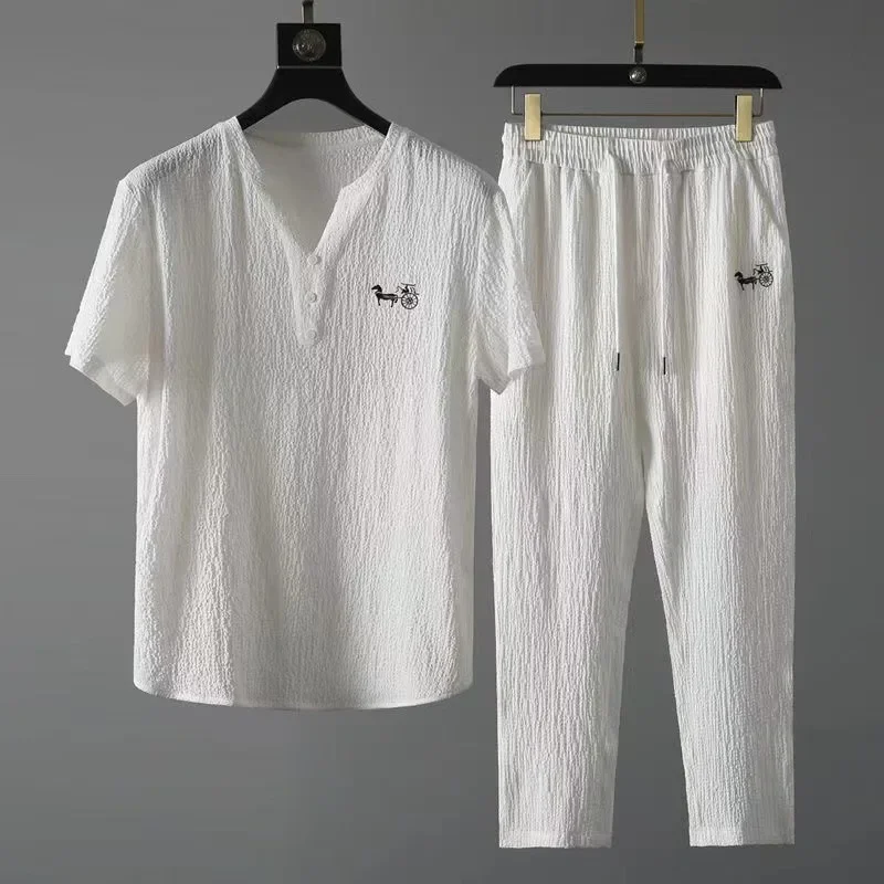 العصرية الصيف الرجال القطن الكتان تي شيرتات قصيرة الاكمام 2 قطعة مجموعة بدلة رياضية غير رسمية الخامس الرقبة اللون الأبيض النمط الصيني