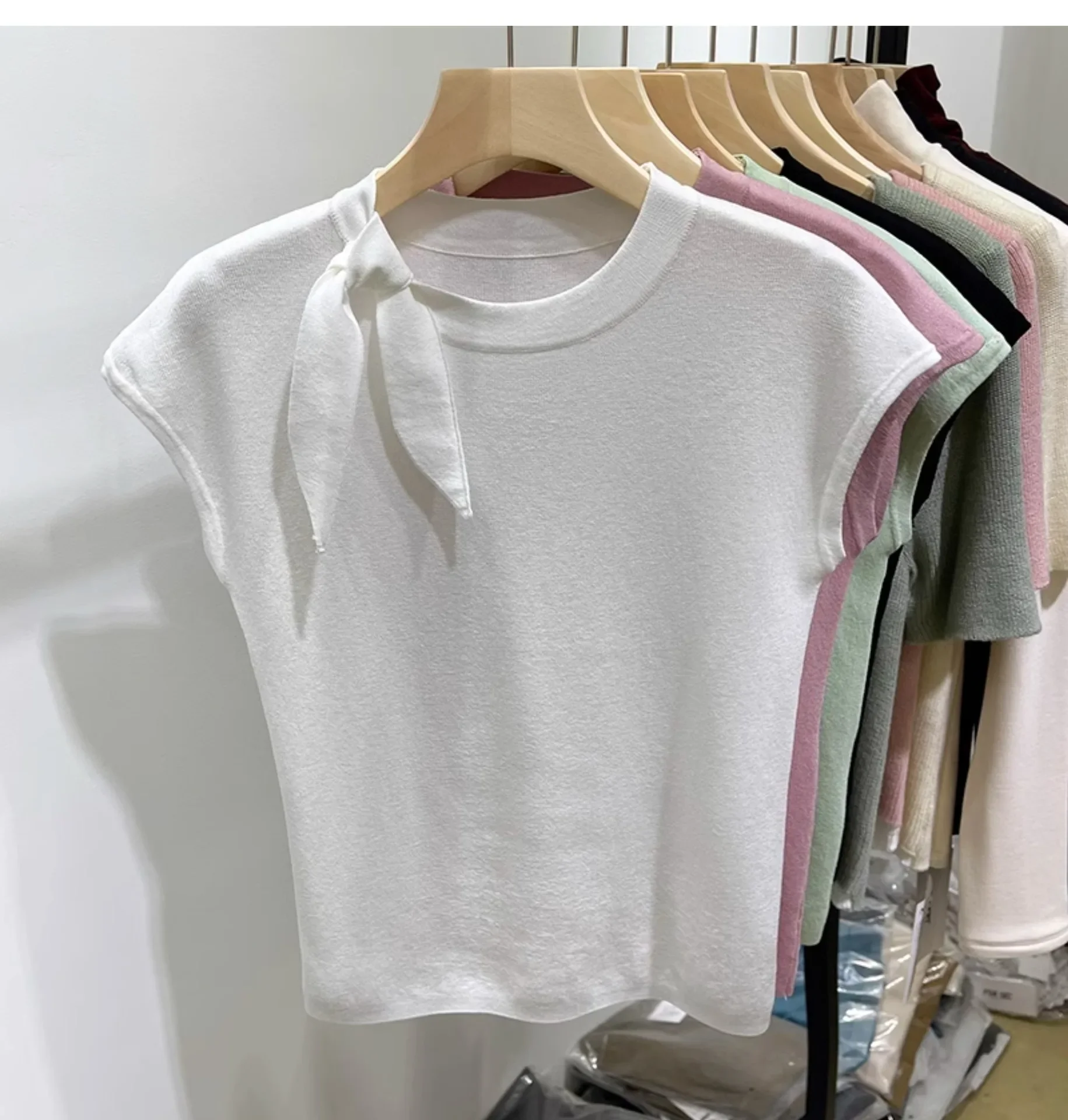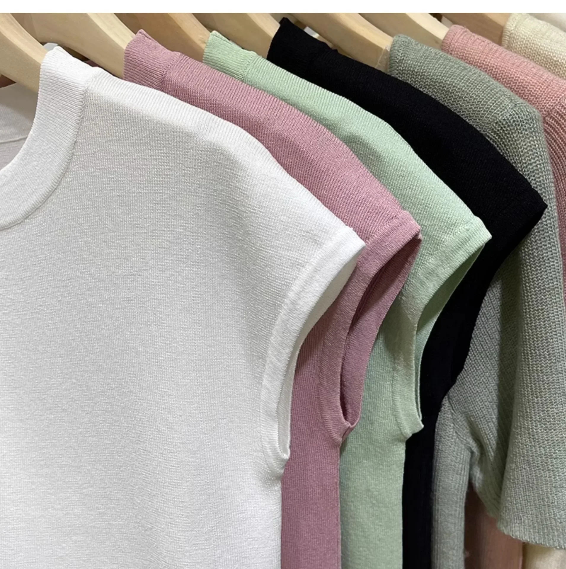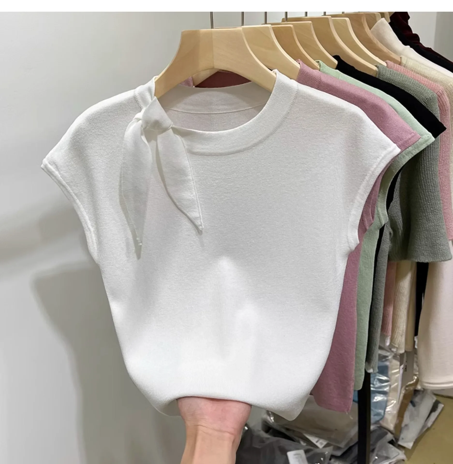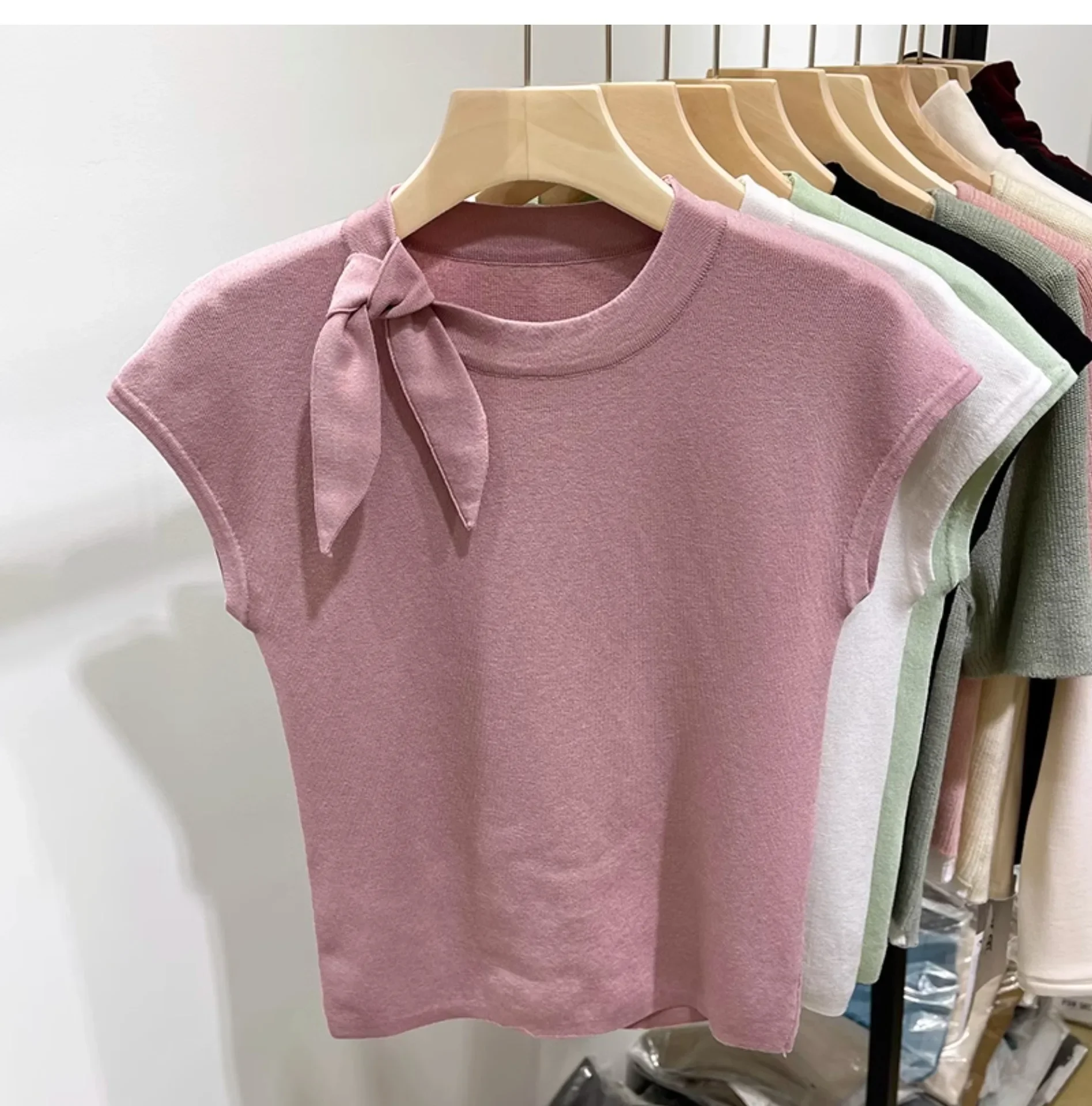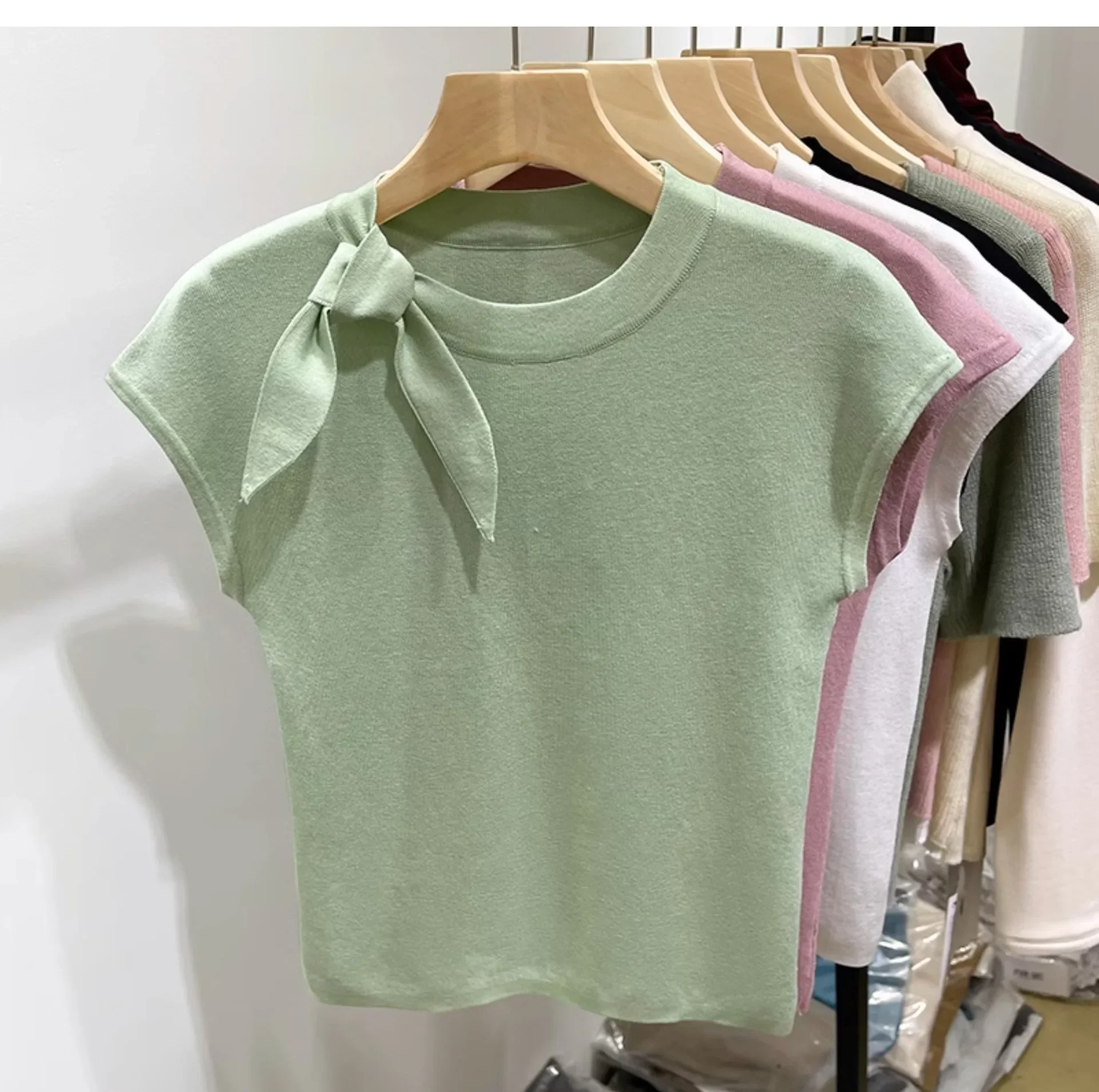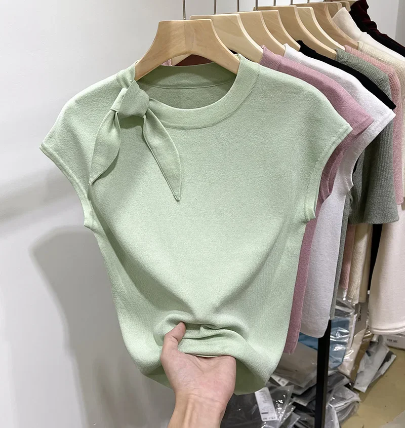المرأة قصيرة الأكمام الجولة الرقبة متماسكة تي شيرت طاقم الرقبة الديكور ألياف البوليستر صيف 2024 جديد سليم صالح تنوعا ليتل يطير