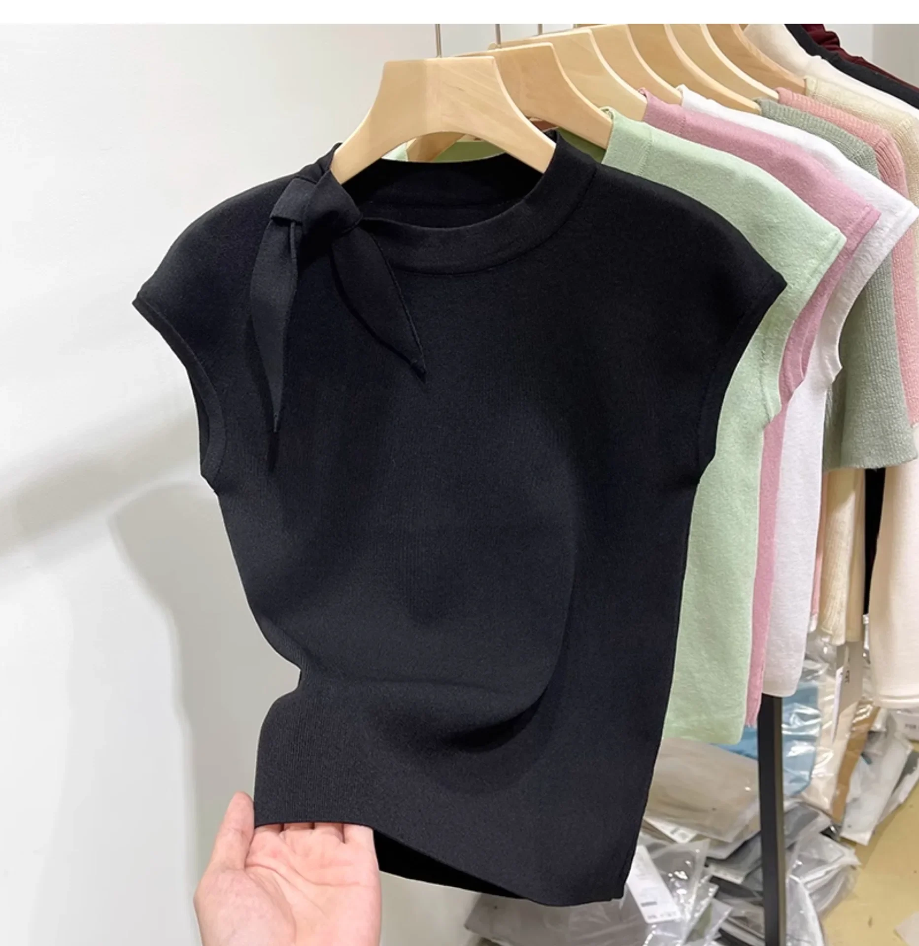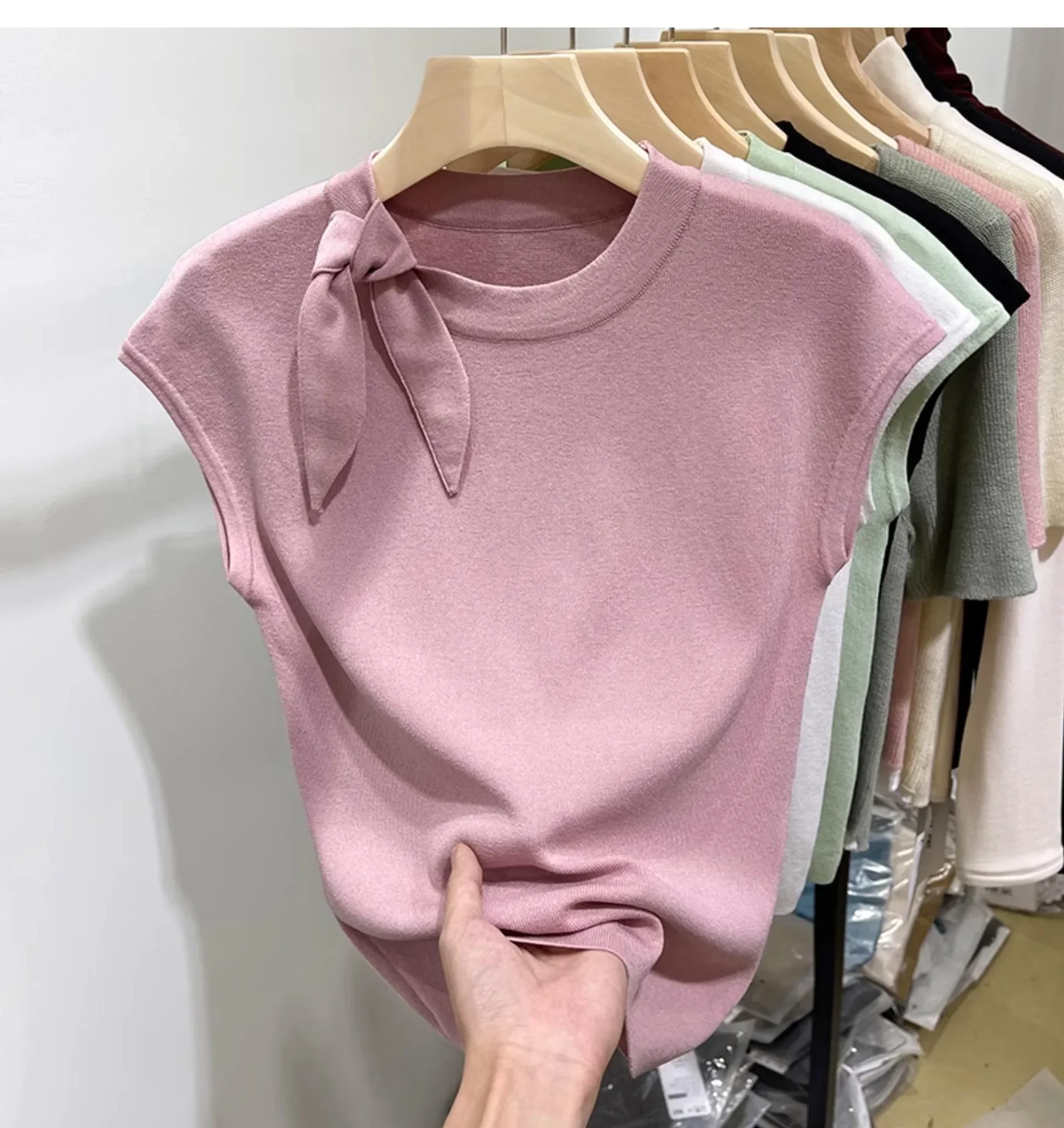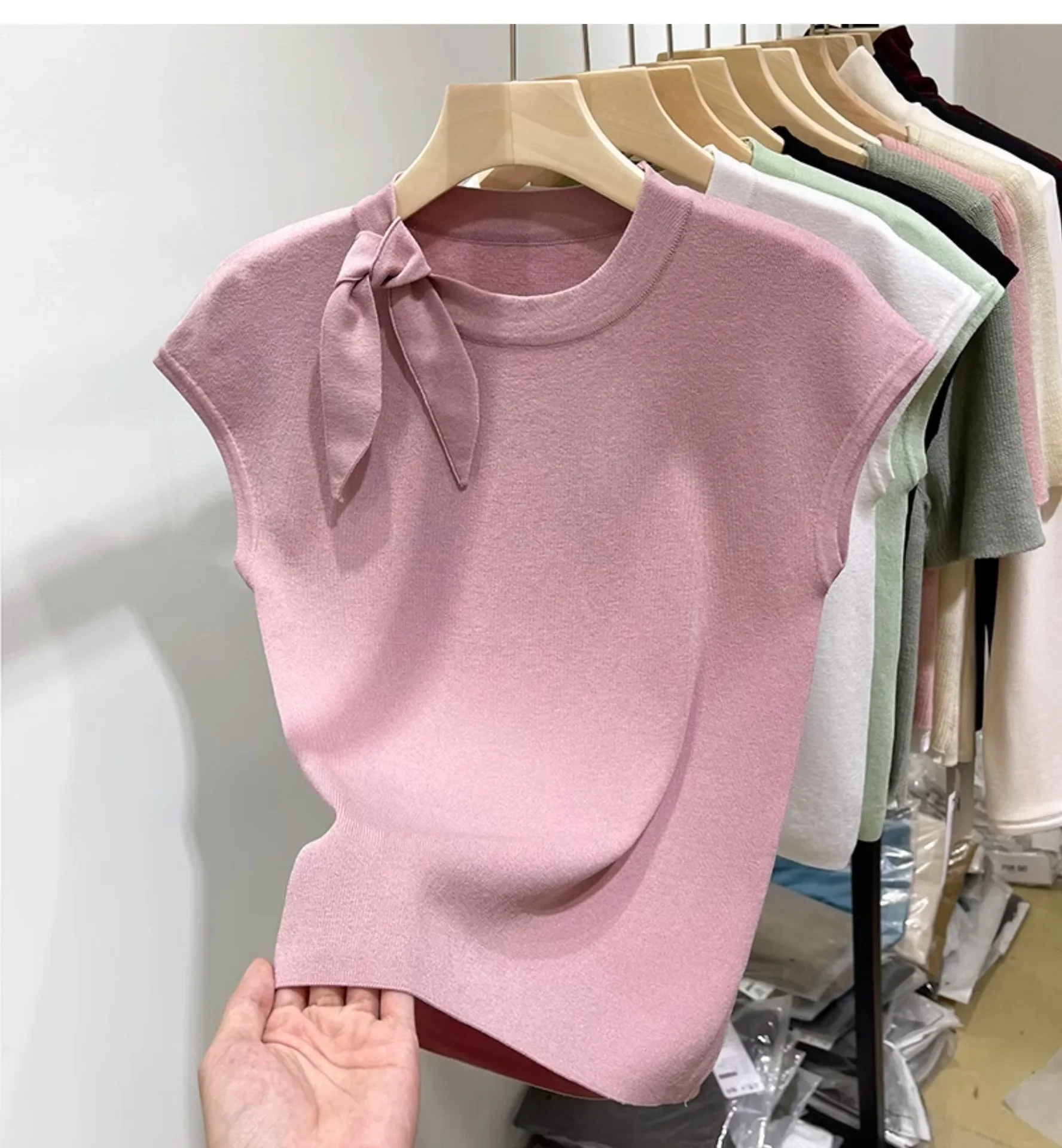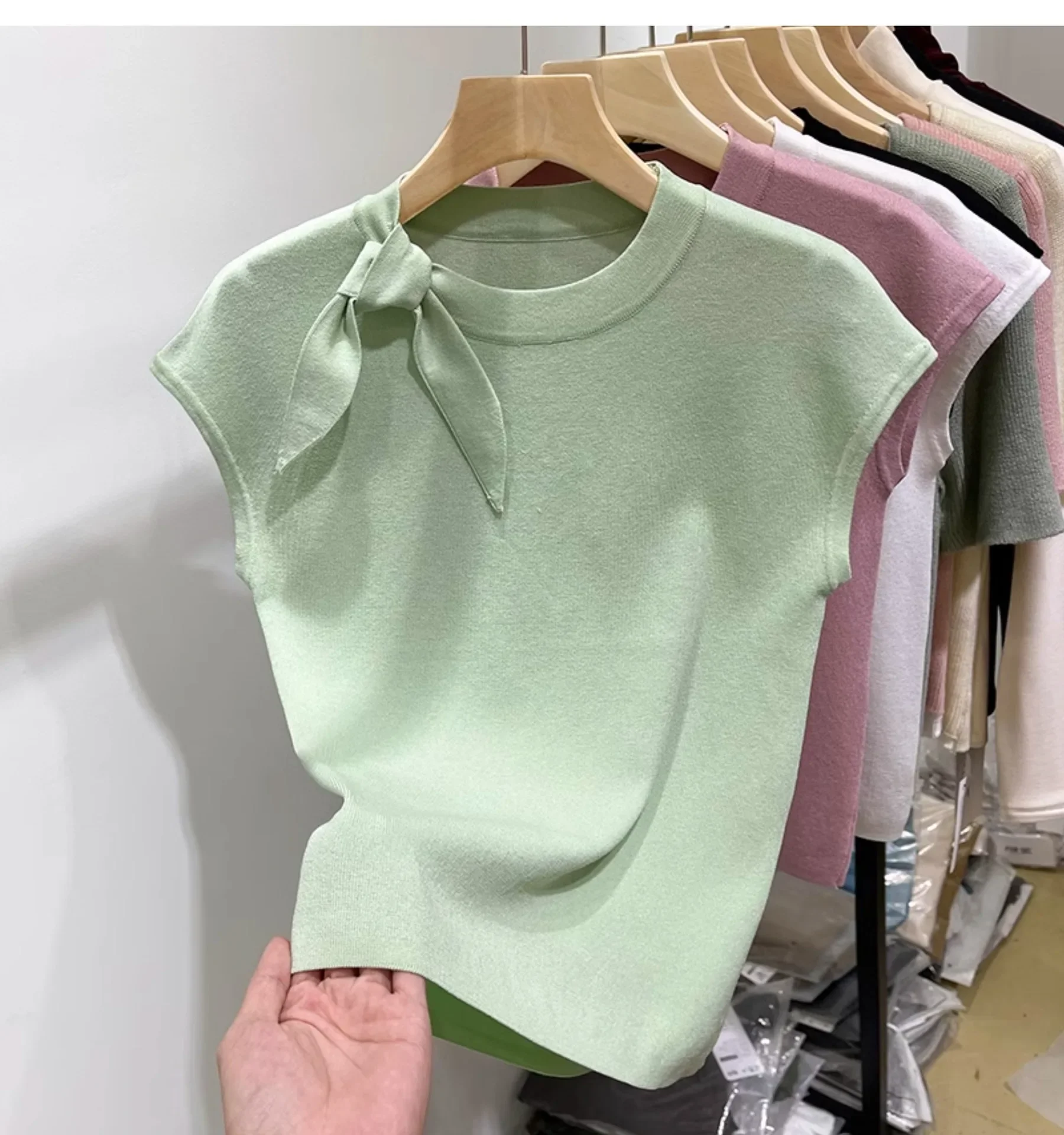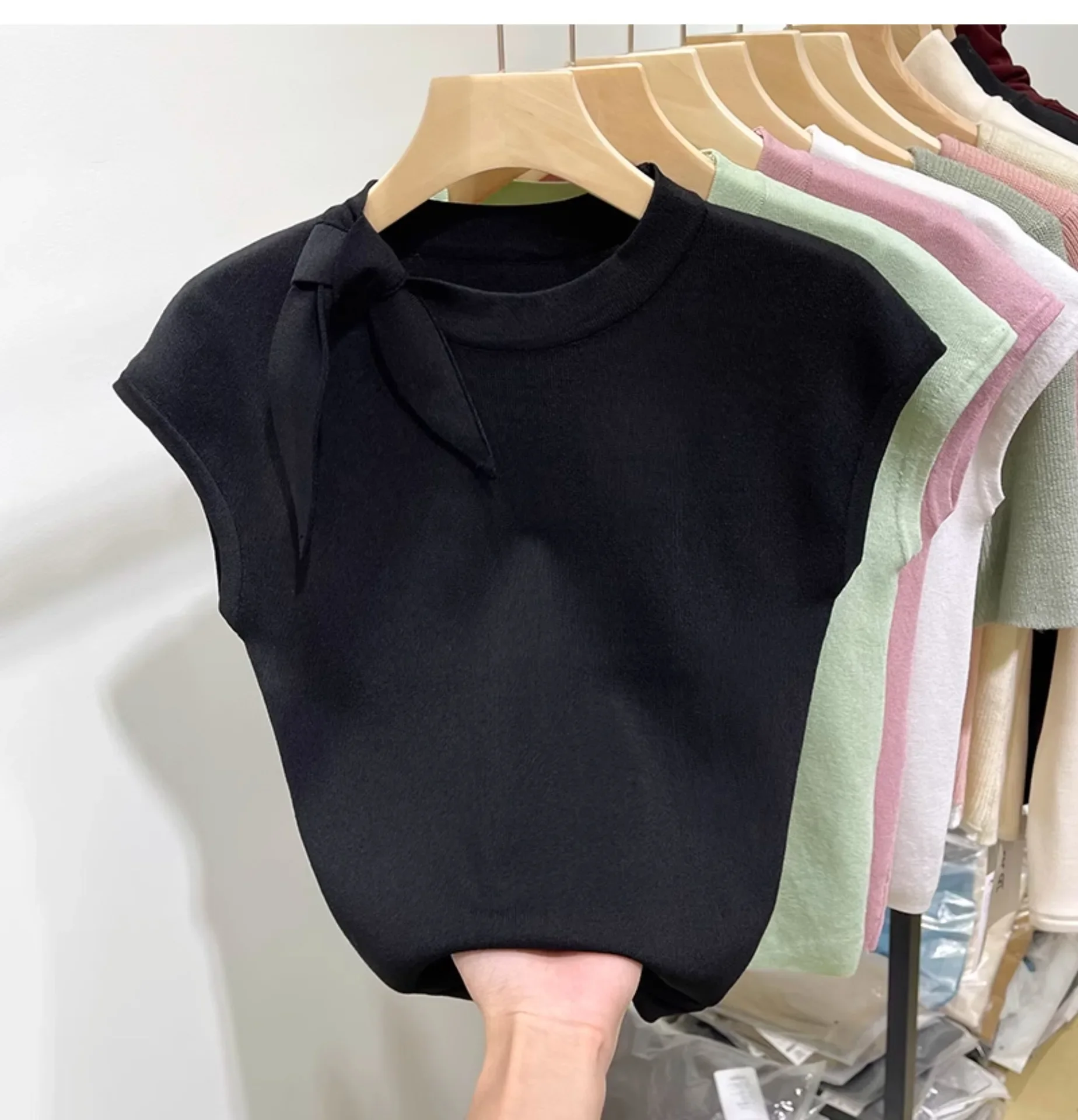 المرأة قصيرة الأكمام الجولة الرقبة متماسكة تي شيرت طاقم الرقبة الديكور ألياف البوليستر صيف 2024 جديد سليم صالح تنوعا ليتل يطير