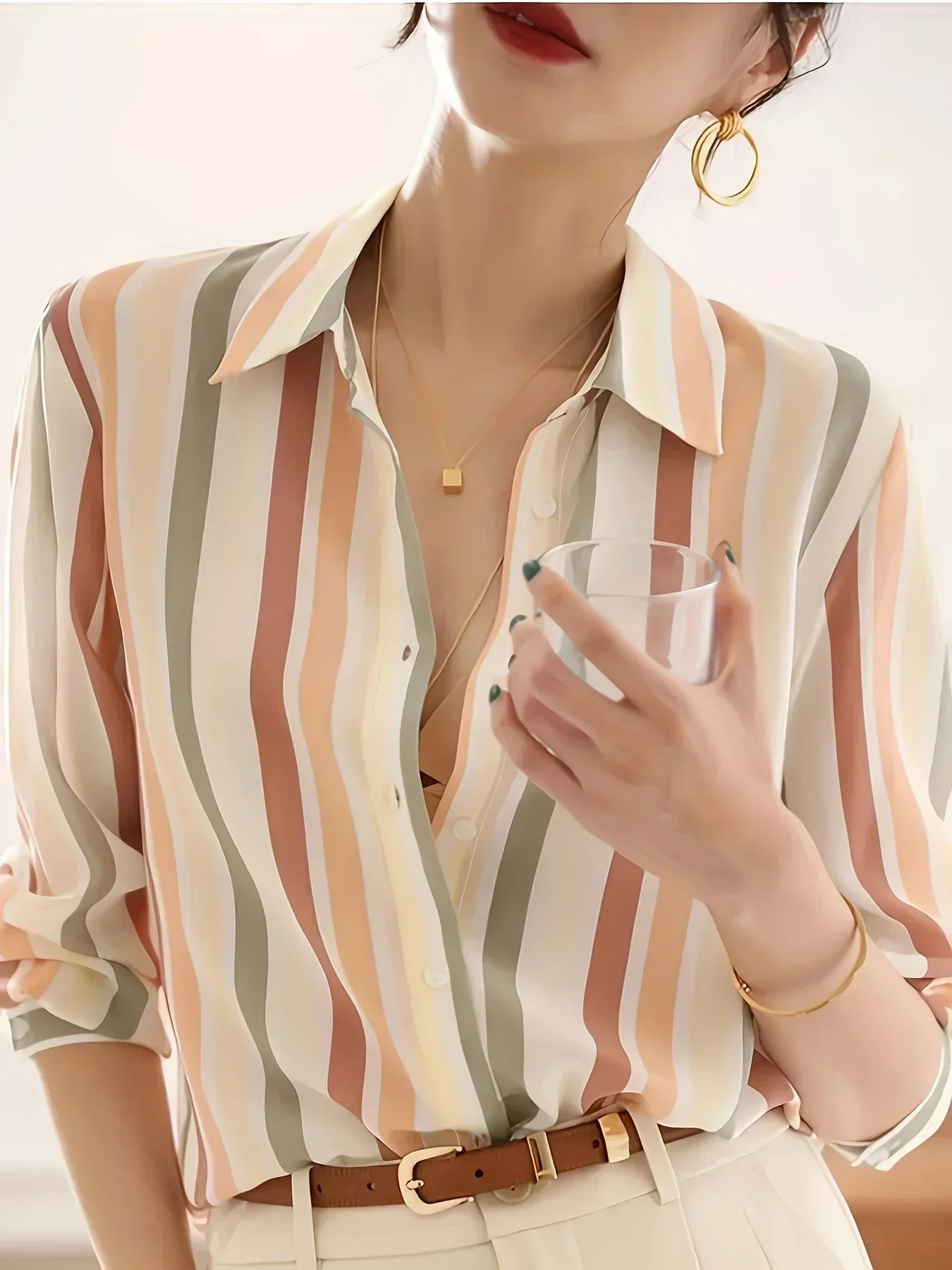 المرأة مخطط زر طباعة الجبهة قميص طويل الأكمام ، قمم النساء ، بلوزة عارضة ، الربيع والخريف الملابس
