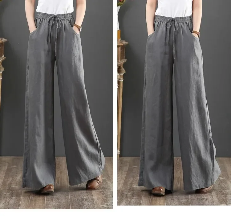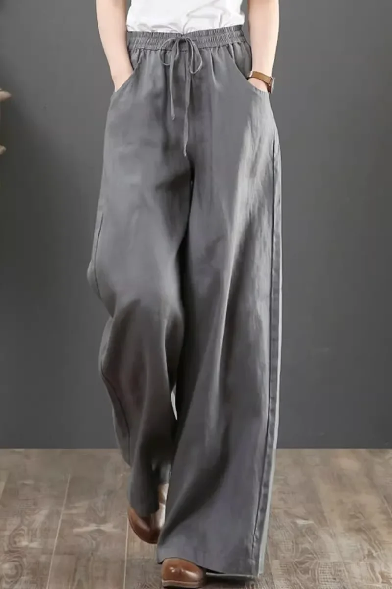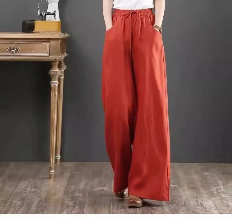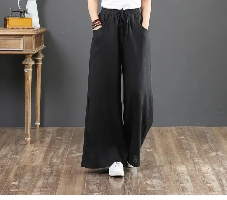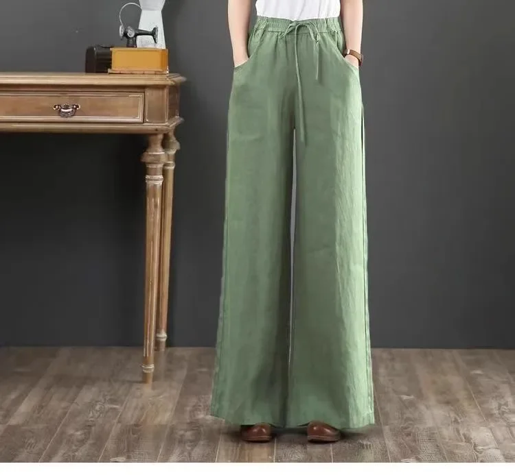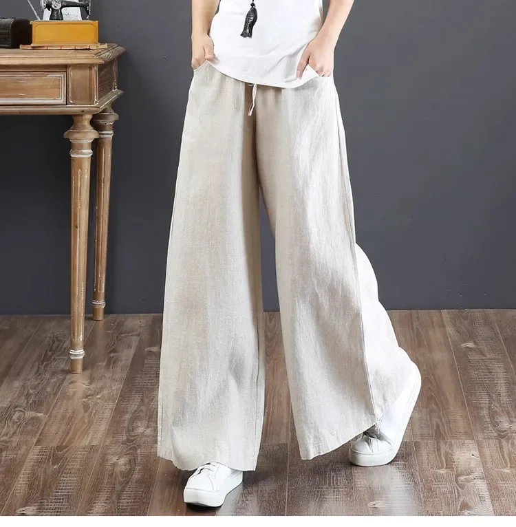 بنطال صيفي رقيق من القطن والكتان واسع الساق بخصر عالٍ وفضفاض غير رسمي للنساء أنيق وخفيف الوزن