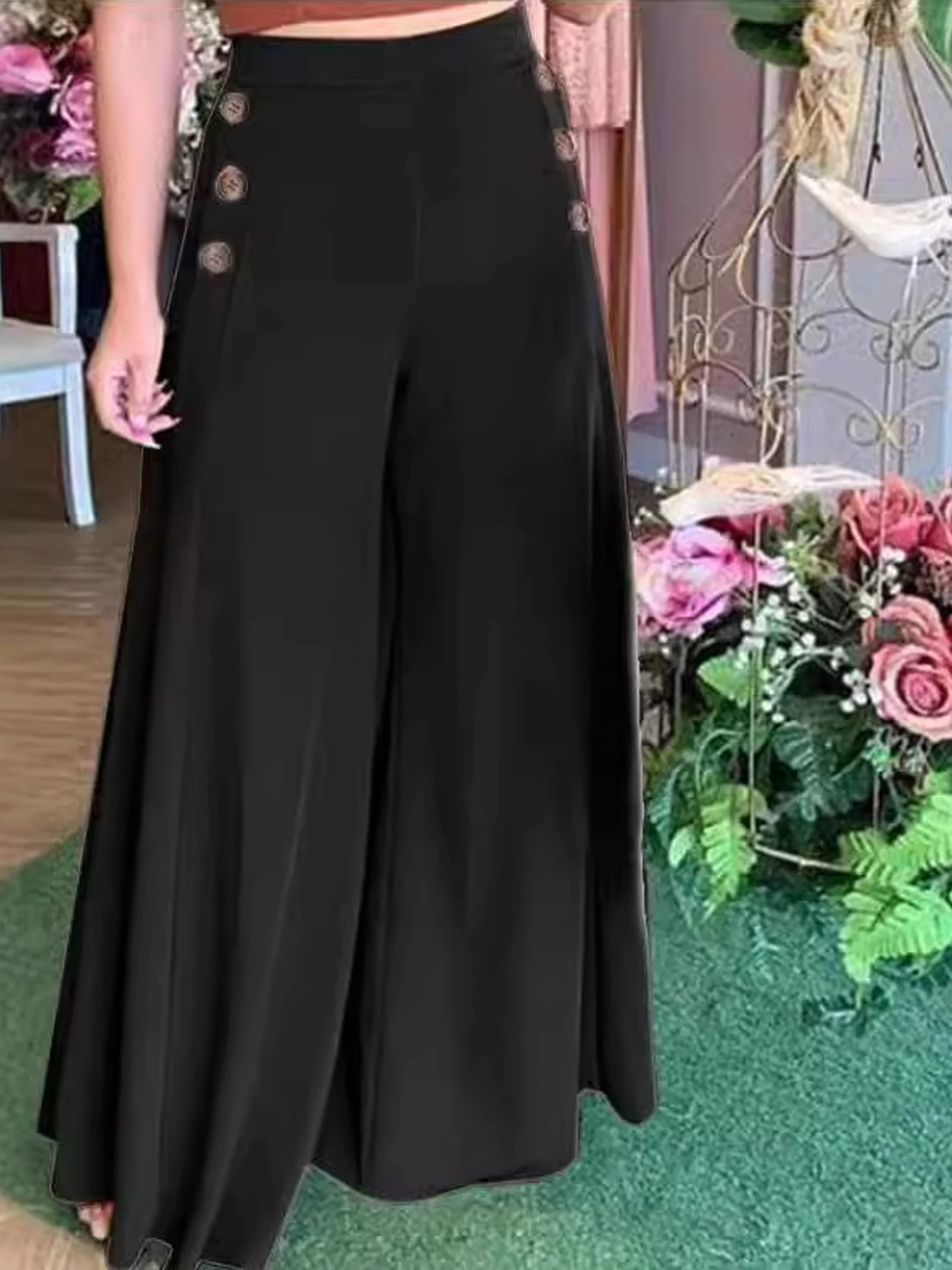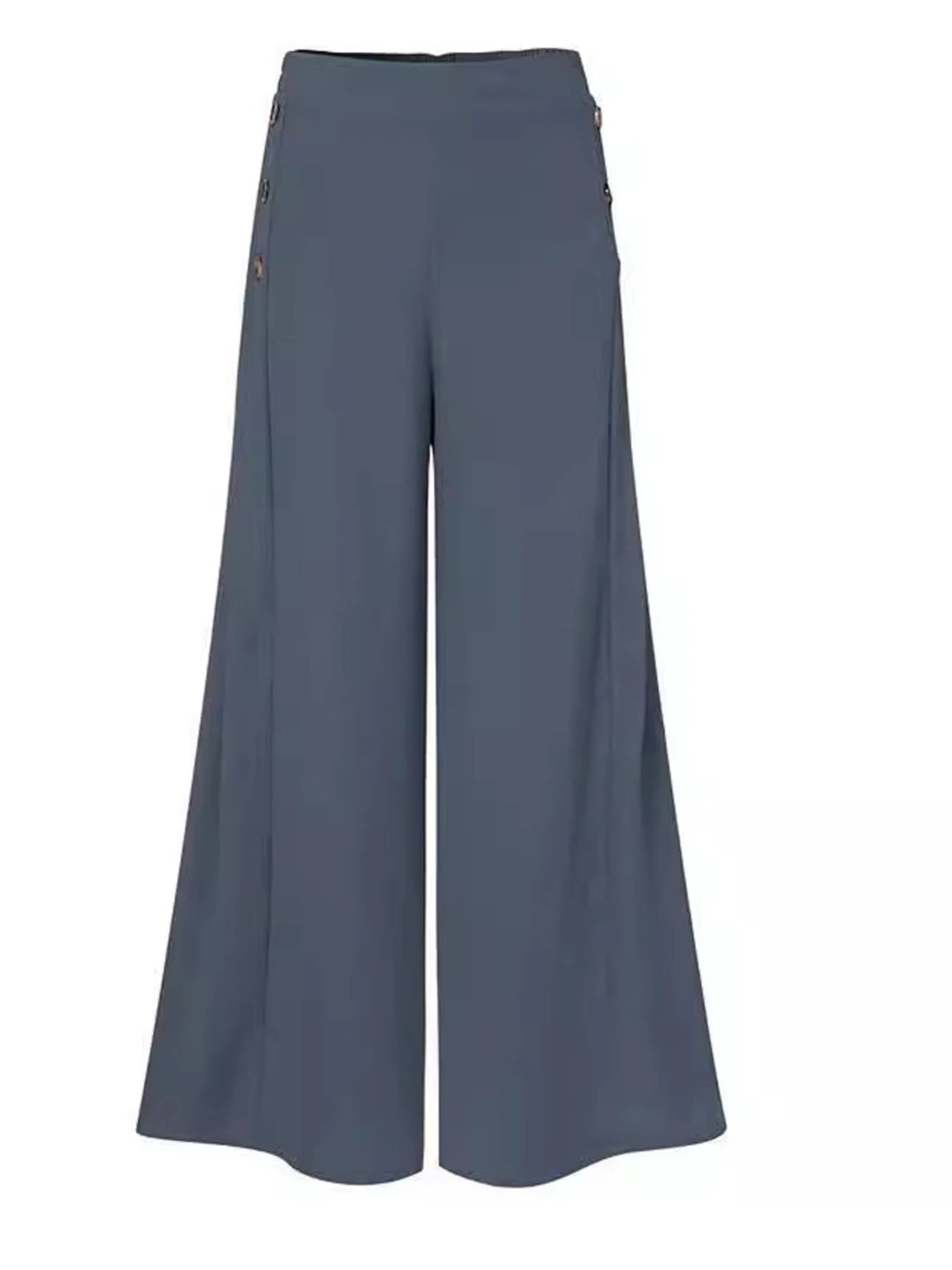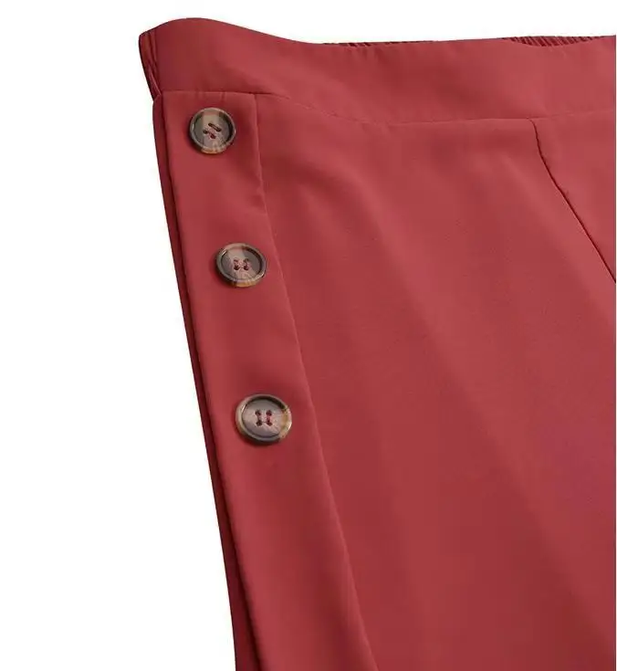 بنطال نسائي جديد لربيع وصيف عالي الخصر واسع الساق مع زر وخصر مرن