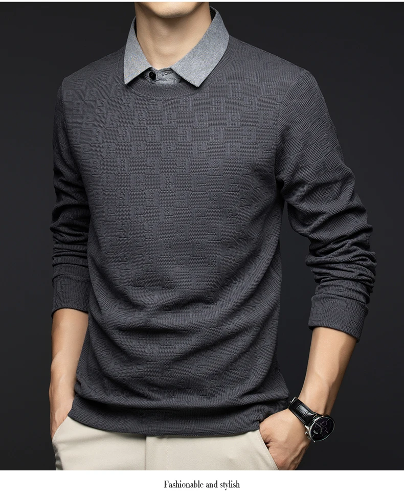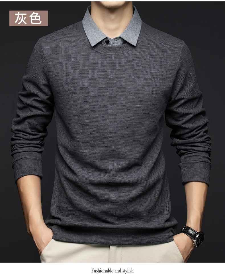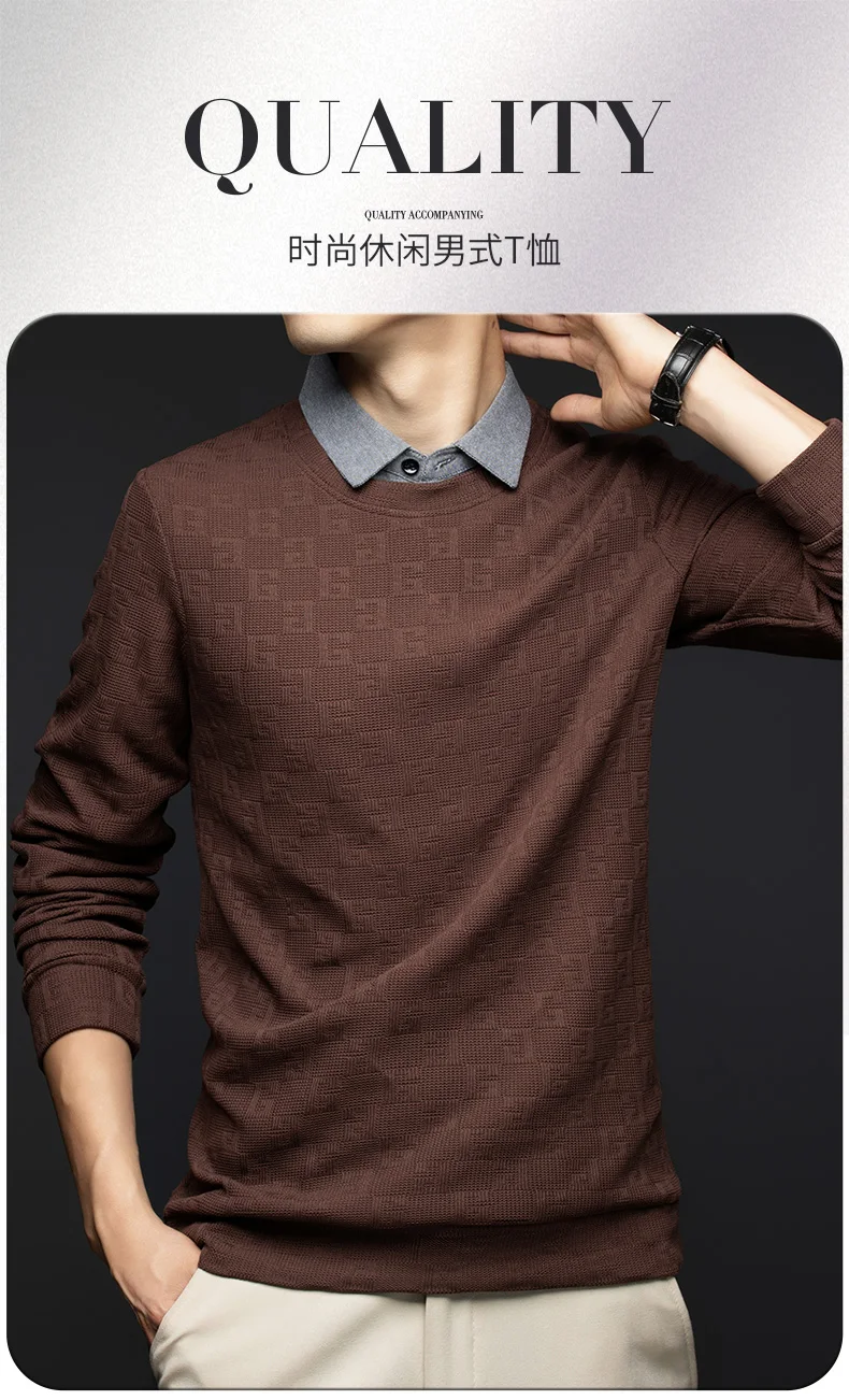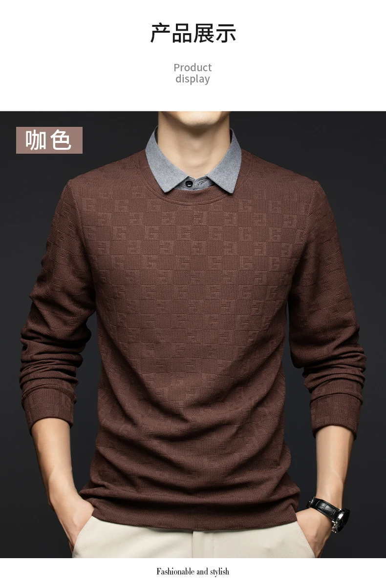 تيشيرت دافئ سميك للرجال ، توبات للعمل في الخريف والشتاء ، سترة ذات طبقات ، مع ياقة قميص مخيطة