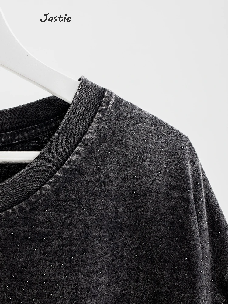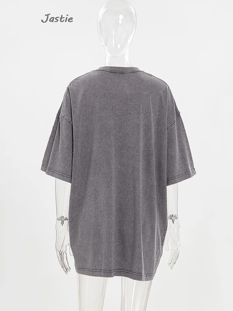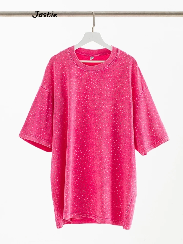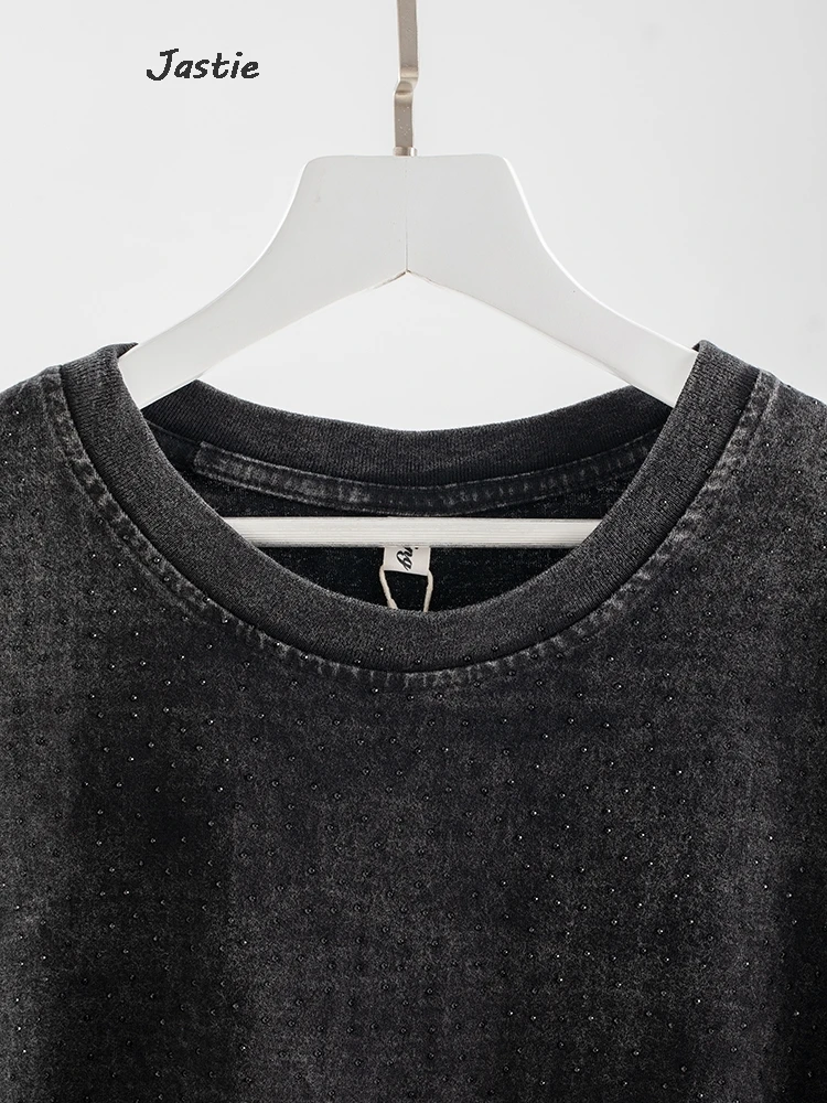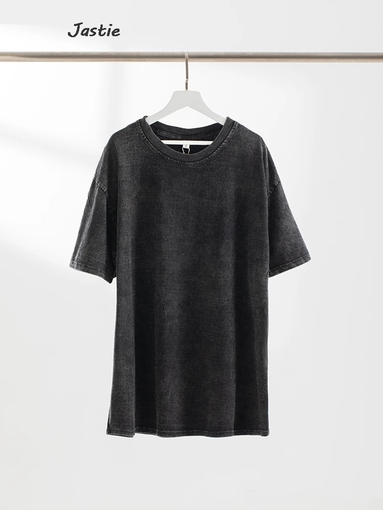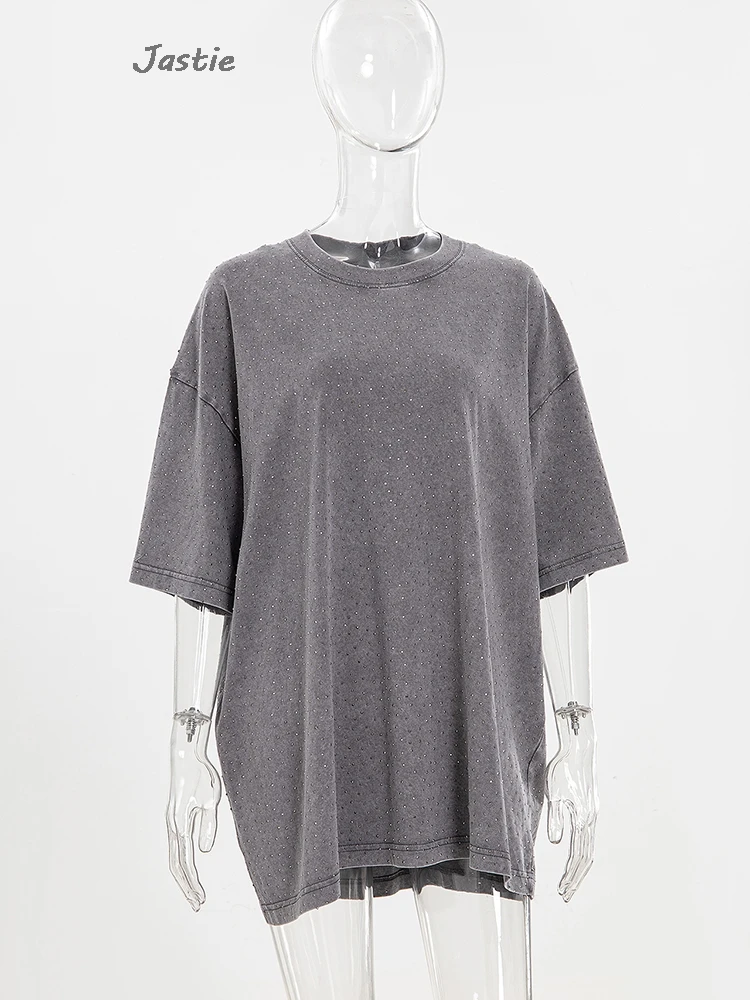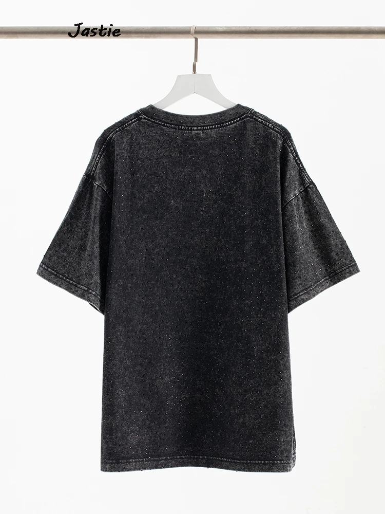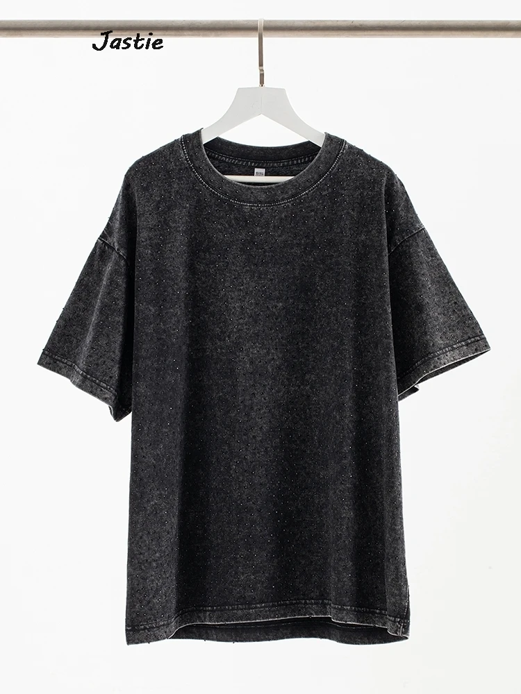 تي شيرت نسائي كاجوال من حجر الراين الأسود ، رقبة مستديرة ، تيشيرتات بأكمام قصيرة ، فضفاض ، متوسط الطول ، ملابس نساء الشوارع ، الصيف