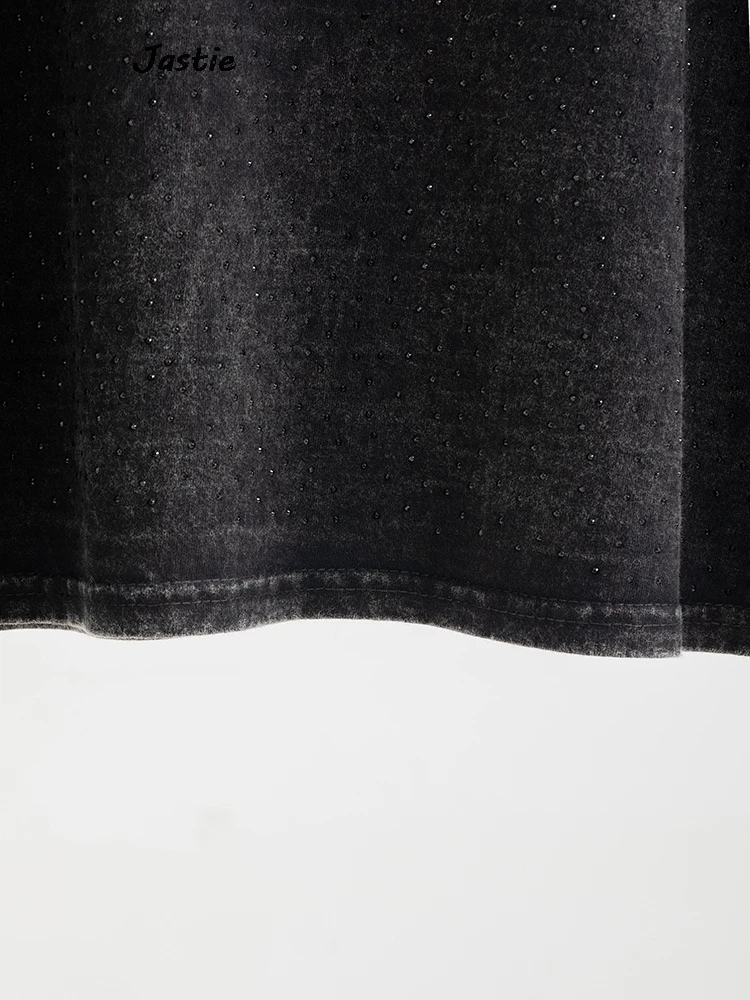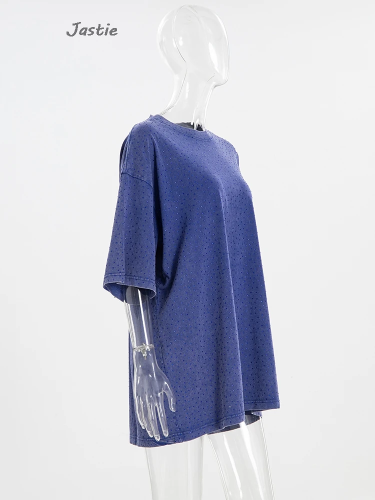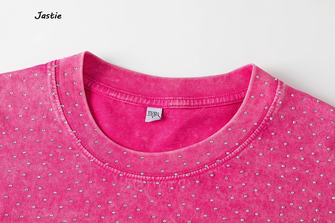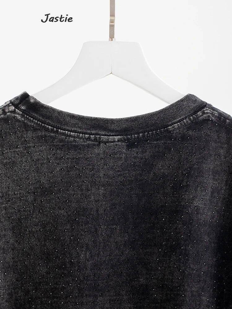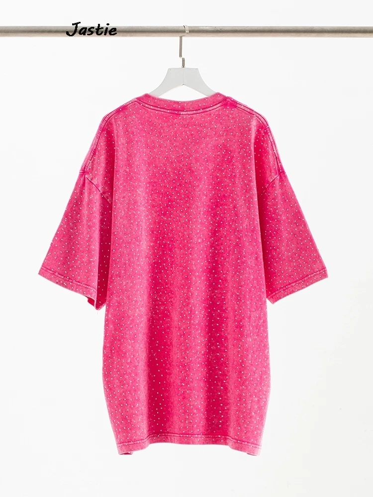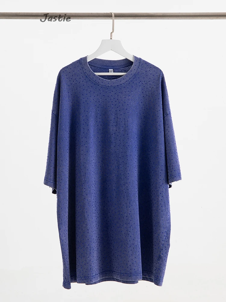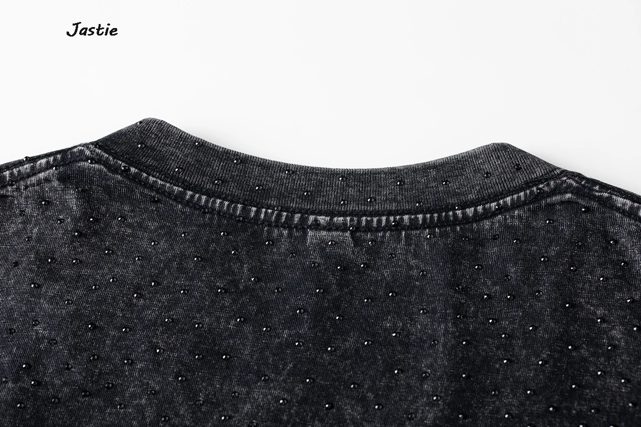 تي شيرت نسائي كاجوال من حجر الراين الأسود ، رقبة مستديرة ، تيشيرتات بأكمام قصيرة ، فضفاض ، متوسط الطول ، ملابس نساء الشوارع ، الصيف
