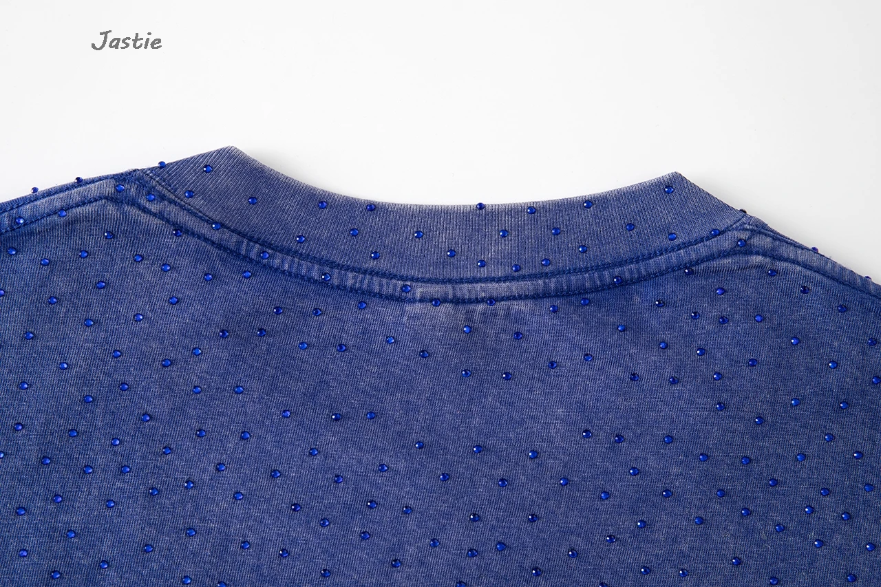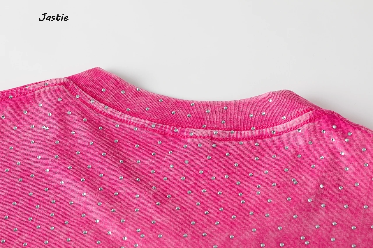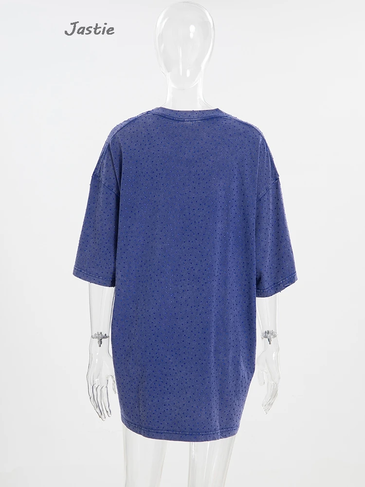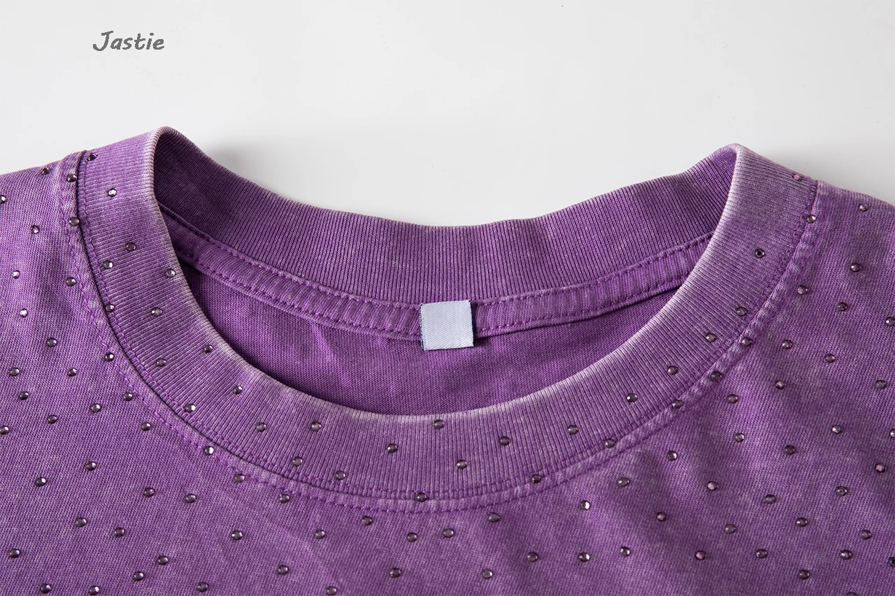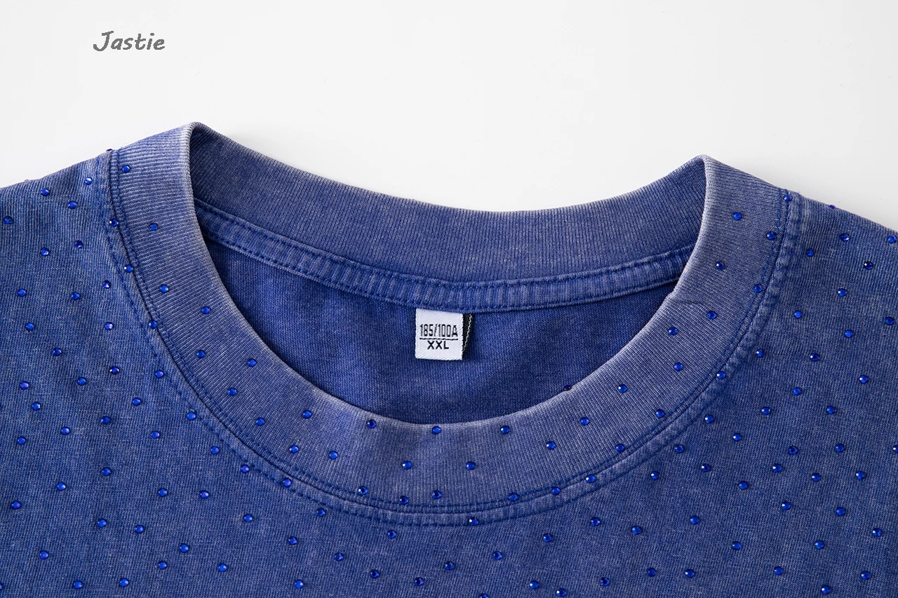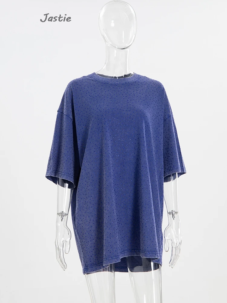 تي شيرت نسائي كاجوال من حجر الراين الأسود ، رقبة مستديرة ، تيشيرتات بأكمام قصيرة ، فضفاض ، متوسط الطول ، ملابس نساء الشوارع ، الصيف