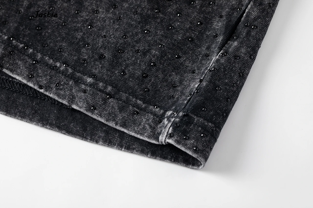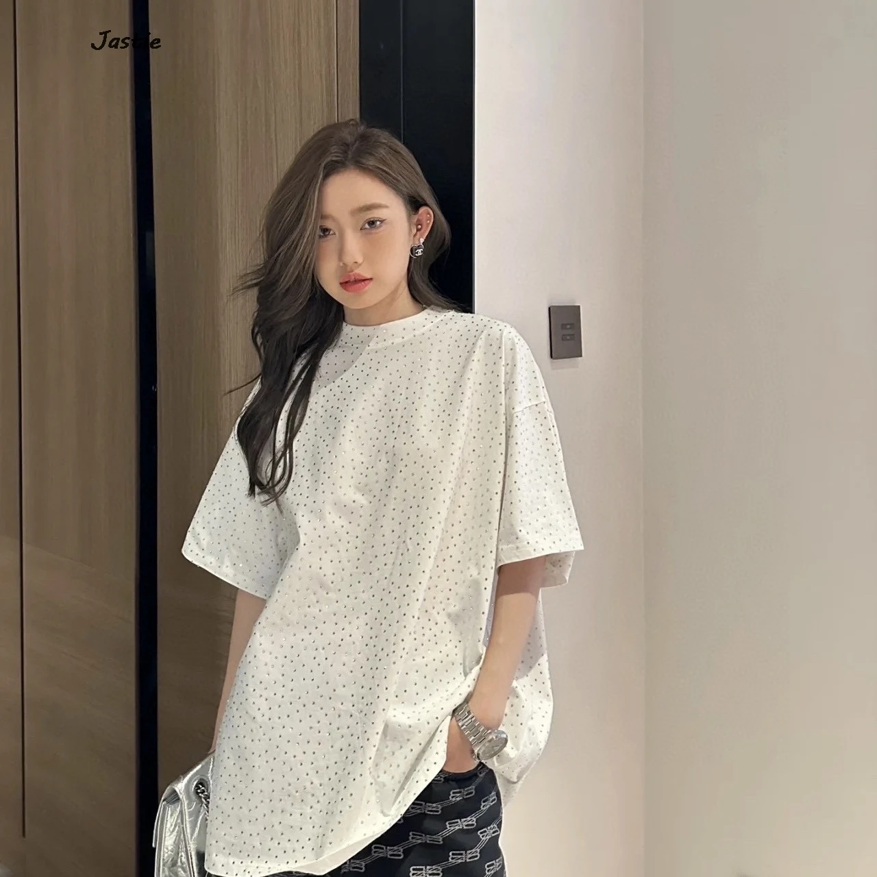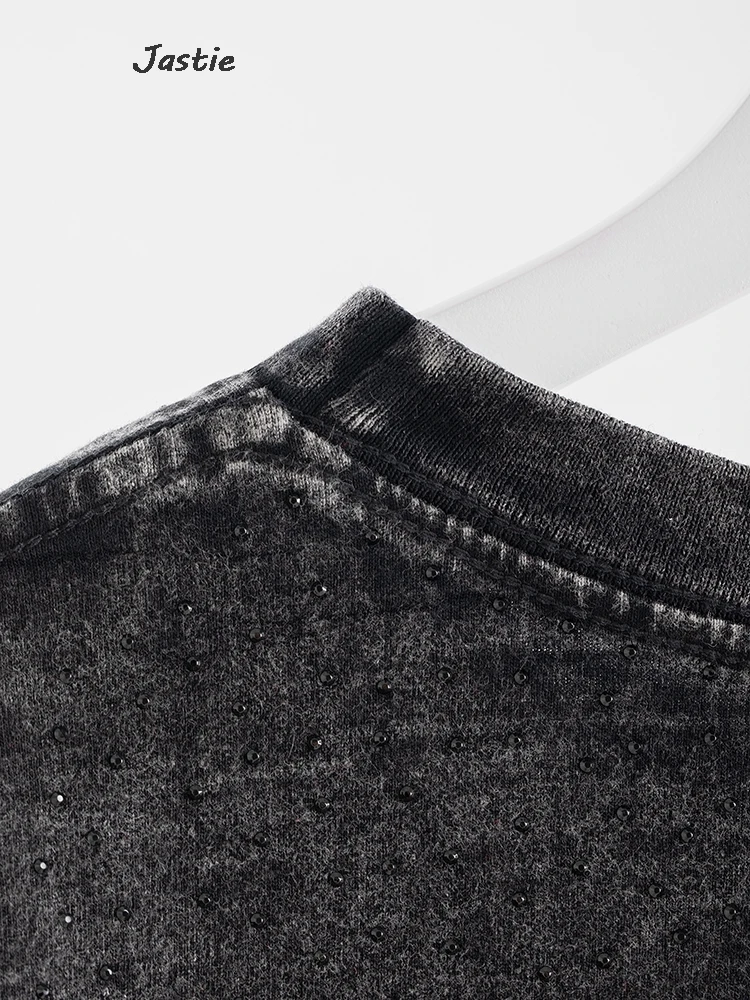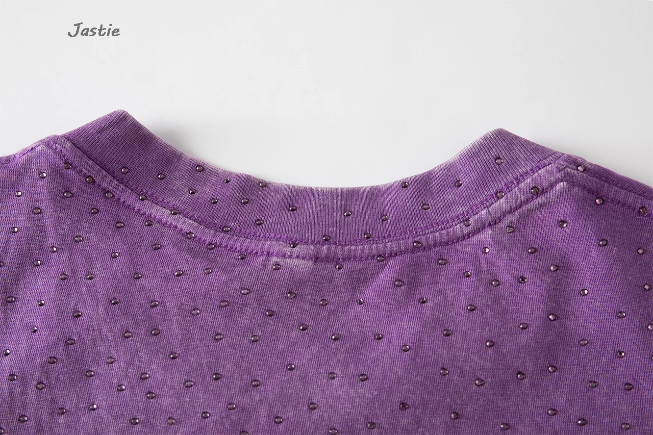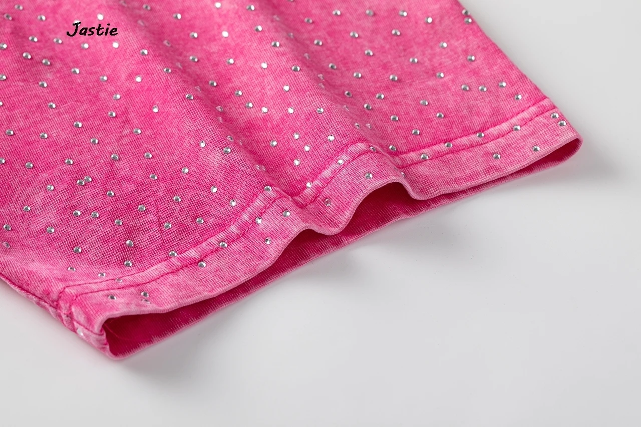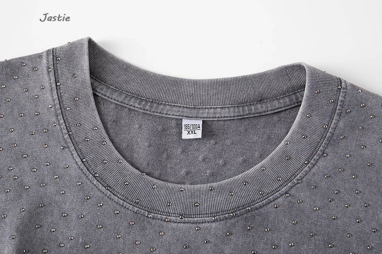 تي شيرت نسائي كاجوال من حجر الراين الأسود ، رقبة مستديرة ، تيشيرتات بأكمام قصيرة ، فضفاض ، متوسط الطول ، ملابس نساء الشوارع ، الصيف