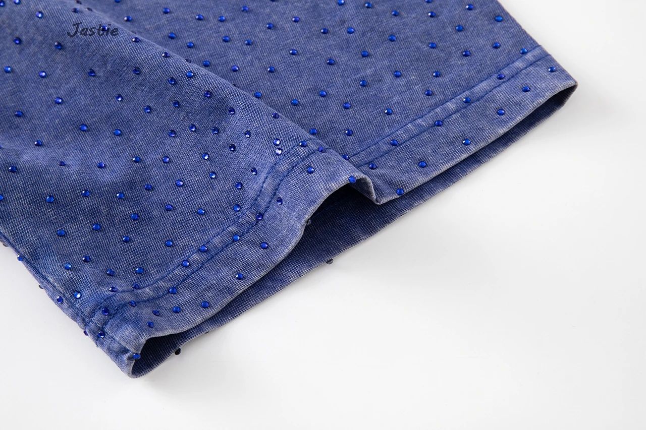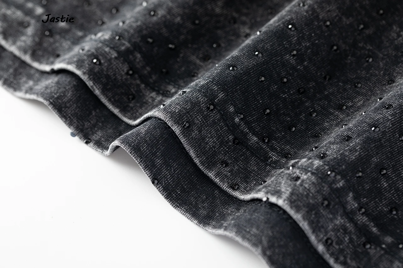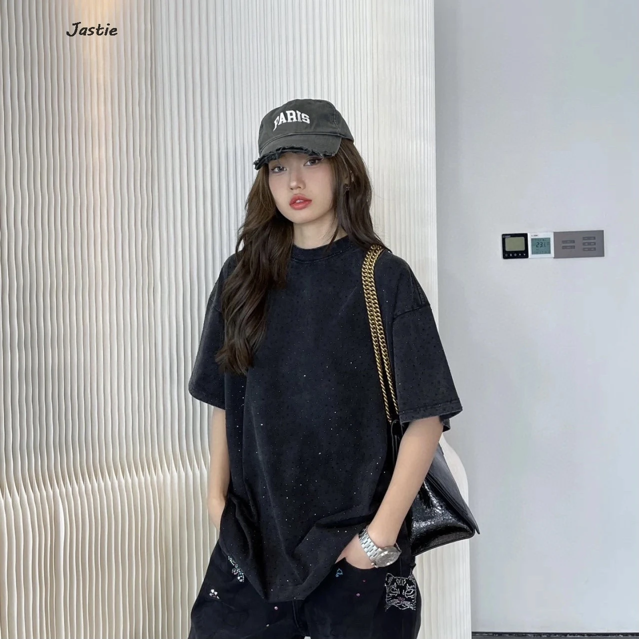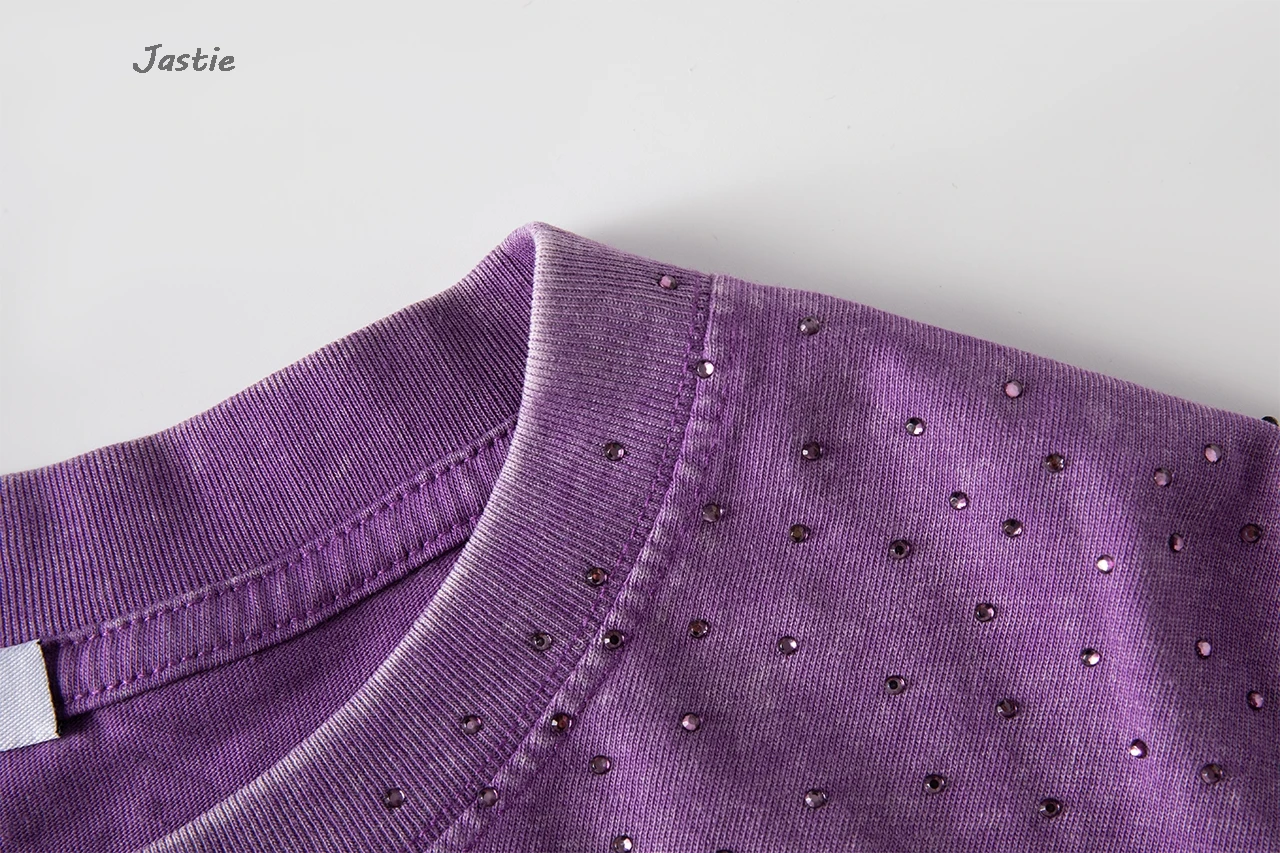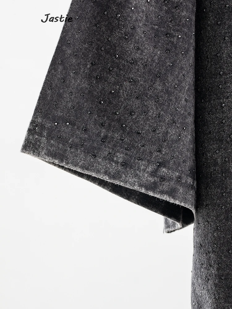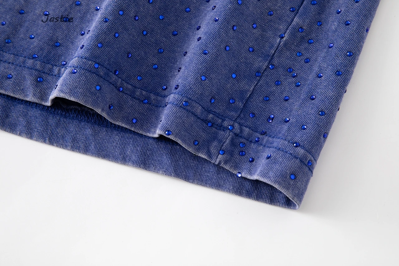 تي شيرت نسائي كاجوال من حجر الراين الأسود ، رقبة مستديرة ، تيشيرتات بأكمام قصيرة ، فضفاض ، متوسط الطول ، ملابس نساء الشوارع ، الصيف
