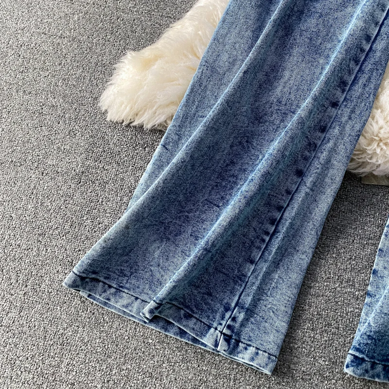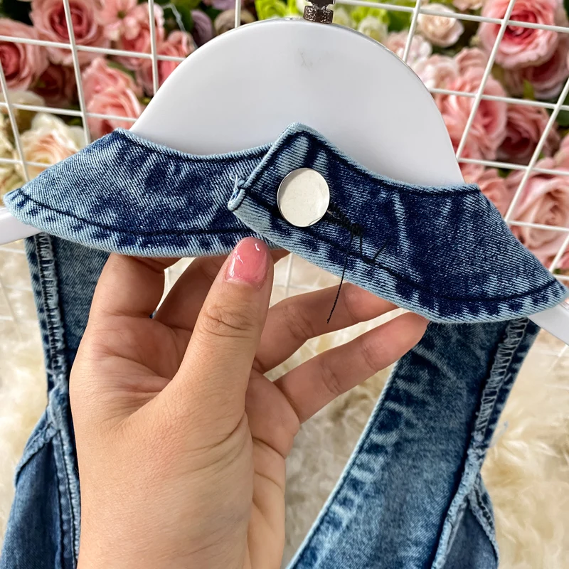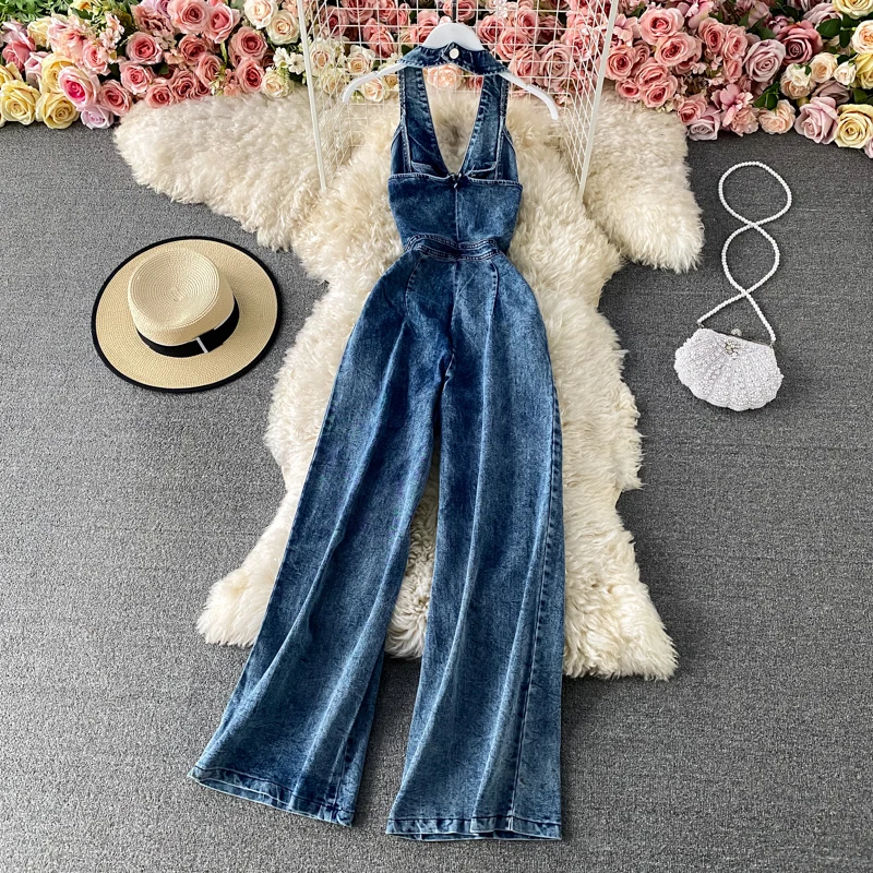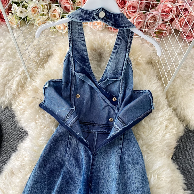 ثوب فضفاض لصيف 2023 جمبسوت نسائي جديد غير رسمي من قماش الدنيم القطني بدون أكمام وظهر مكشوف ورقبة رسن بناطيل وزرة