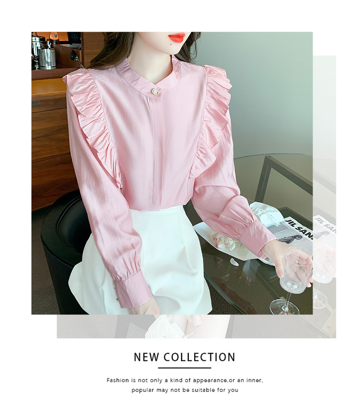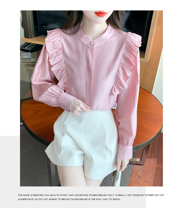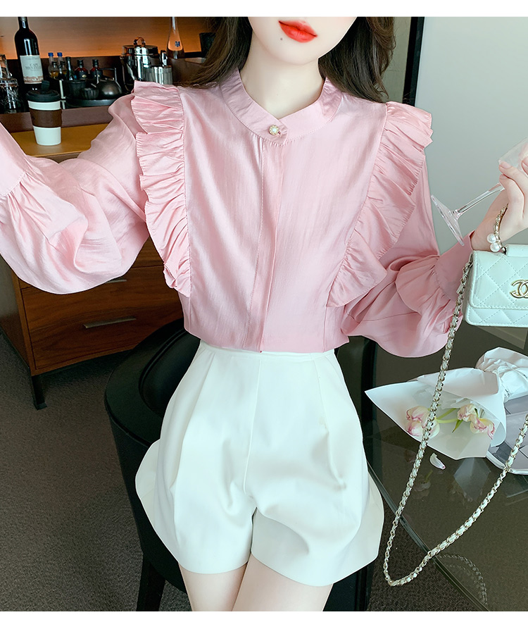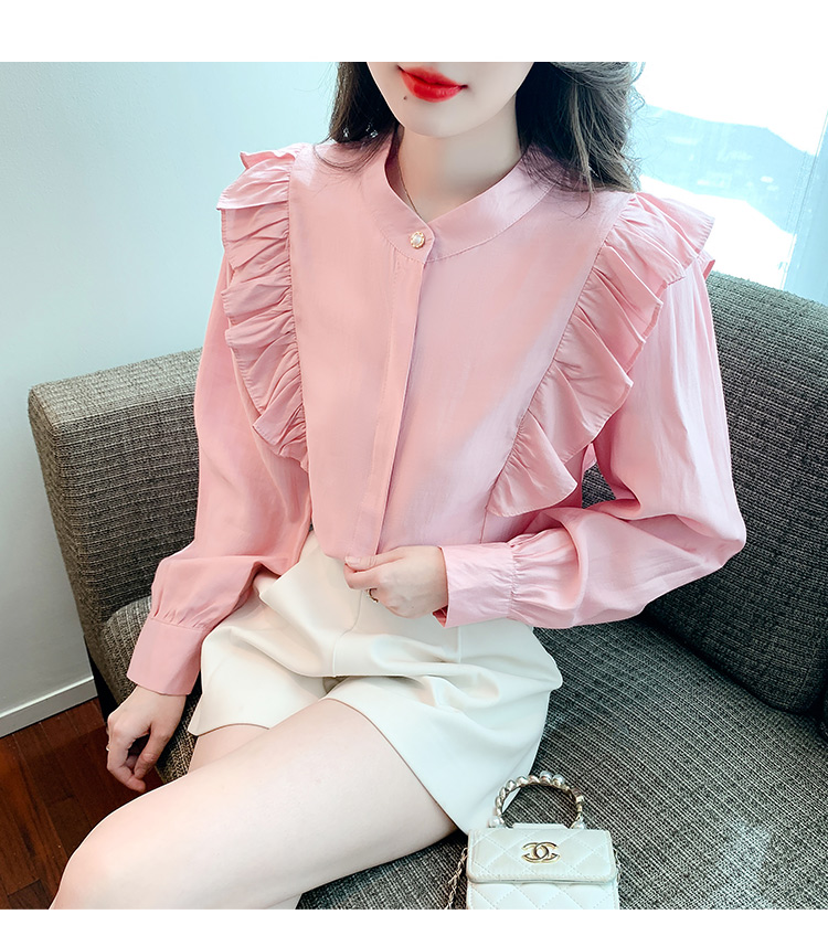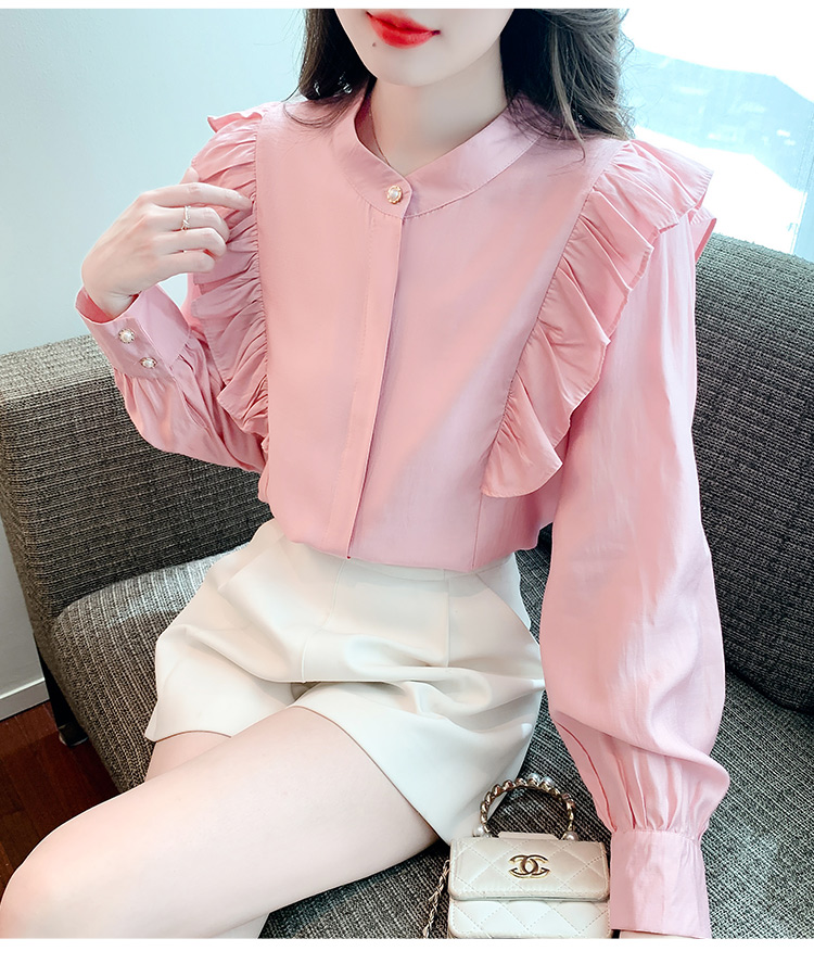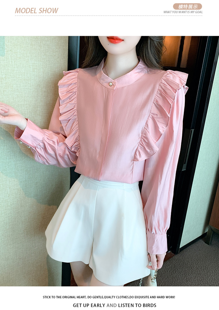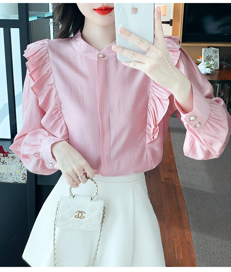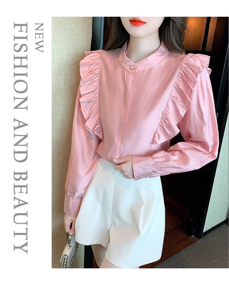 ربيع جديد الكشكشة طويلة الأكمام النساء القمصان أزياء الخريف الوردي س الرقبة البلوزات أنيقة عارضة الشيفون الملابس