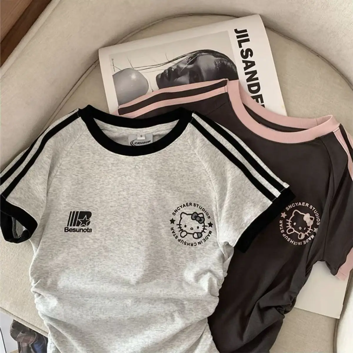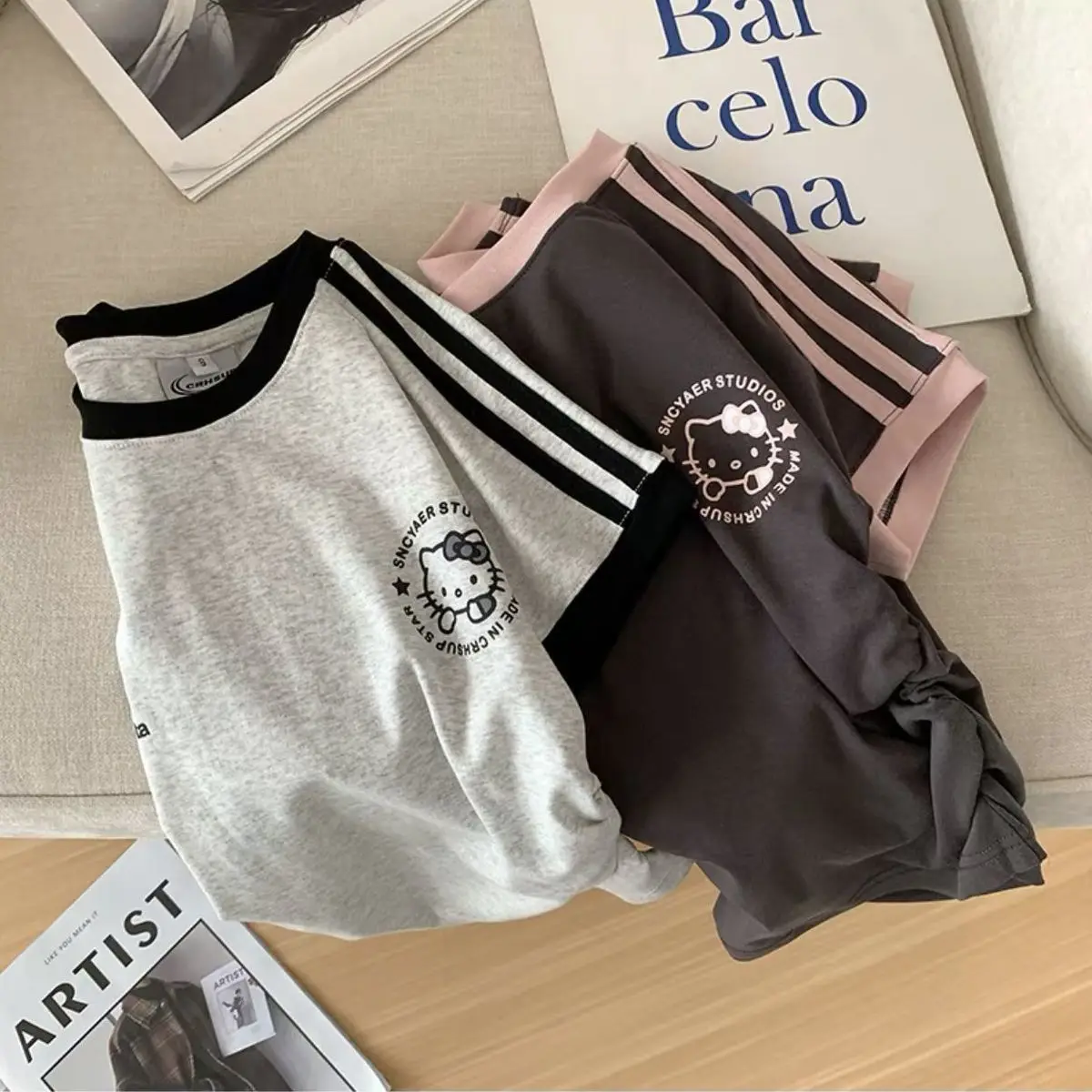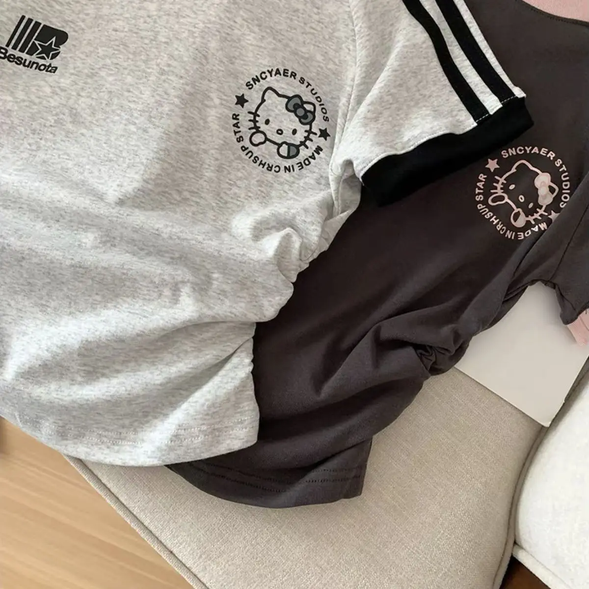 سانريوس مرحبا كيتي فتاة القطن تي شيرت أنيمي الصيف قصيرة الأكمام بلايز لطيف ملابس رياضية فضفاضة غير رسمية الكرتون طاقم الرقبة البلوز