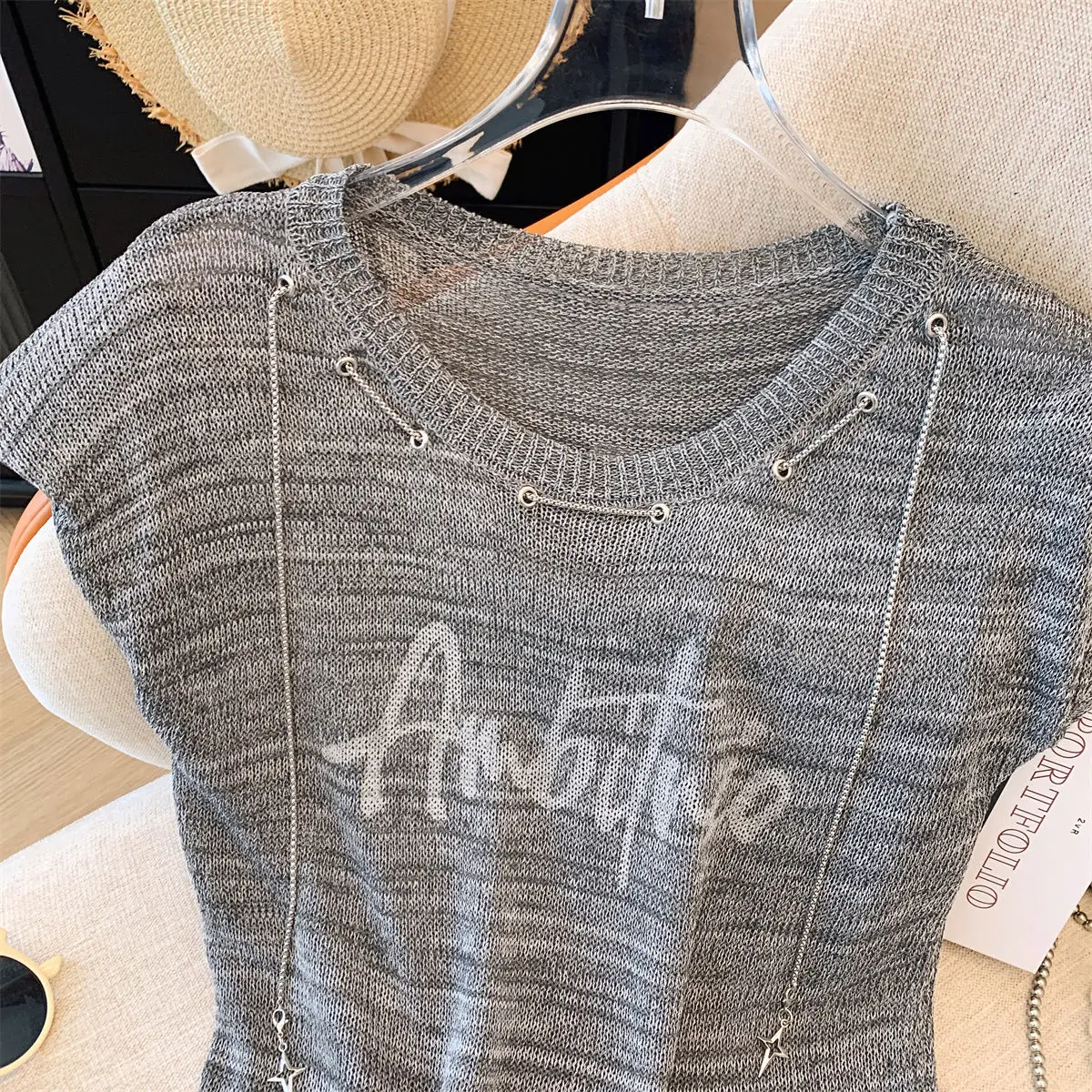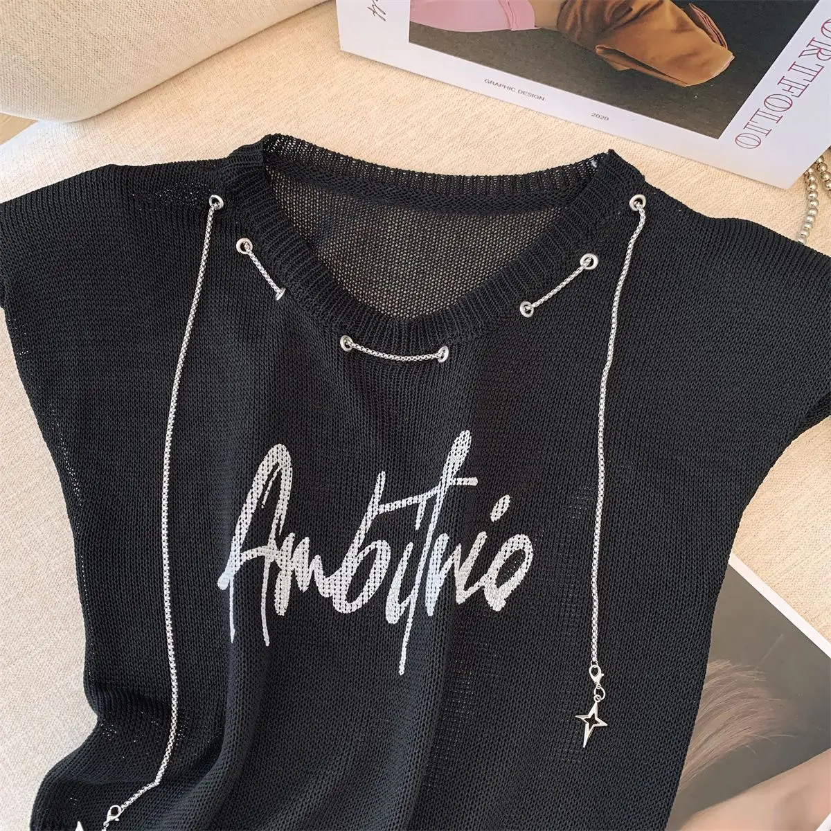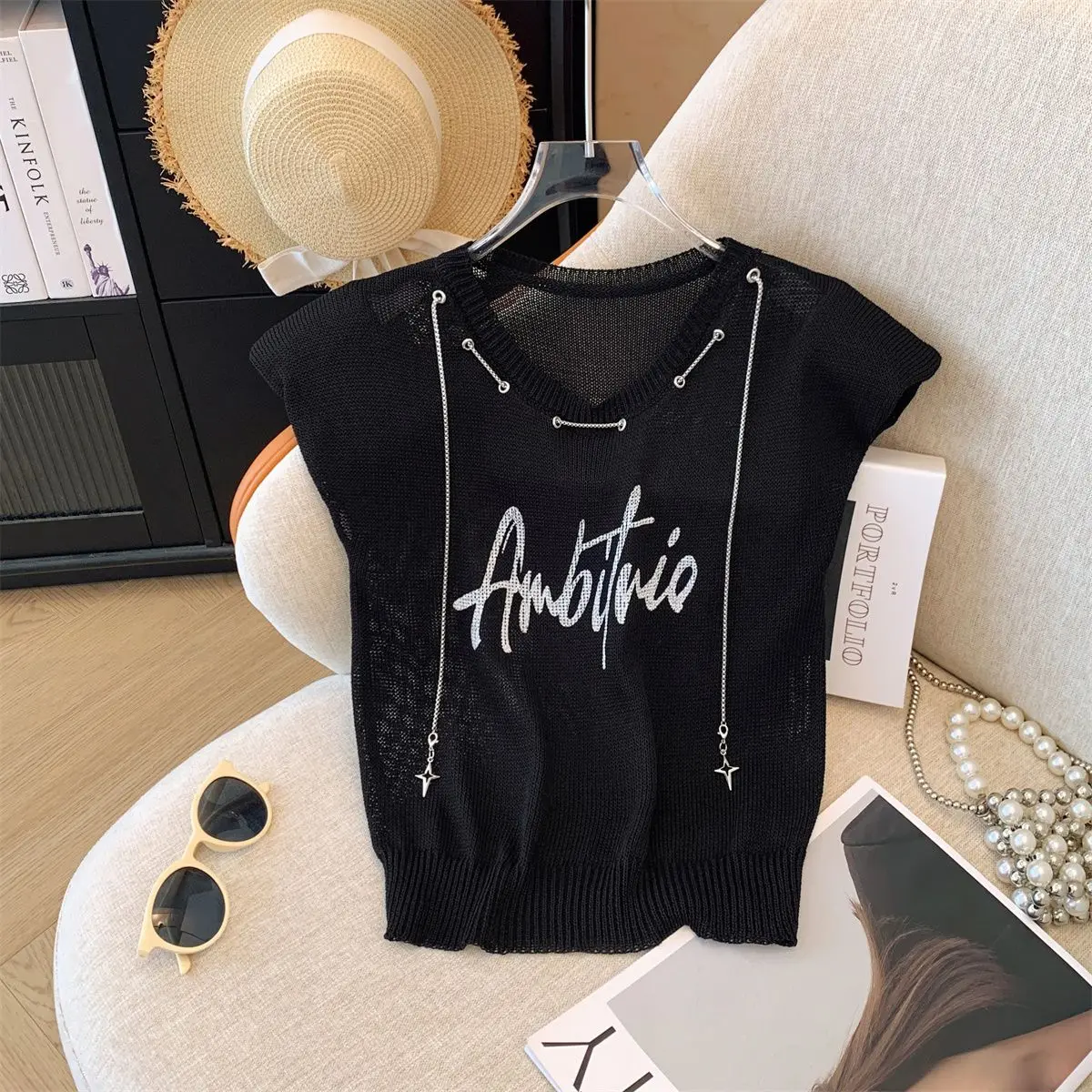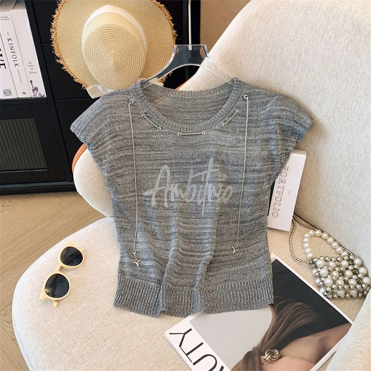 سترة برقبة دائرية بطباعة أحادية الشكل ، بلوزة عصرية مقطوعة ، سترة بأكمام فضفاضة وضيقة متعددة الاستخدامات ، سلسلة ، جديدة ، صيفية