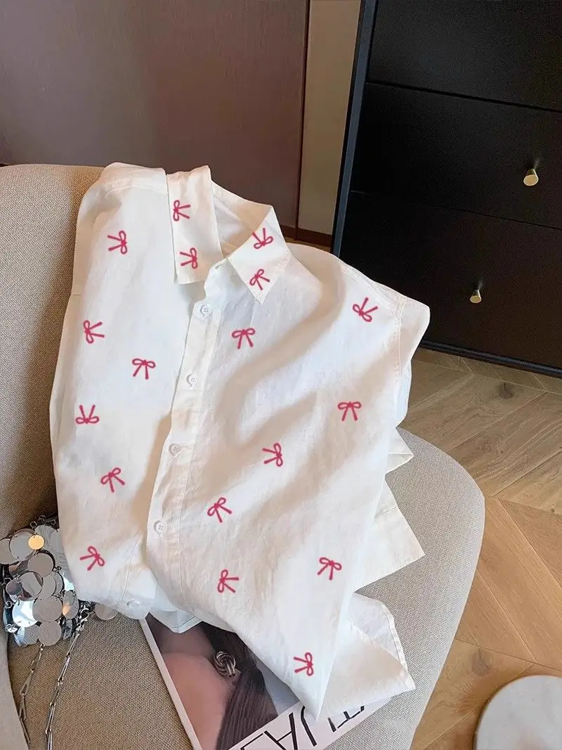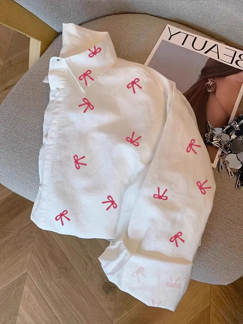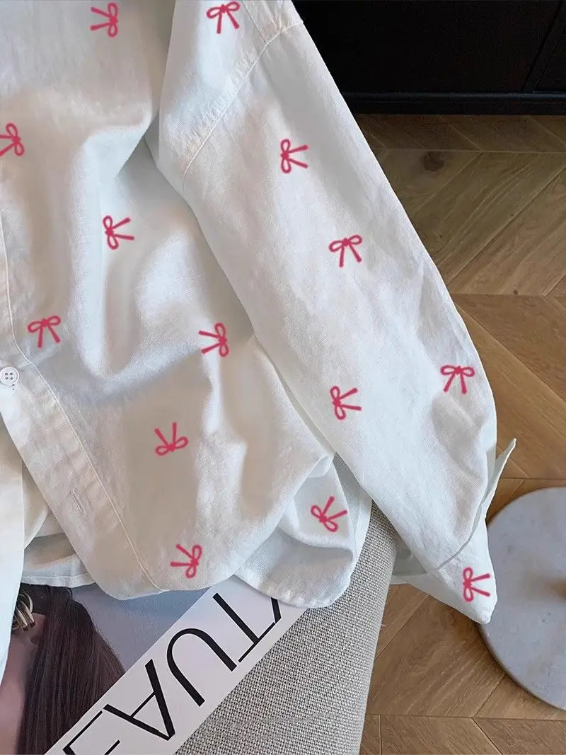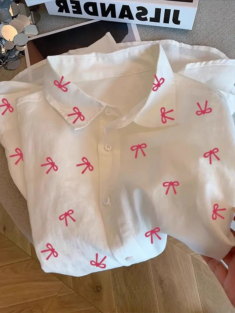 شاطئ جميل الوردي القوس كامل مطبوعة Kawaii زر حتى قمصان طويلة الأكمام بولو طوق بلوزة فضفاضة معاطف الصيف عادية الحلو النساء