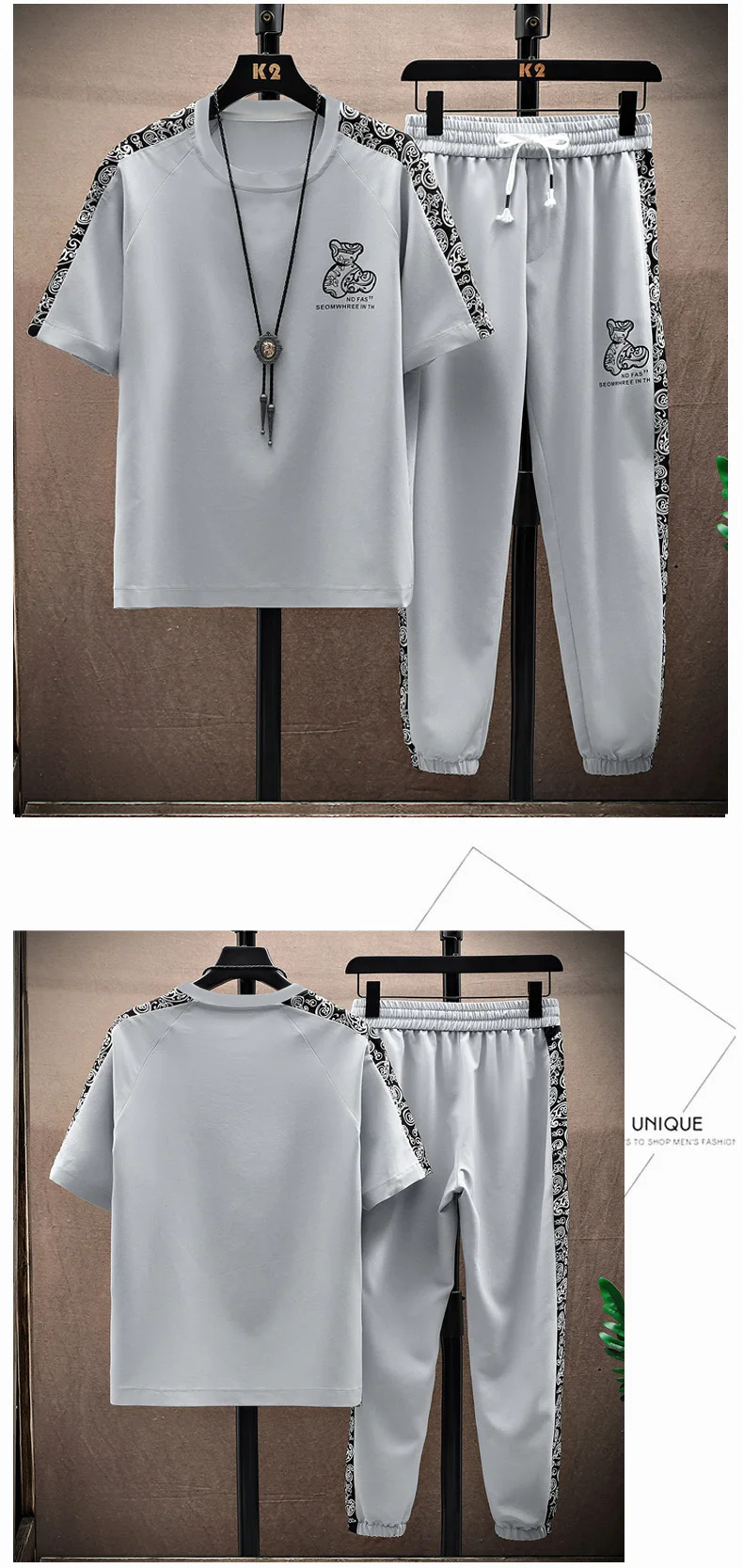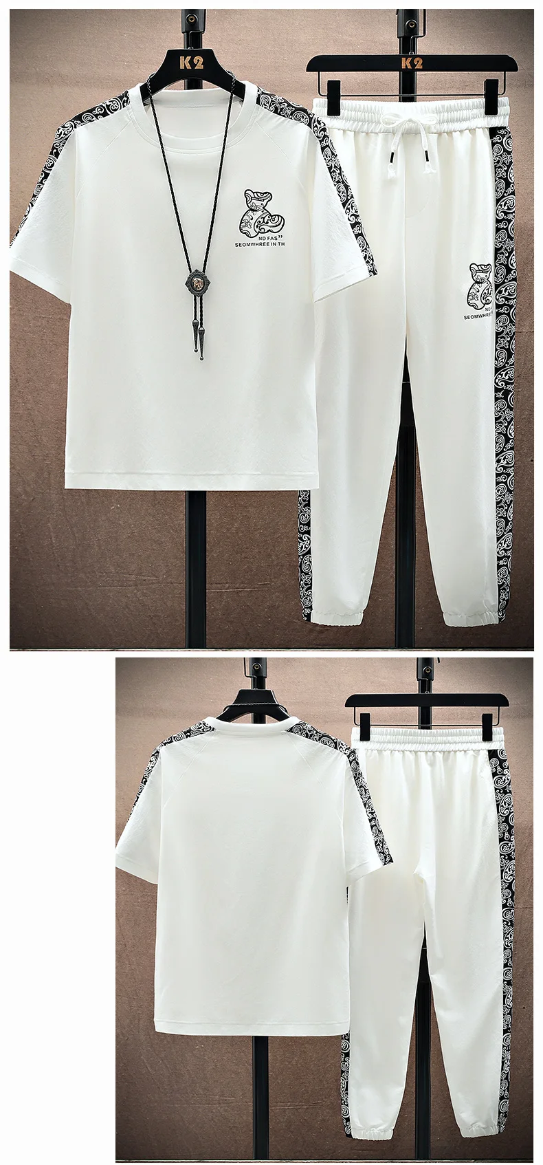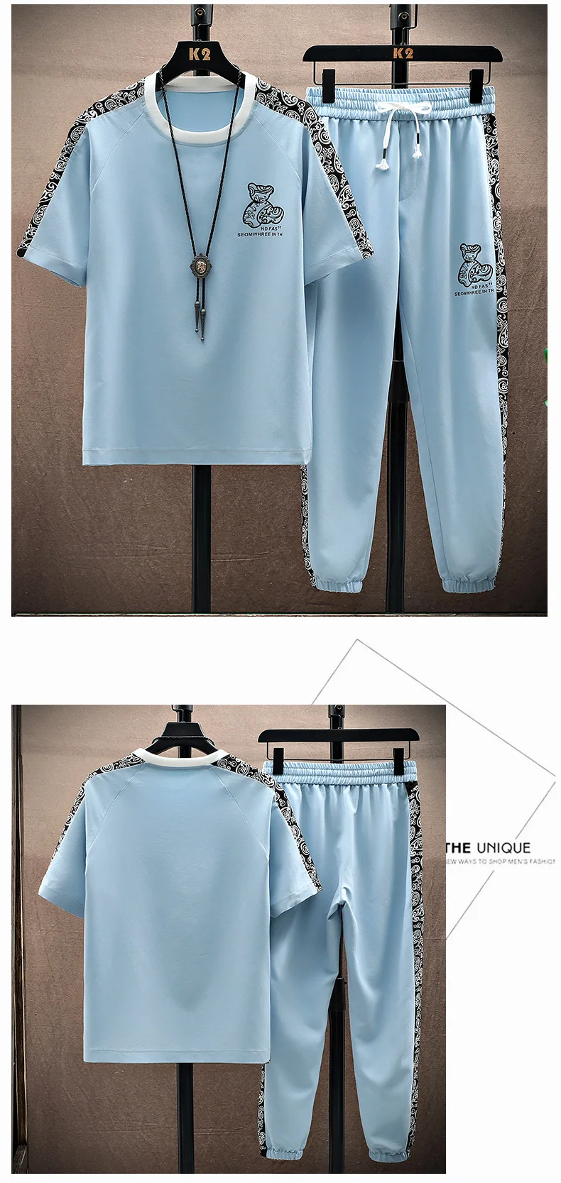 طقم بذلة رياضية من الحرير الجليدي للرجال ، تي شيرت وبنطال بأكمام قصيرة ، بنطال رياضي غير رسمي كلاسيكي ، الصيف ، بنطلون ، تيشيرتات على الموضة ، 2