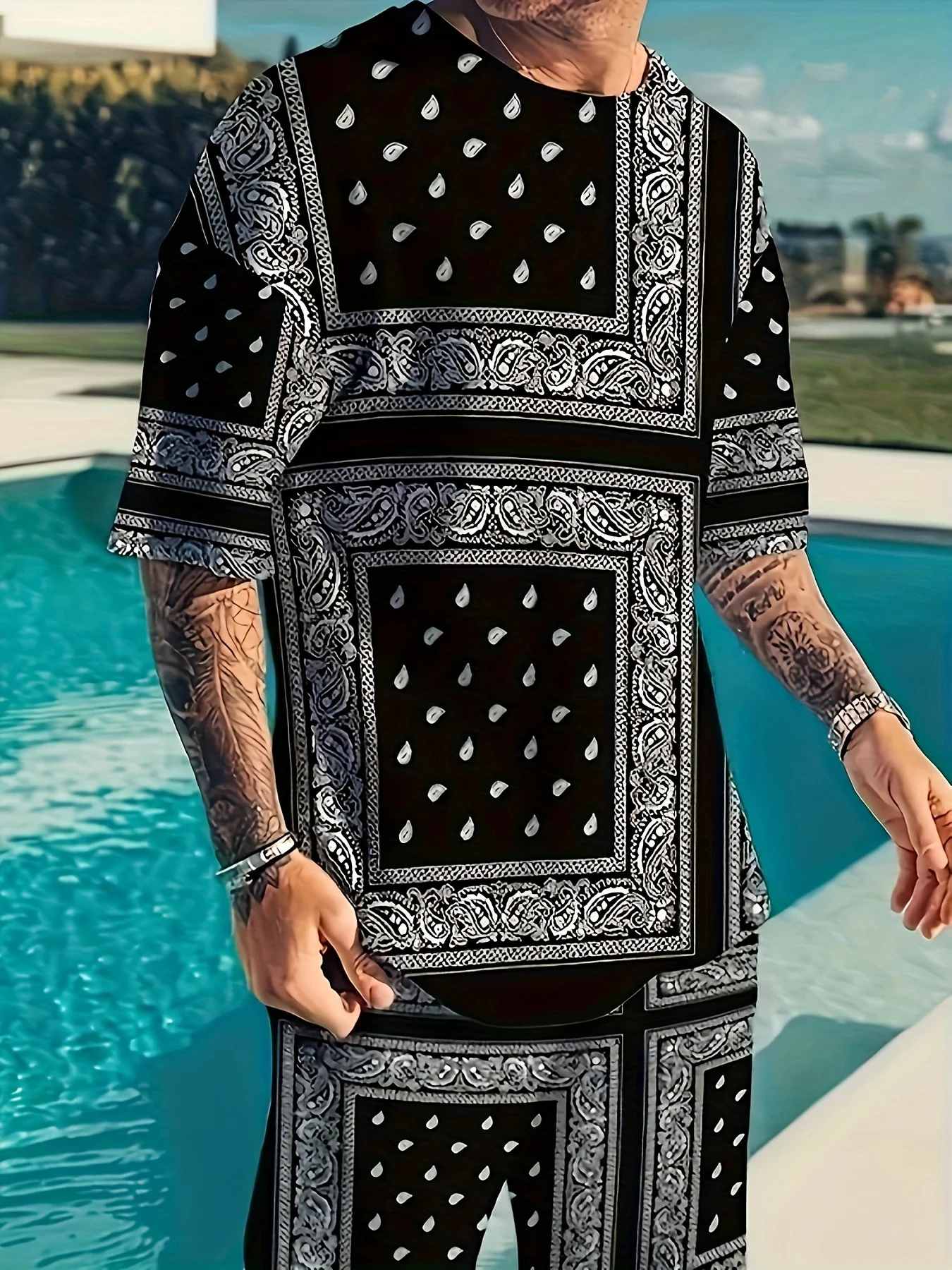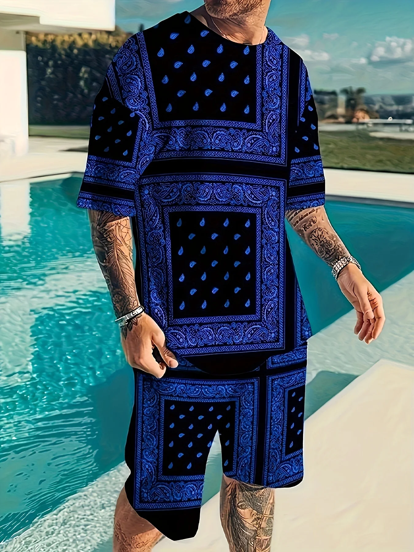 طقم تي شيرت رجالي بطبعة زهرة الكاجو وشورت كاجوال برباط