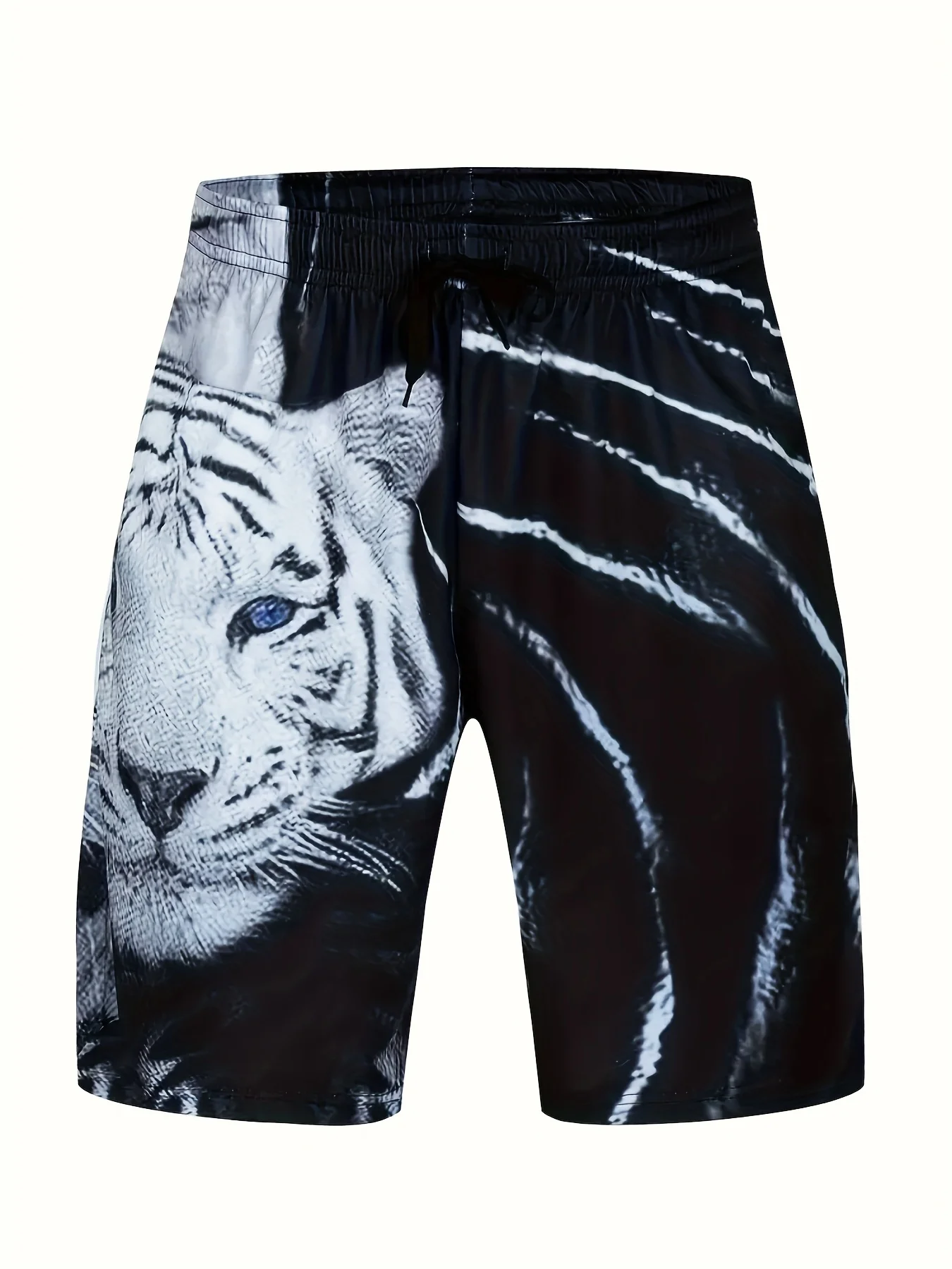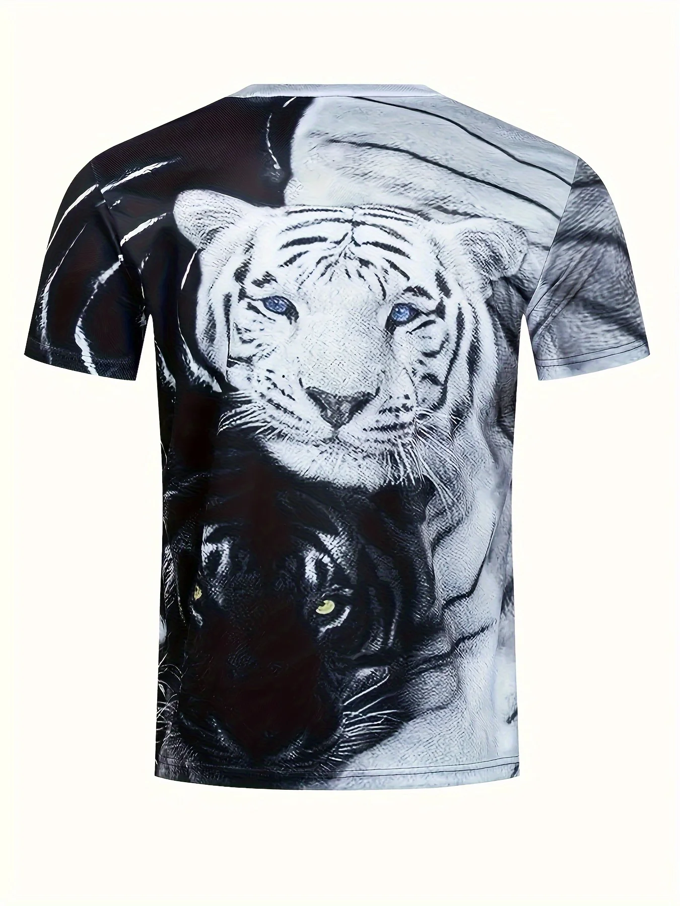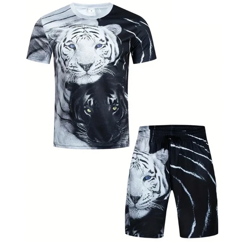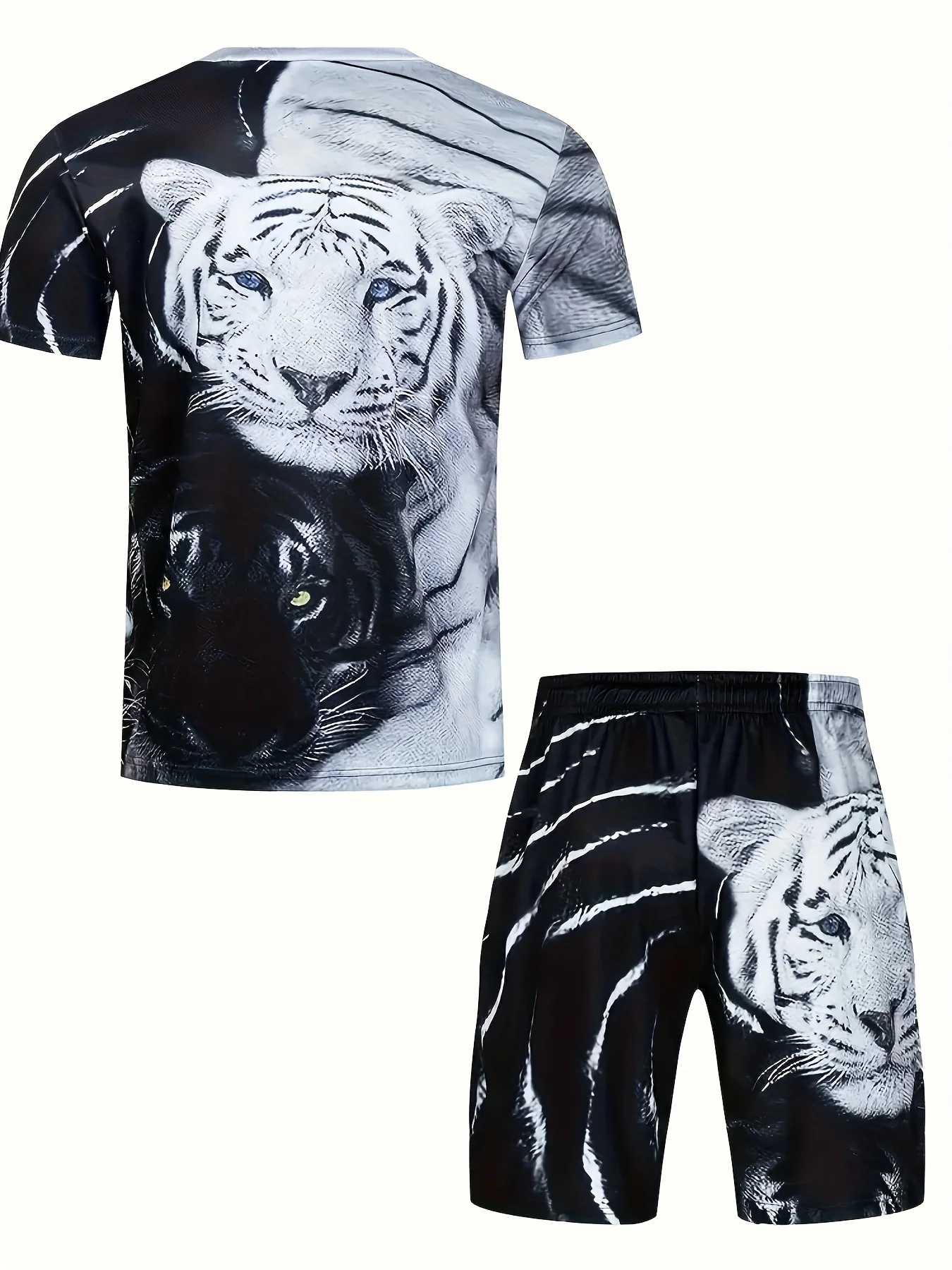 طقم تي شيرت وشورت كاجوال مريح للرجال برقبة دائرية وأكمام قصيرة وطبعة نمر