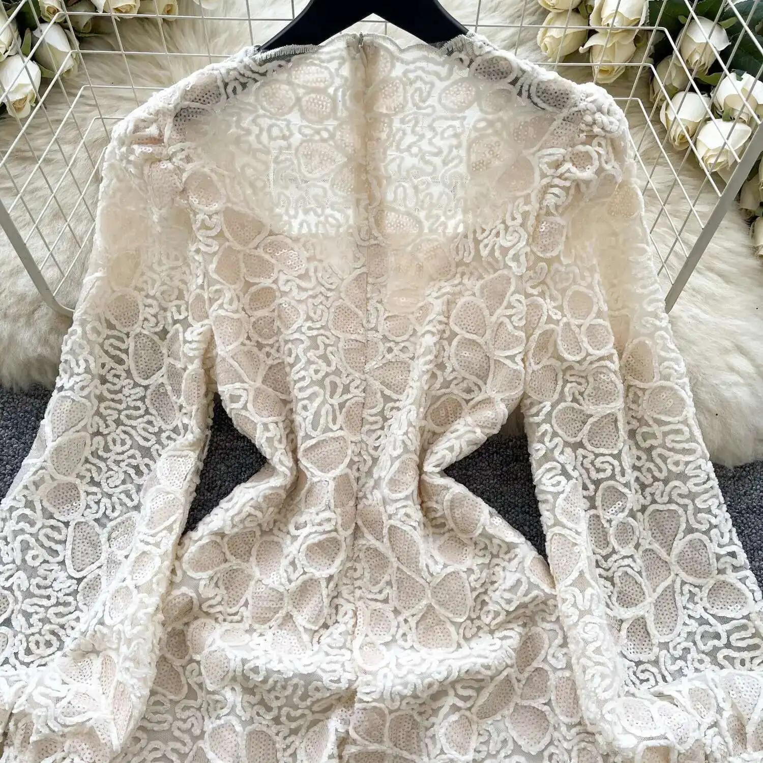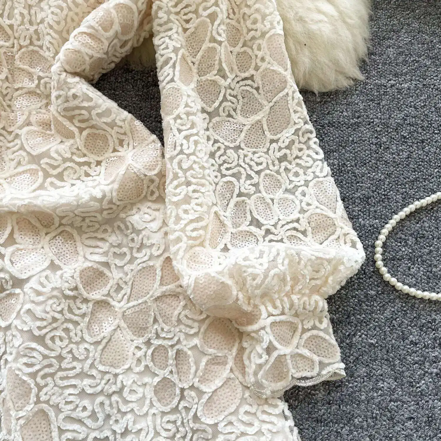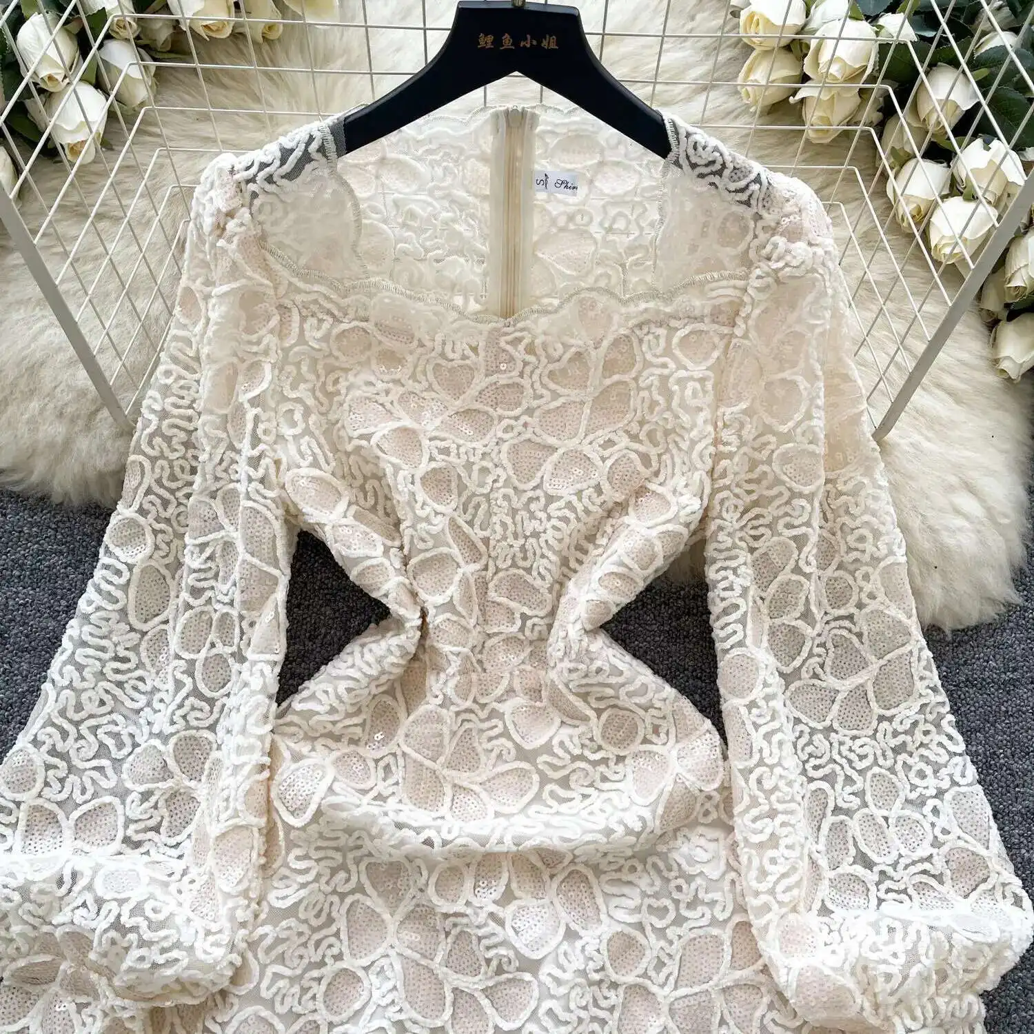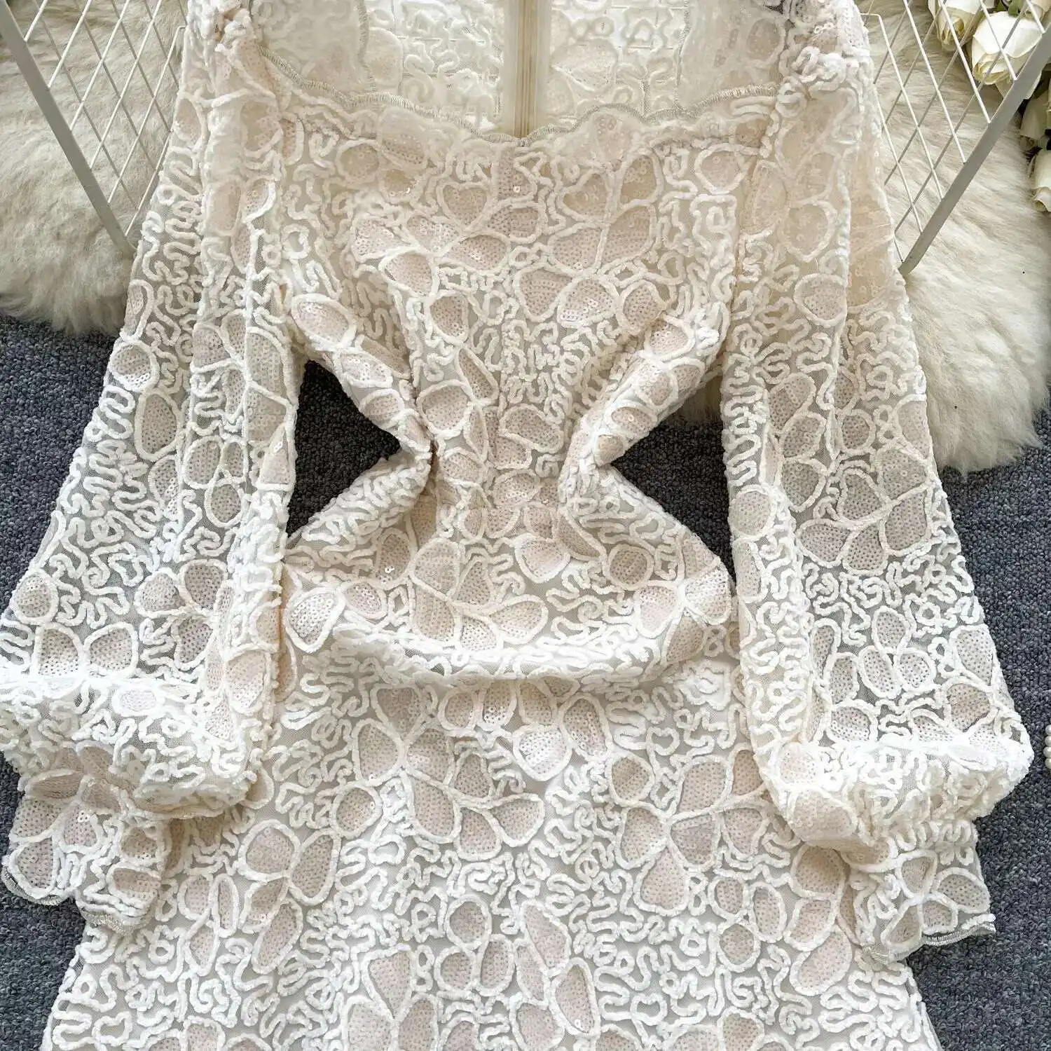 فساتين أنيقة مطرزة بالدانتيل والترتر للنساء للربيع والصيف والعطلات بأكمام طويلة وحفلات مسائية فساتين قصيرة باللون البيج
