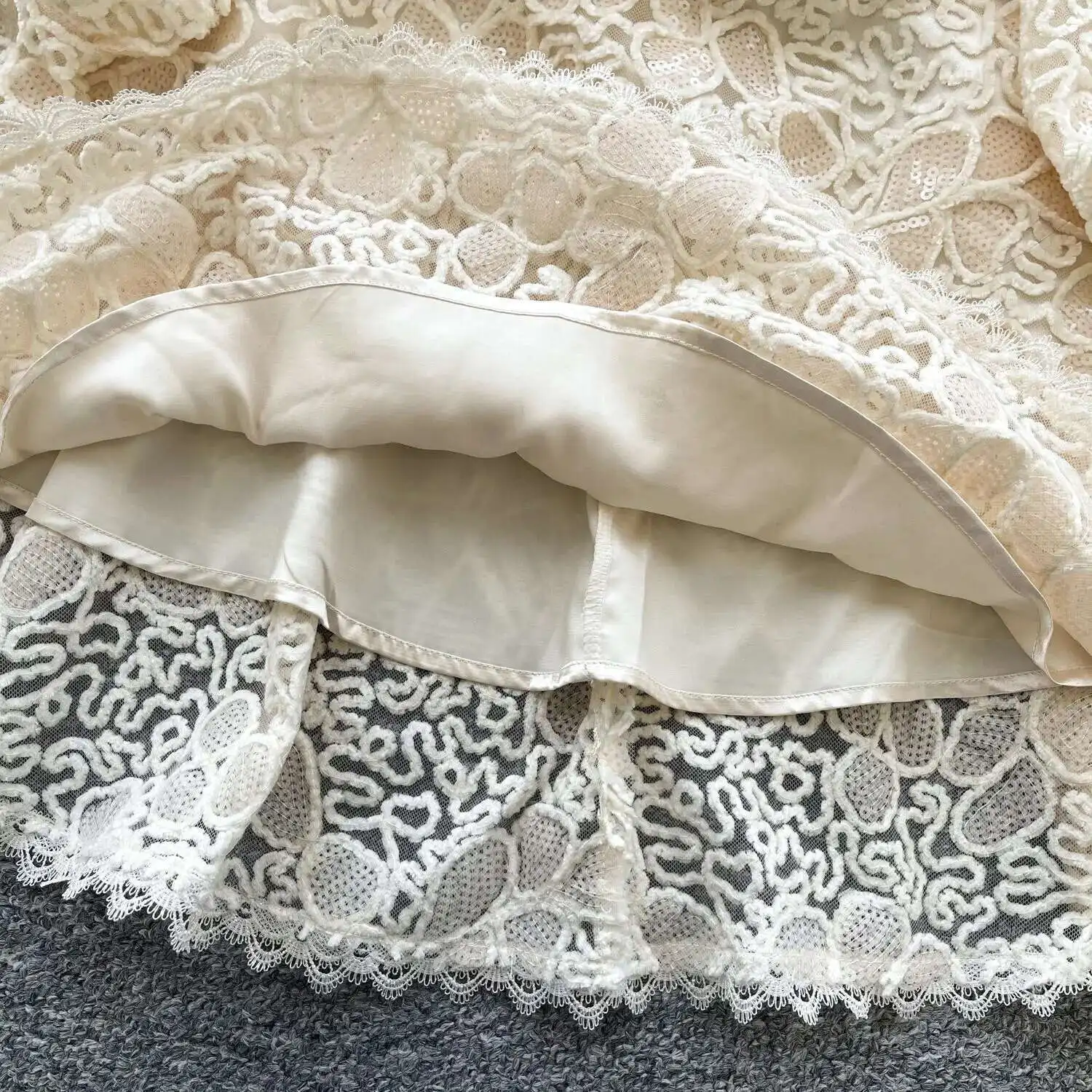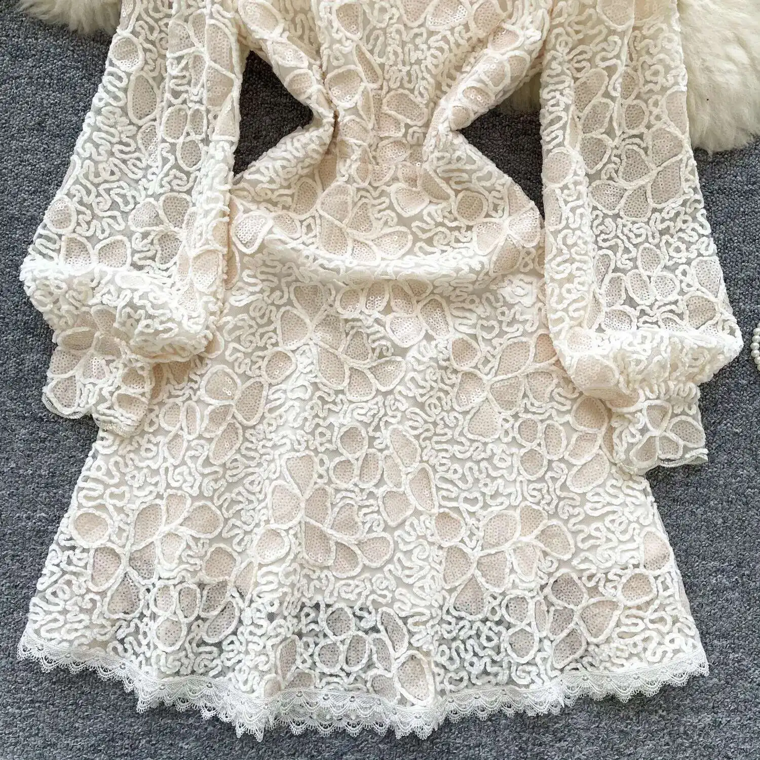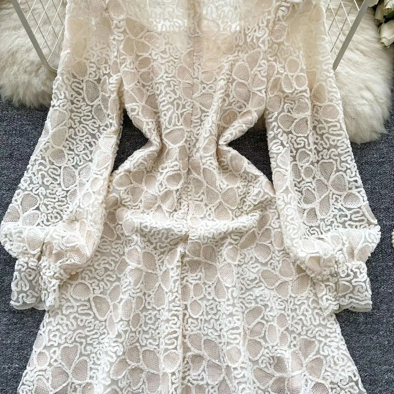 فساتين أنيقة مطرزة بالدانتيل والترتر للنساء للربيع والصيف والعطلات بأكمام طويلة وحفلات مسائية فساتين قصيرة باللون البيج