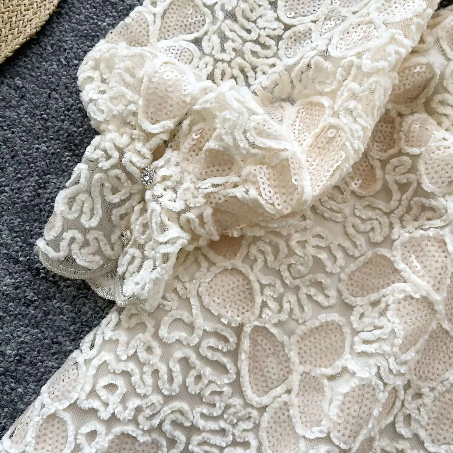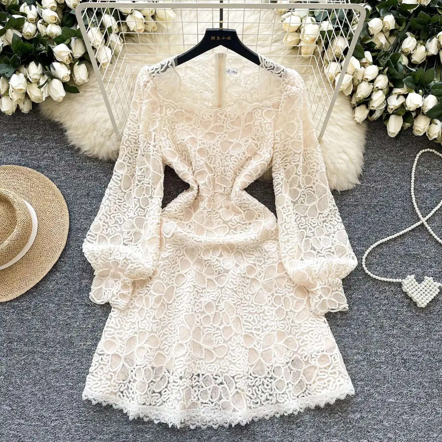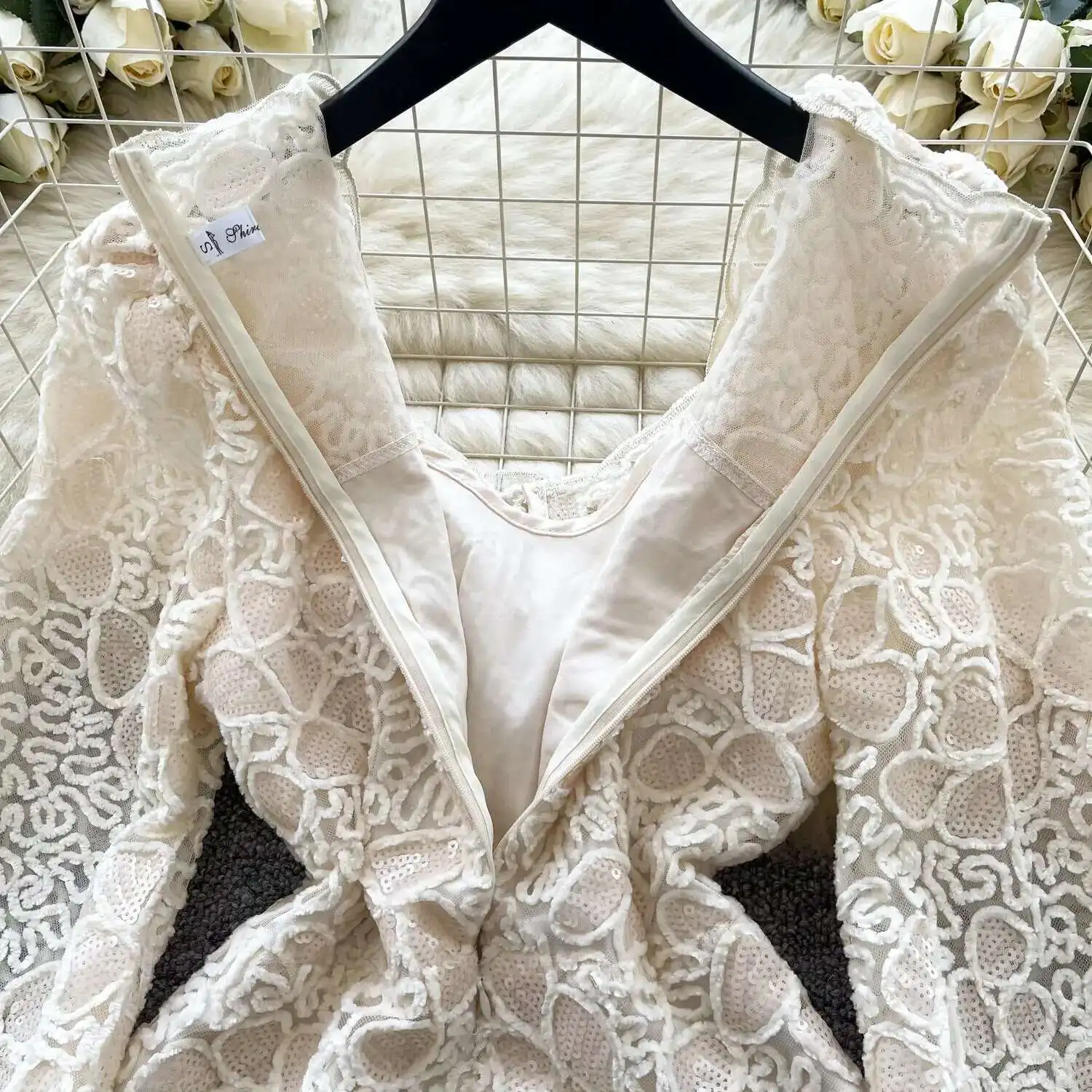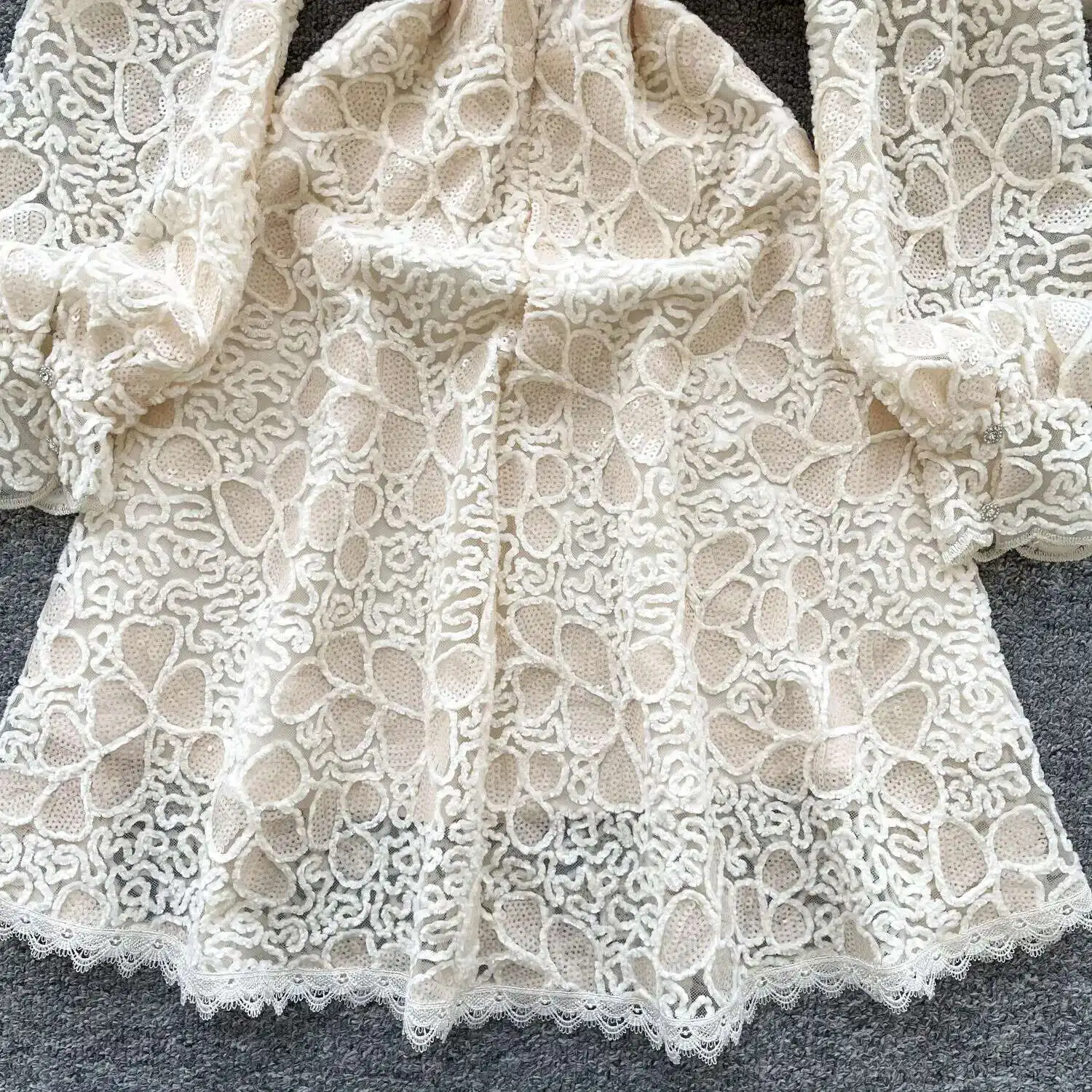 فساتين أنيقة مطرزة بالدانتيل والترتر للنساء للربيع والصيف والعطلات بأكمام طويلة وحفلات مسائية فساتين قصيرة باللون البيج