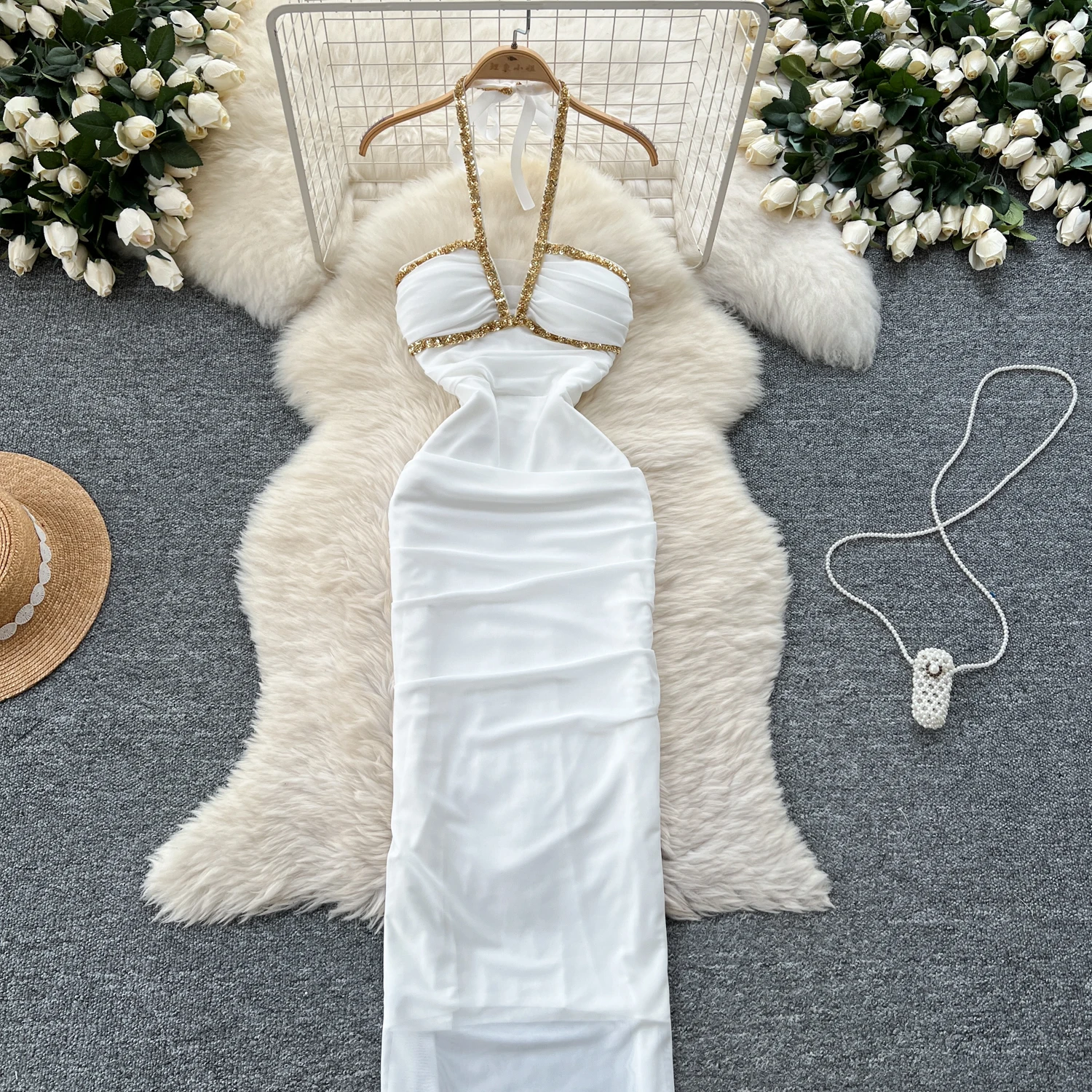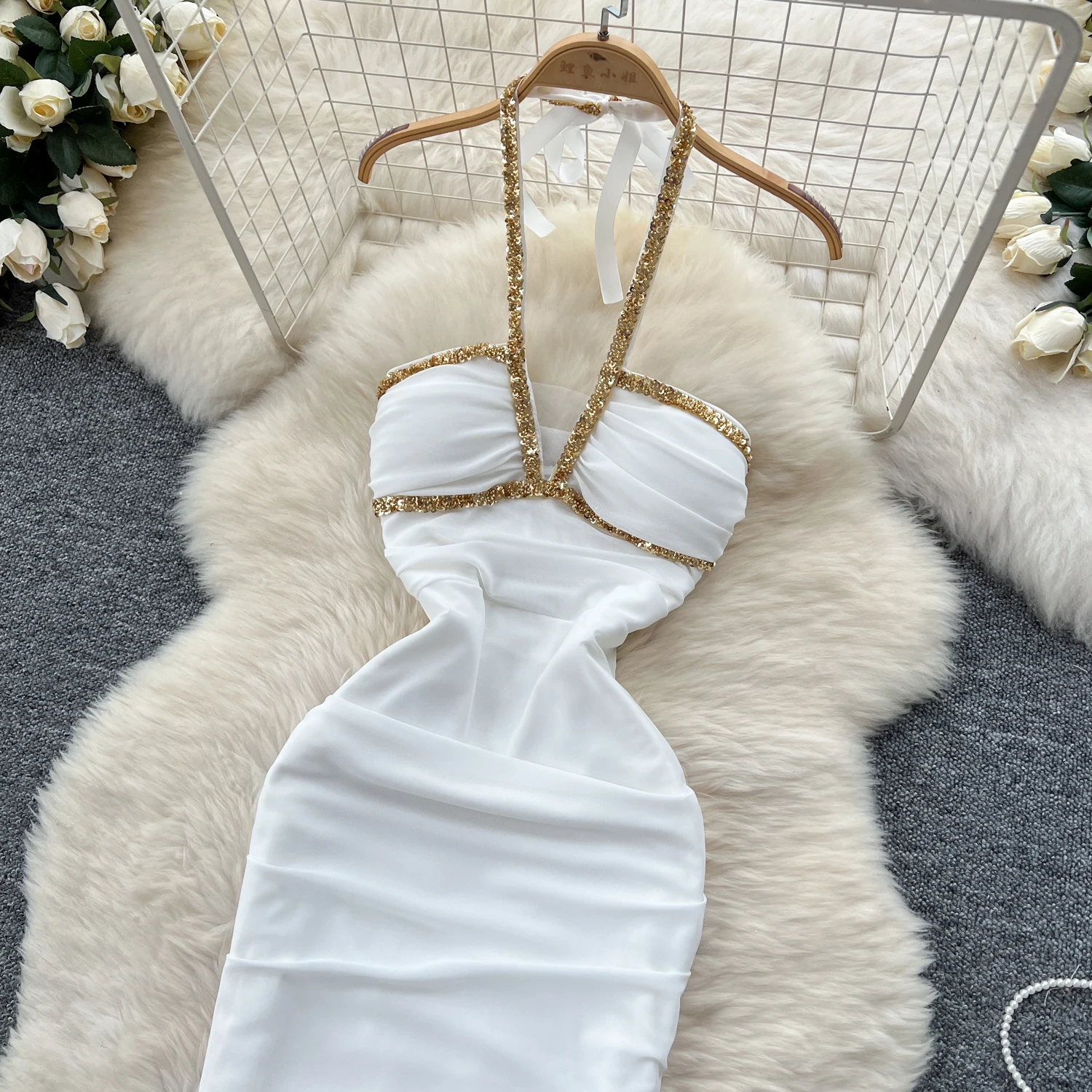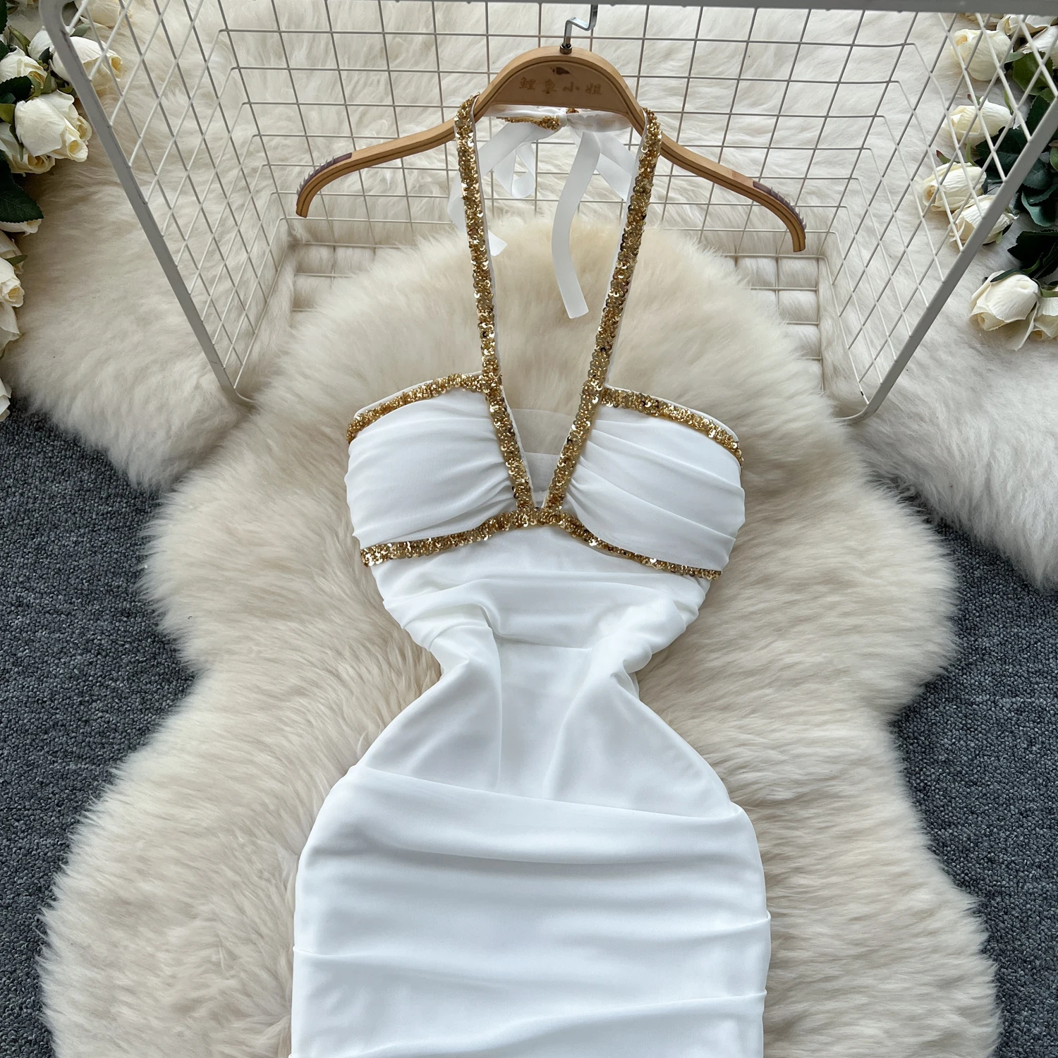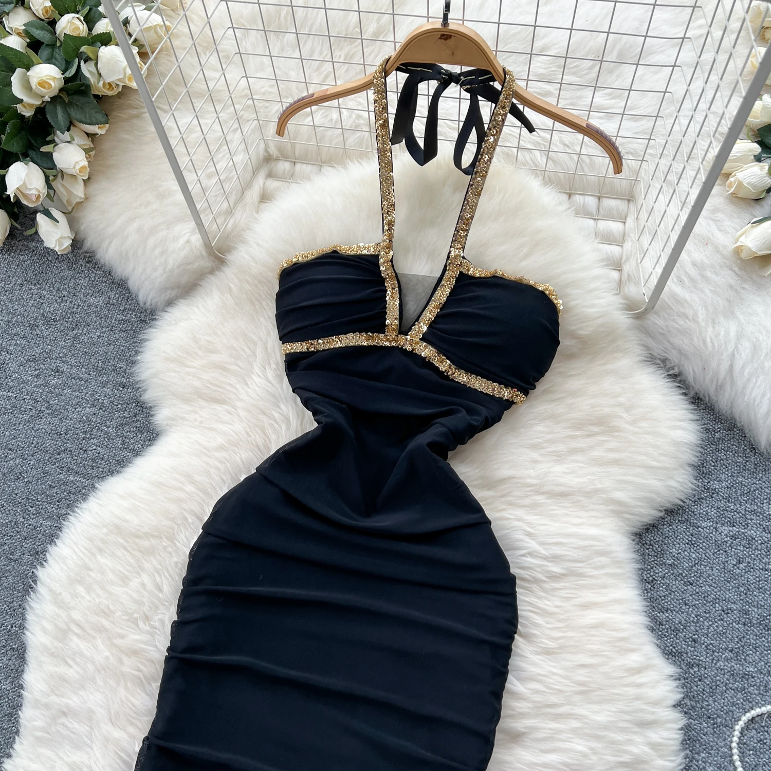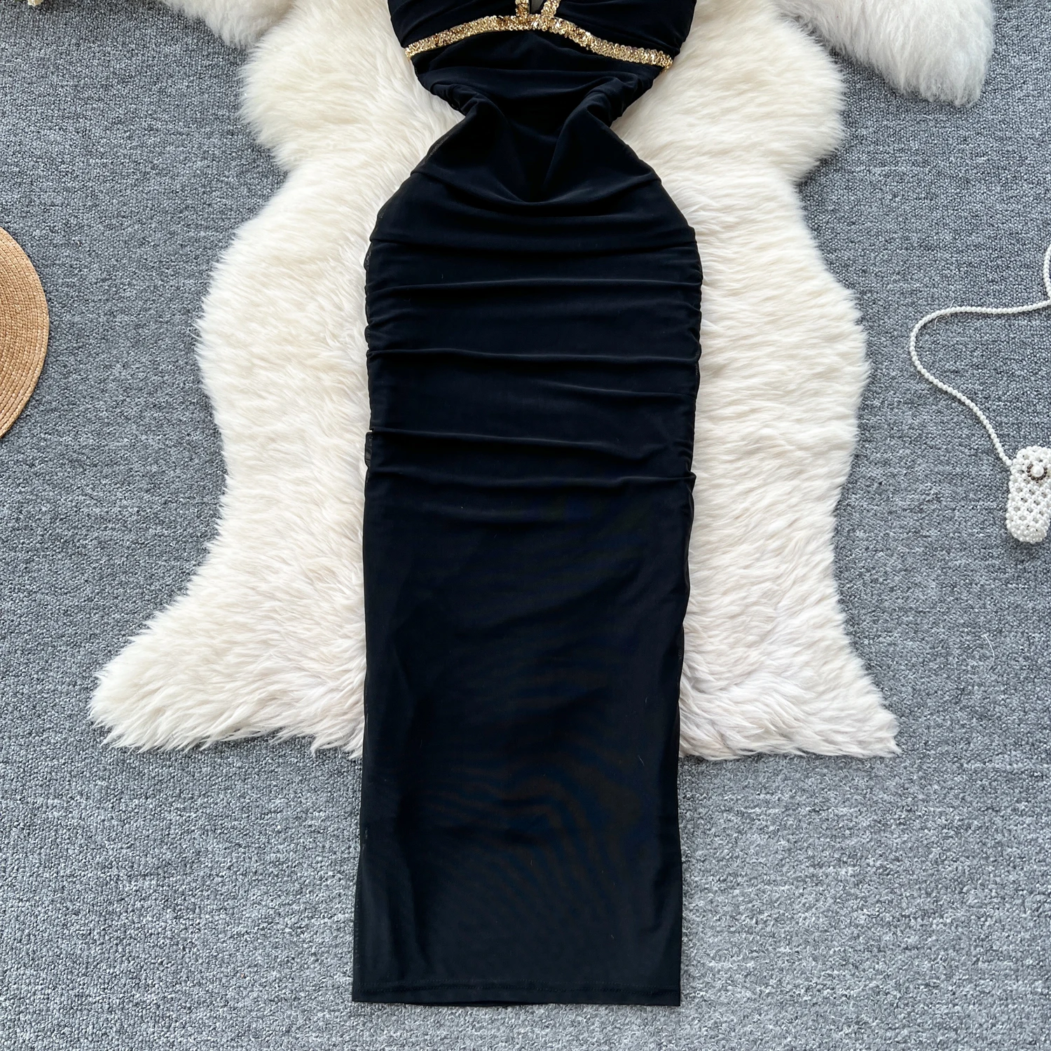 فستان شبكي مثير مزين بالترتر بدون أكتاف مرن نحيف Bodycon أنيق للحفلات والنوادي ميدي فيستدوس عتيق بأشرطة بوهو للنساء