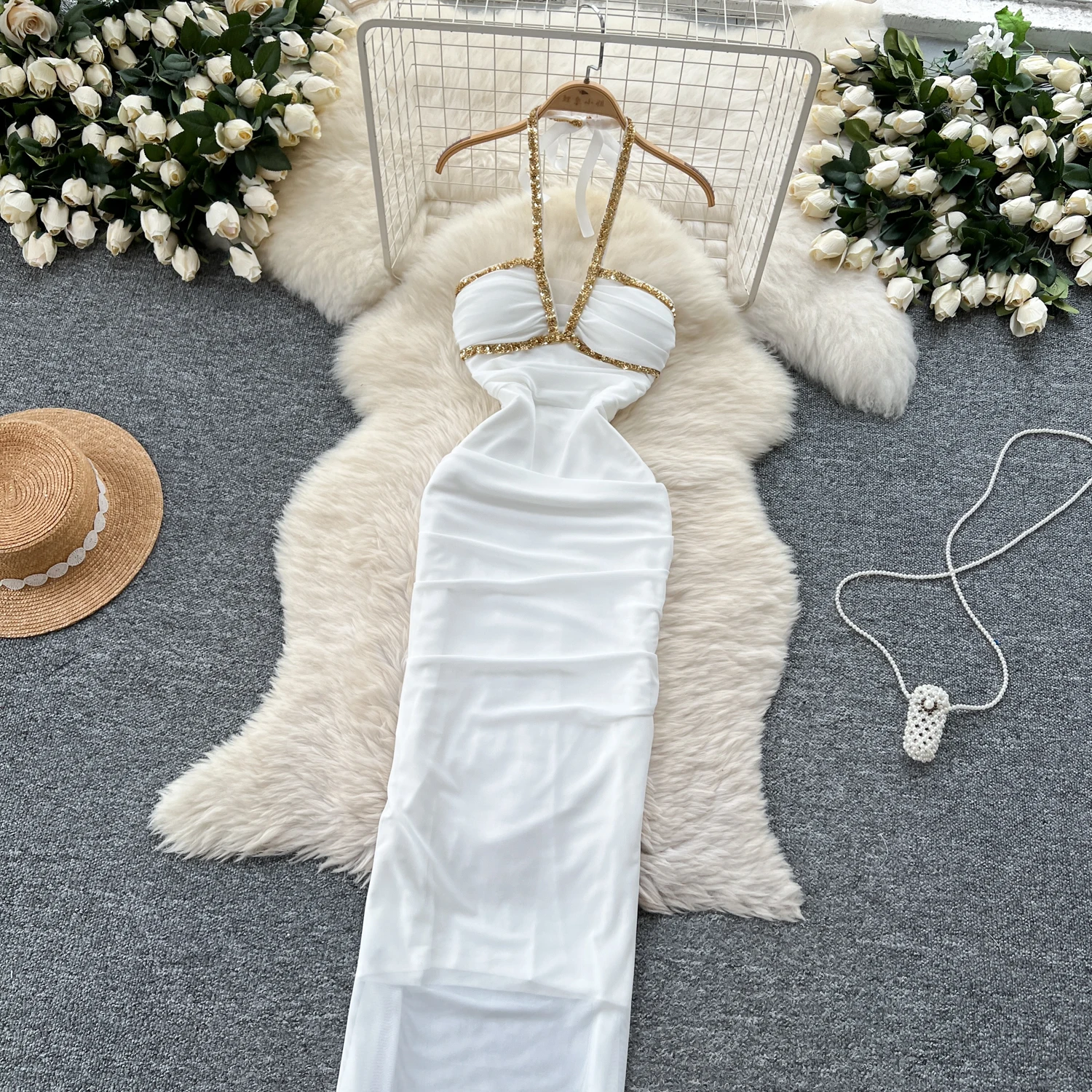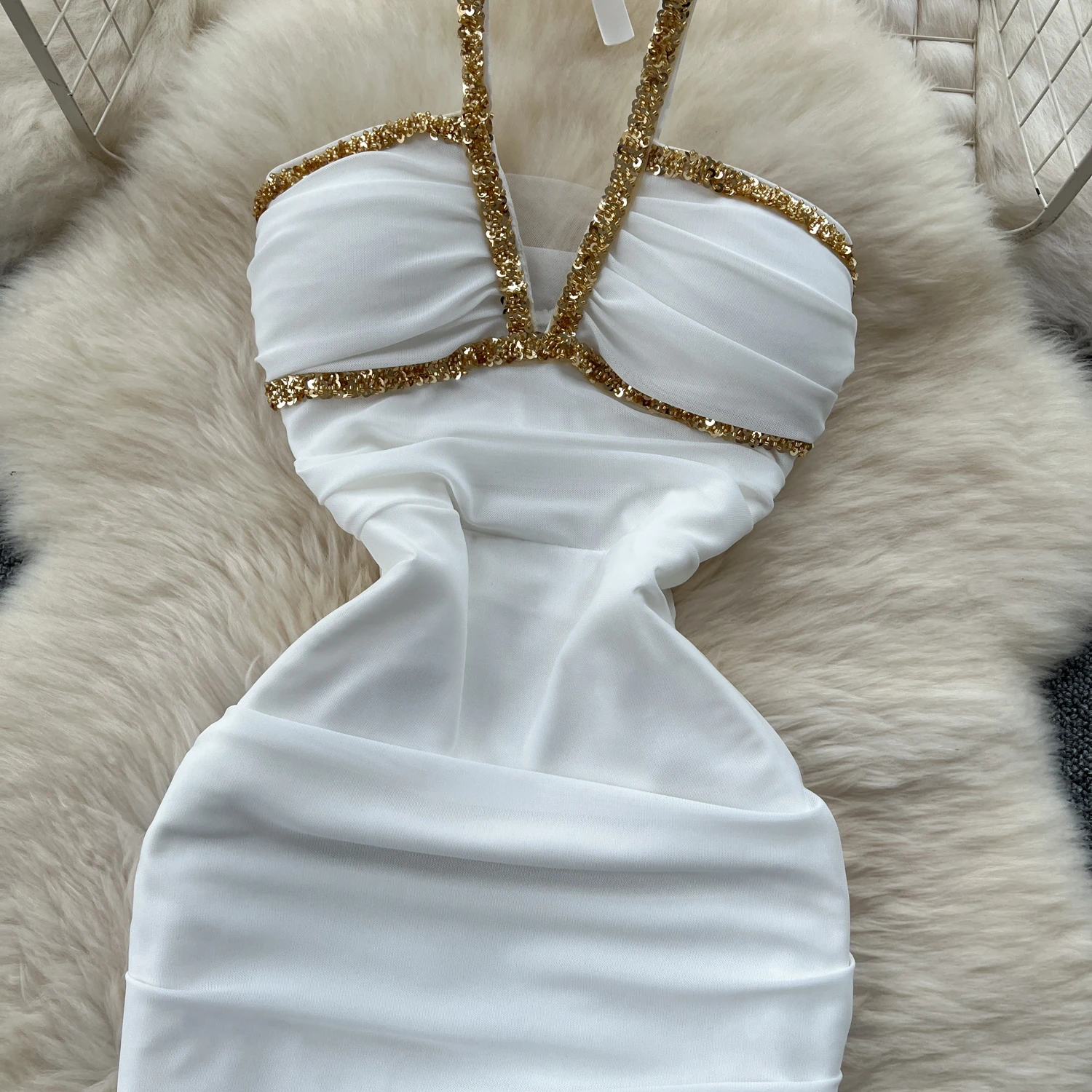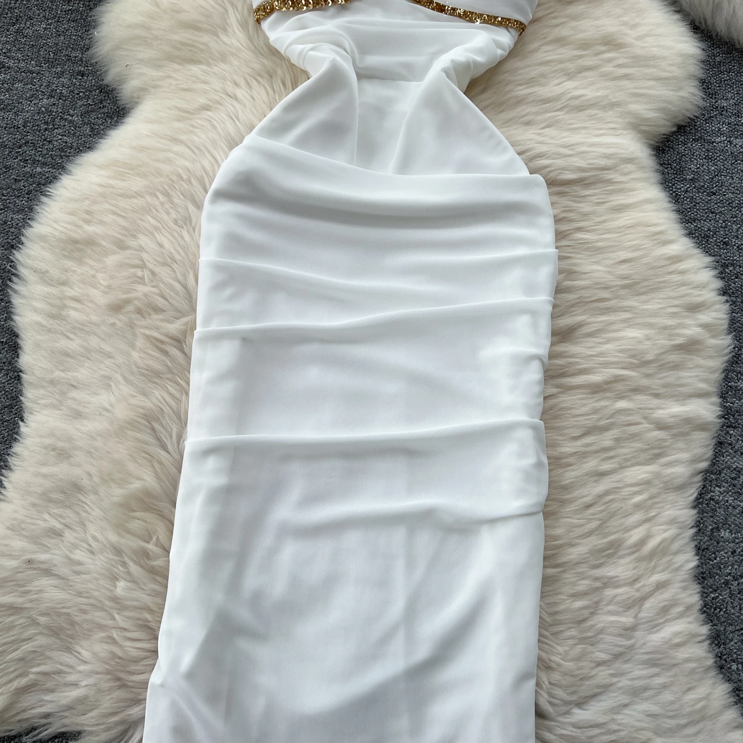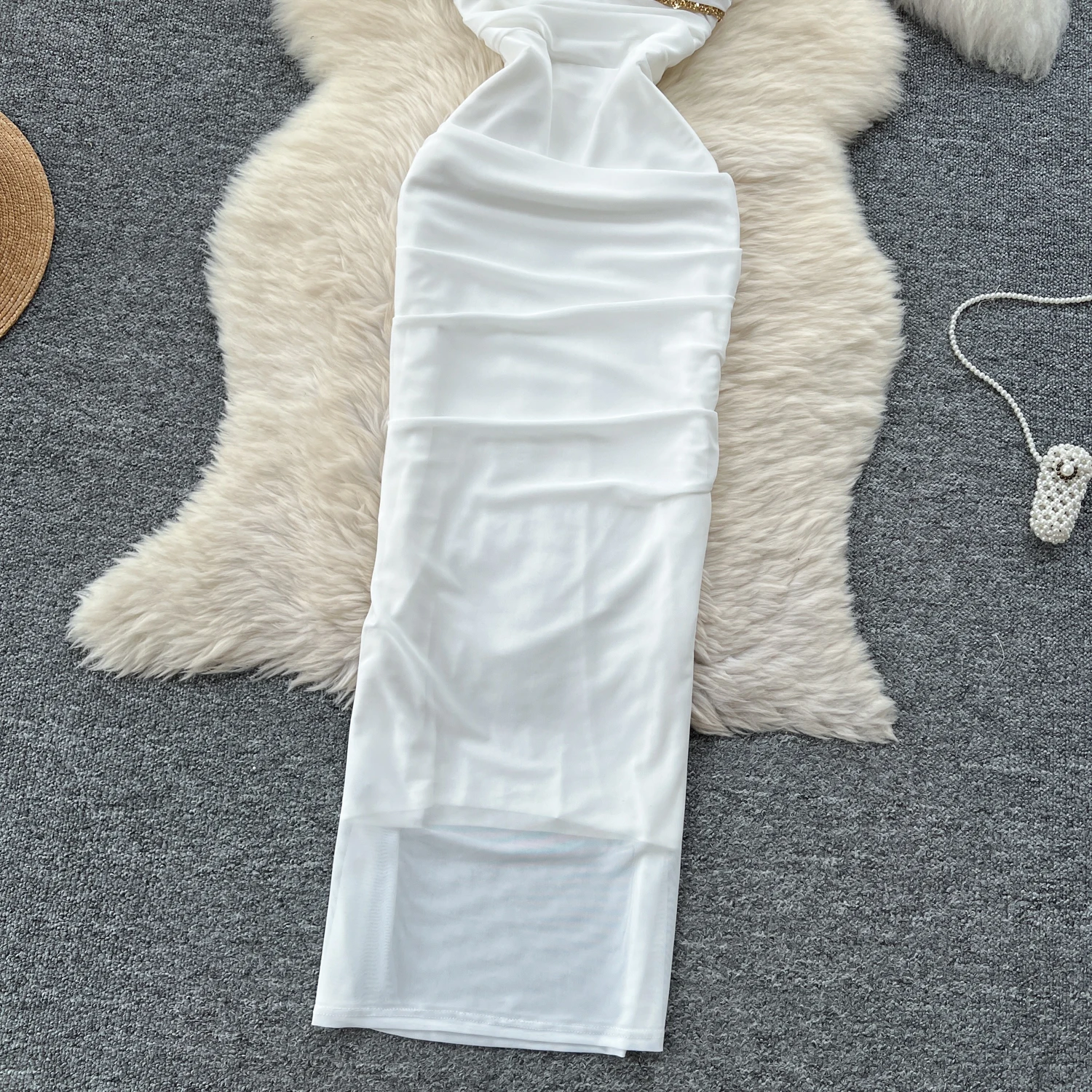 فستان شبكي مثير مزين بالترتر بدون أكتاف مرن نحيف Bodycon أنيق للحفلات والنوادي ميدي فيستدوس عتيق بأشرطة بوهو للنساء