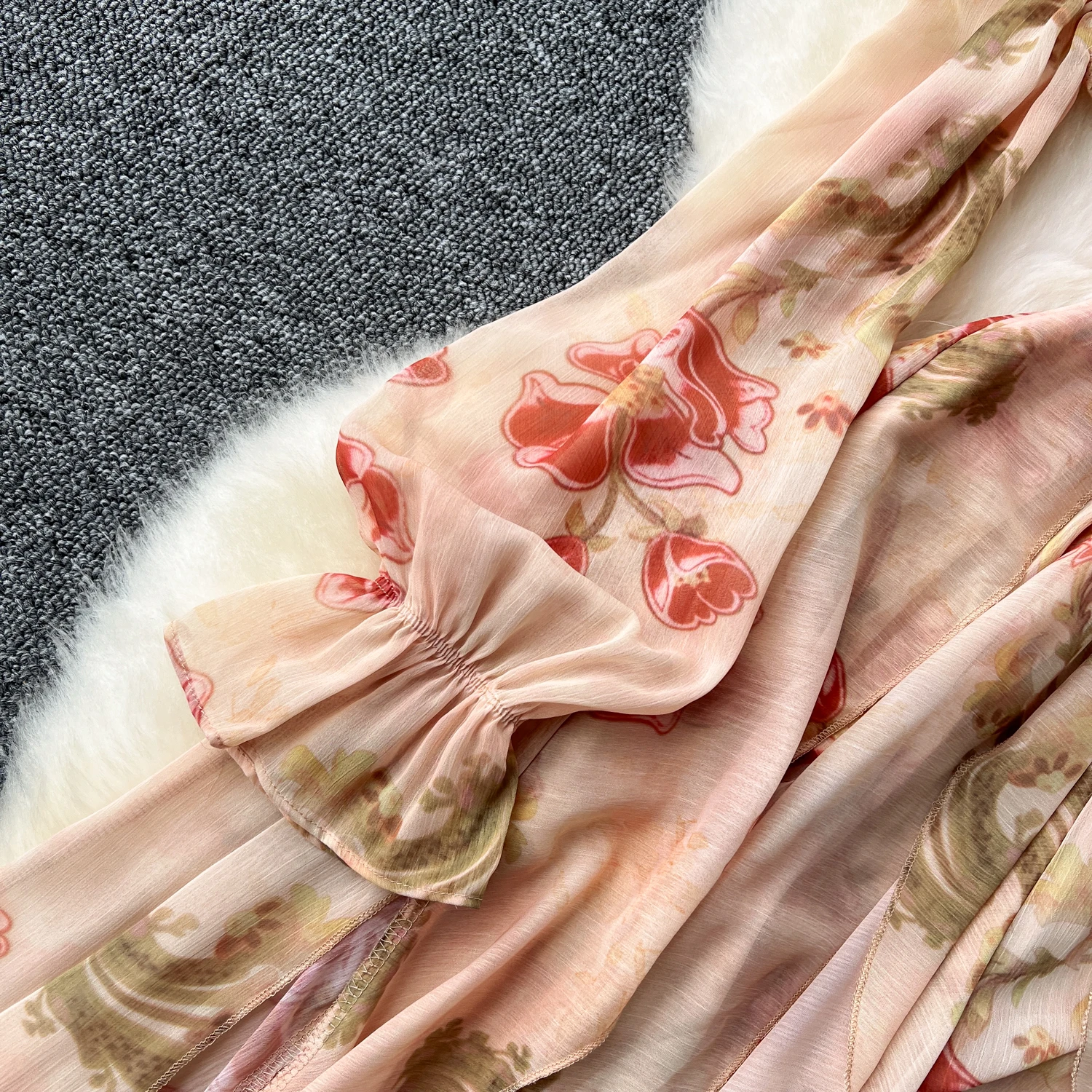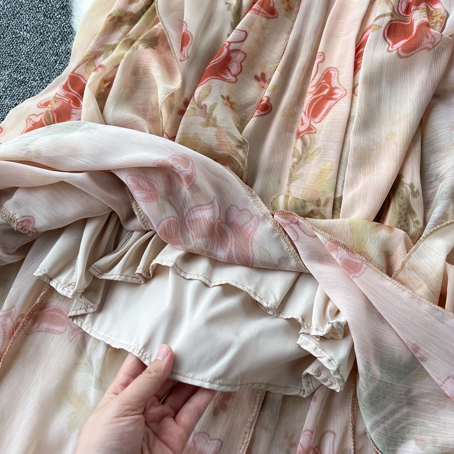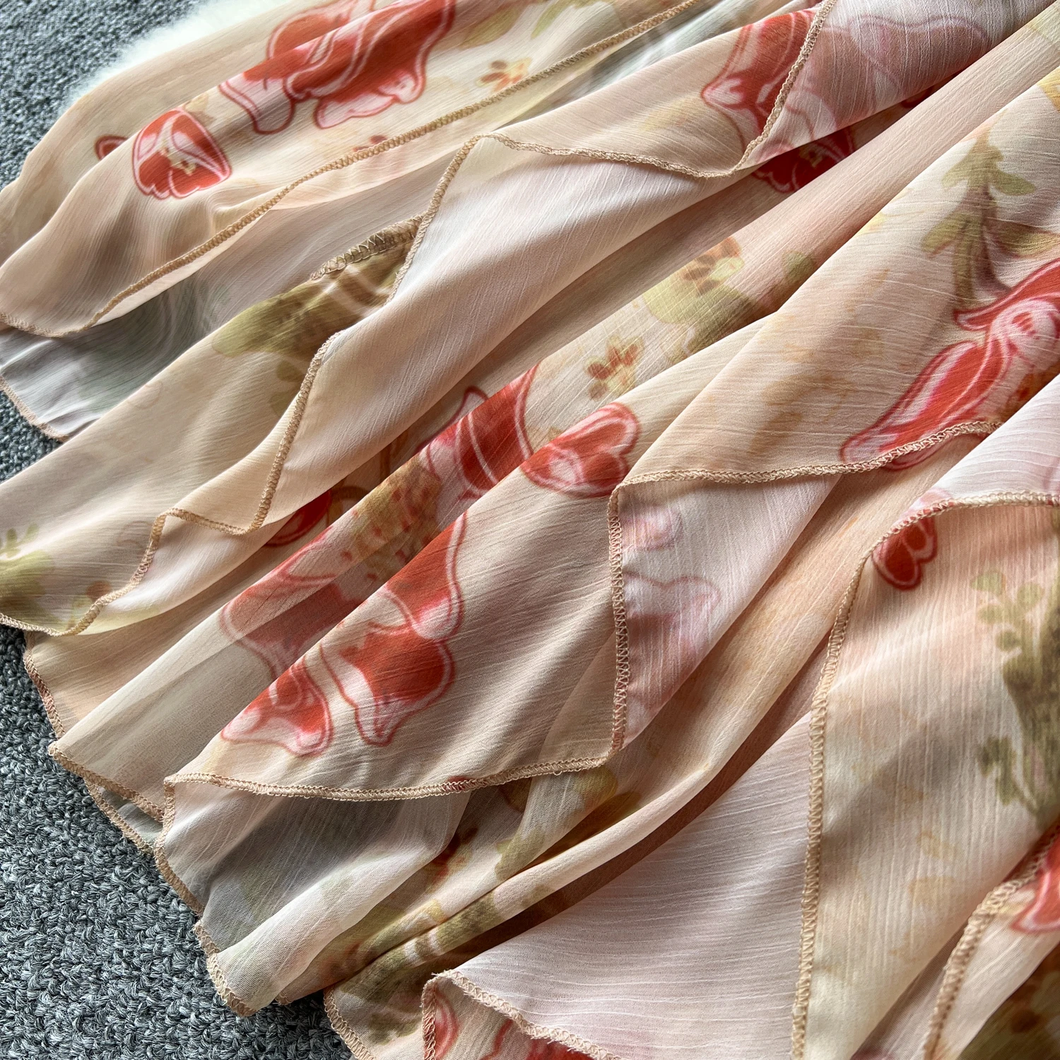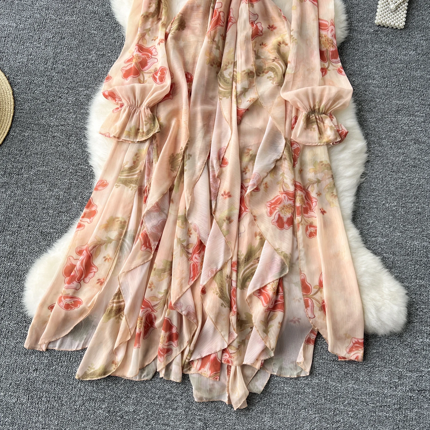 فستان نسائي أنيق غير متماثل بطباعة كشكش فستان نحيف عتيق فساتين شيفون حلوة صيفية أنيقة وفضفاضة