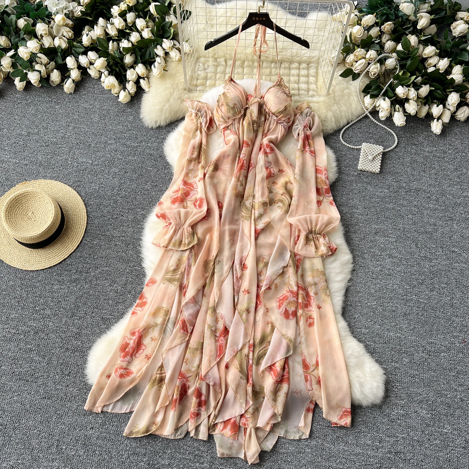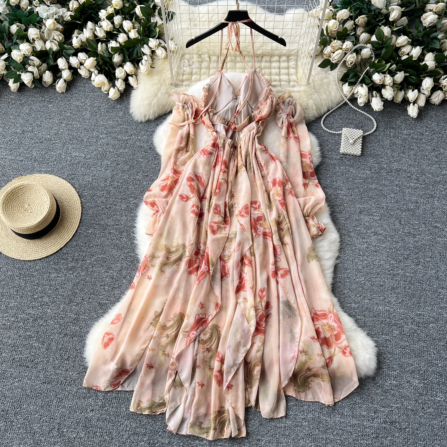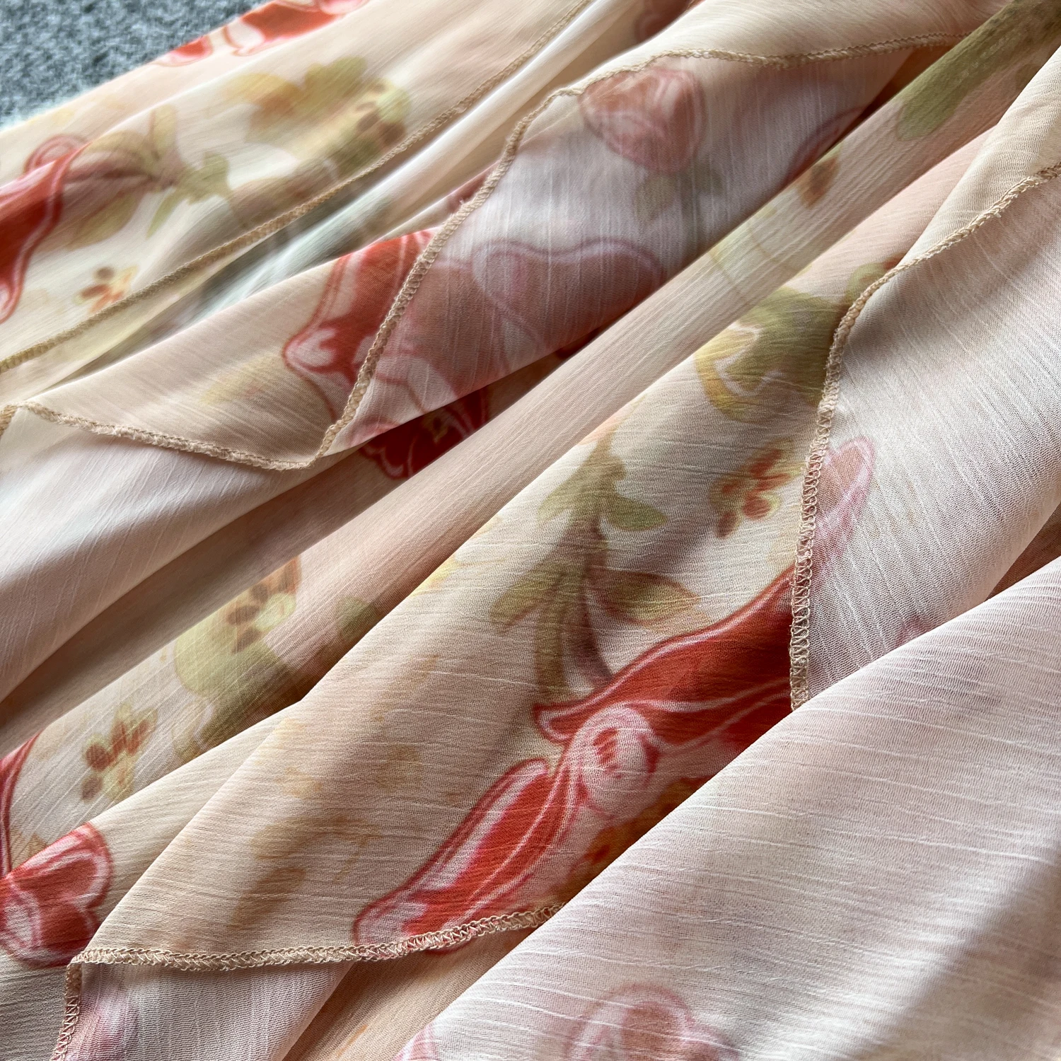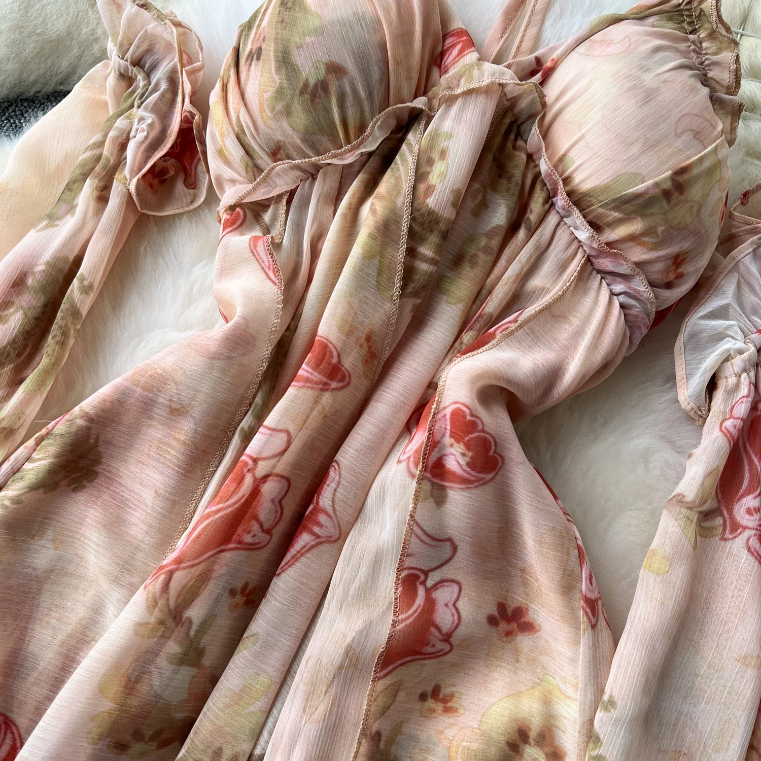 فستان نسائي أنيق غير متماثل بطباعة كشكش فستان نحيف عتيق فساتين شيفون حلوة صيفية أنيقة وفضفاضة