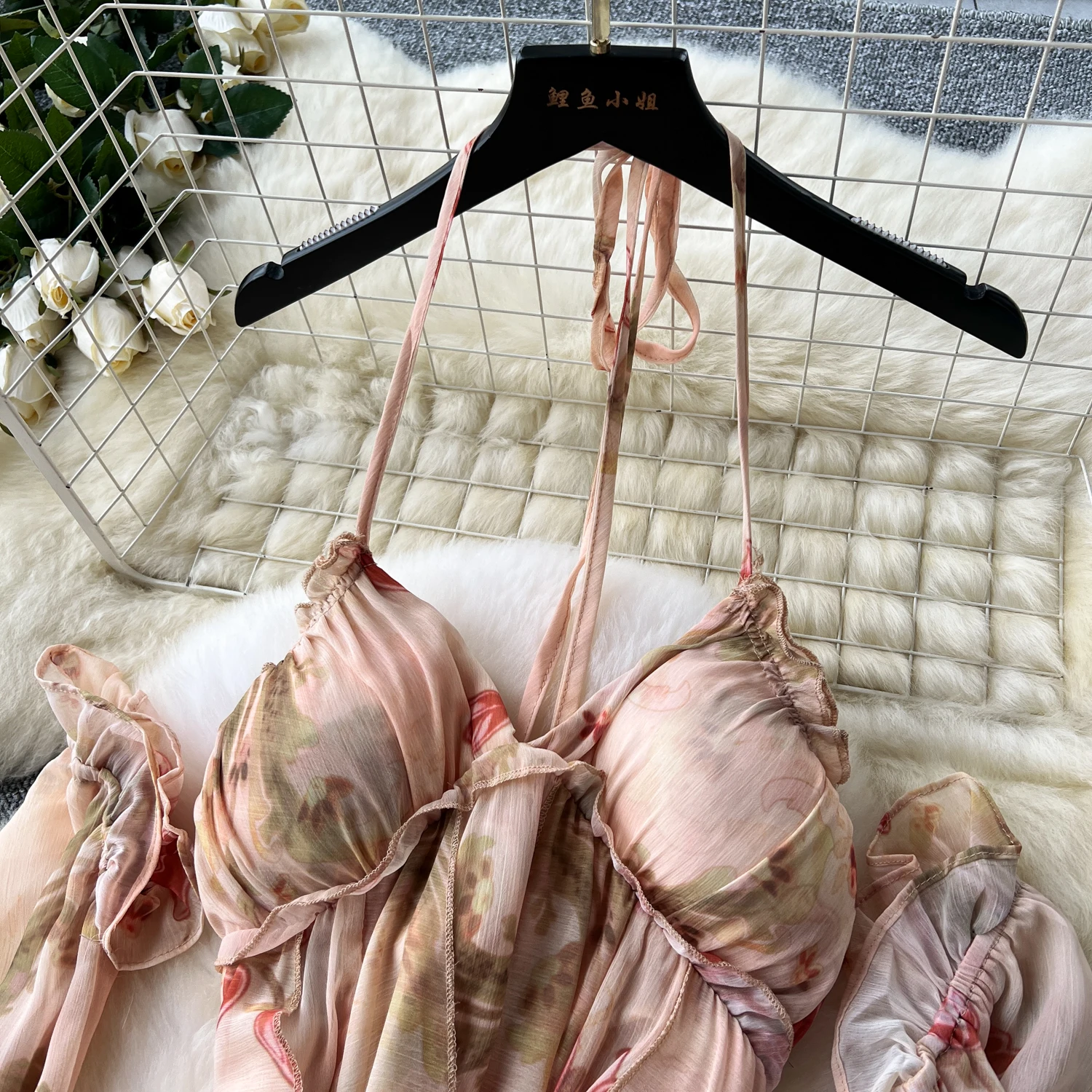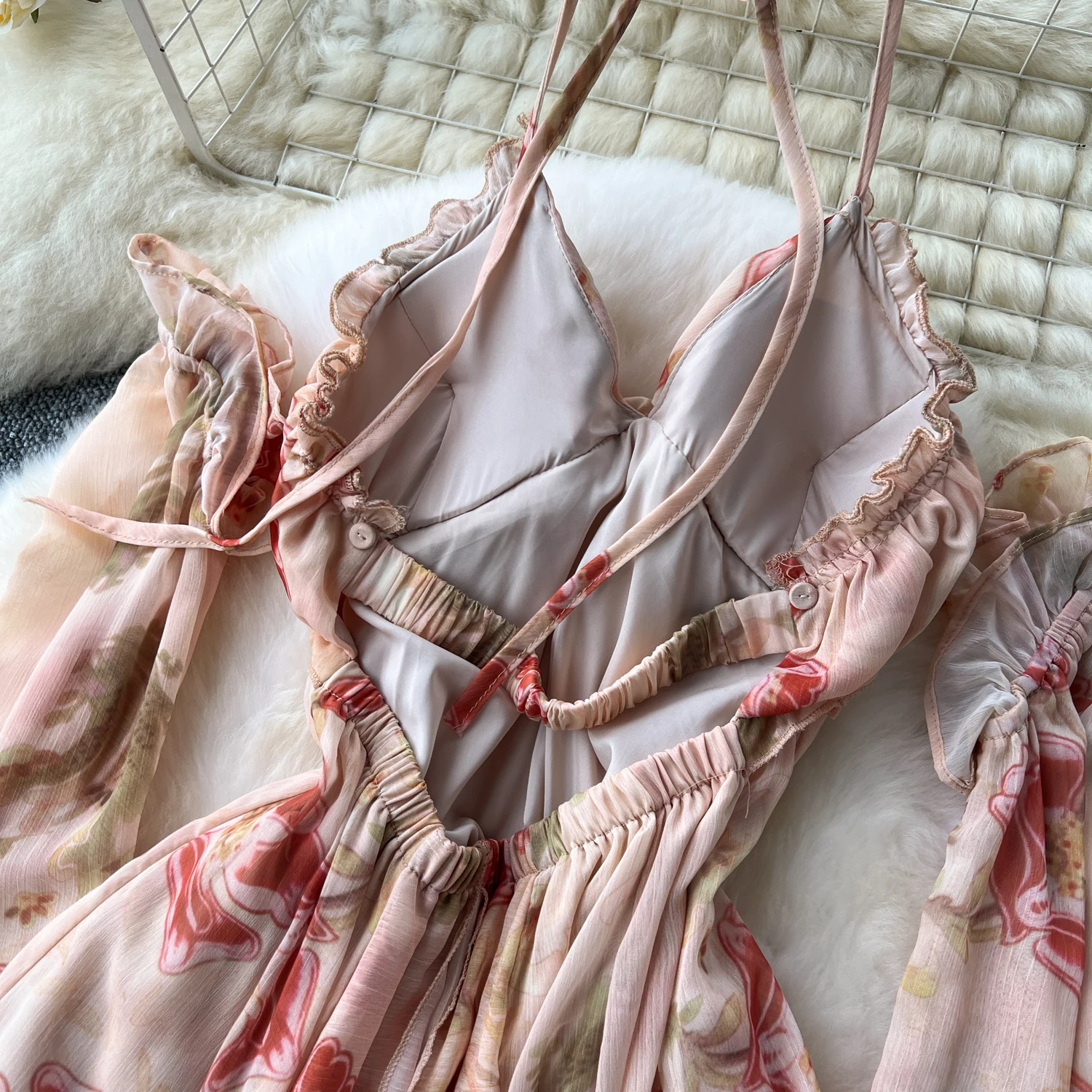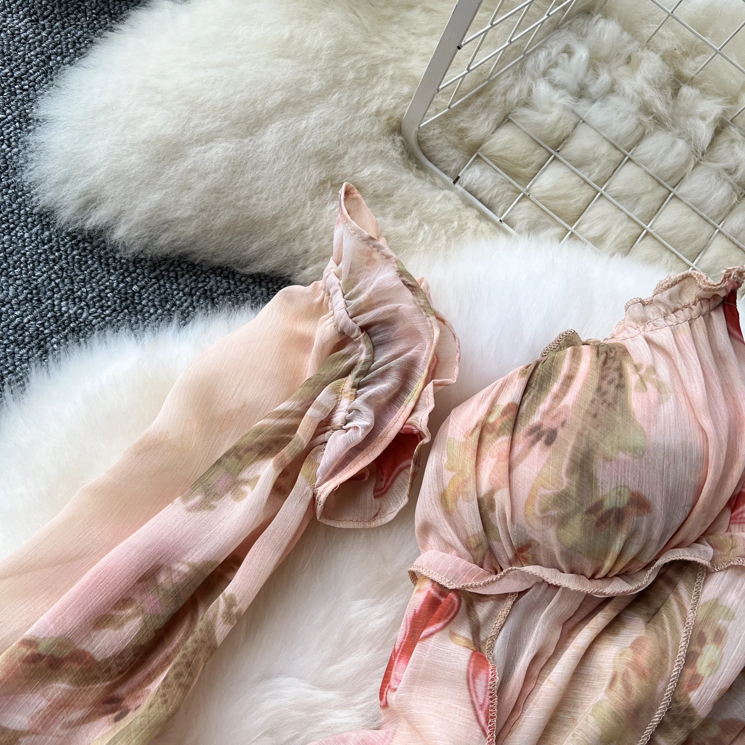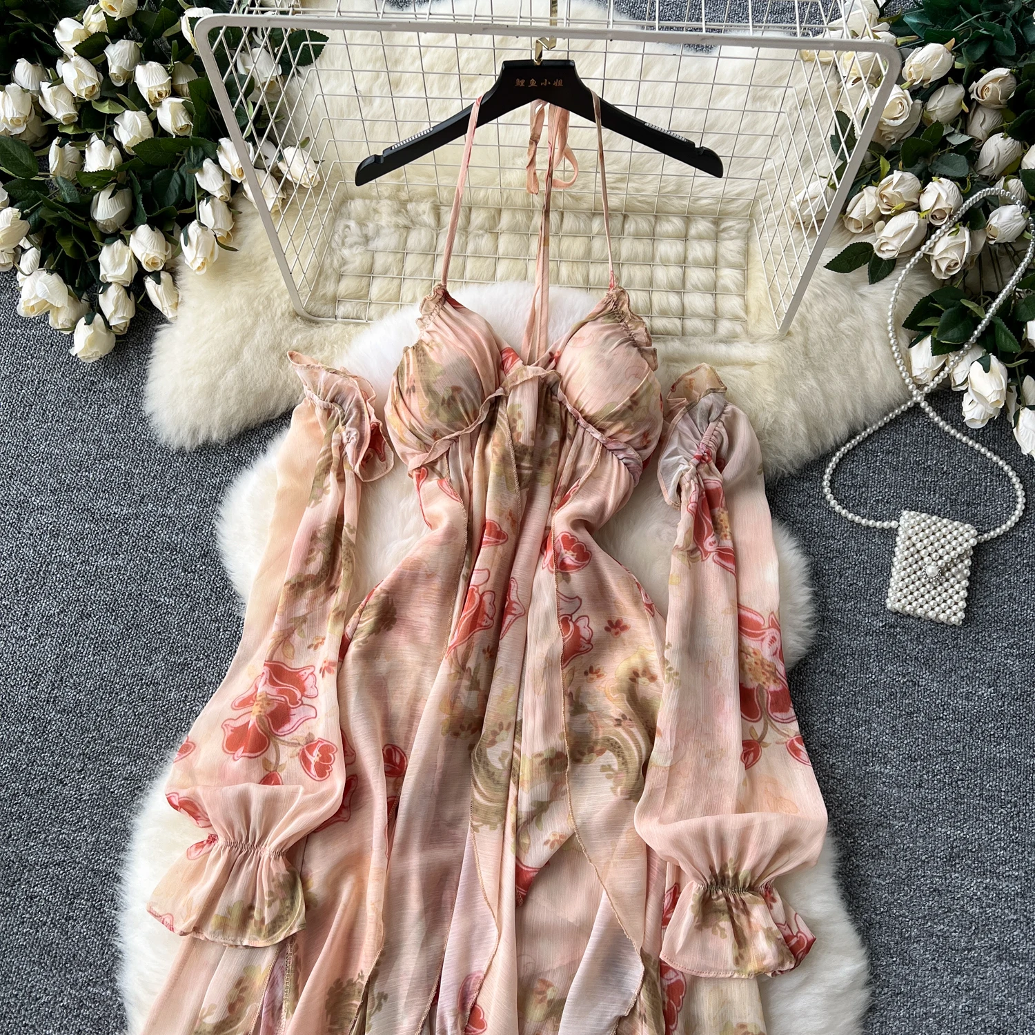 فستان نسائي أنيق غير متماثل بطباعة كشكش فستان نحيف عتيق فساتين شيفون حلوة صيفية أنيقة وفضفاضة
