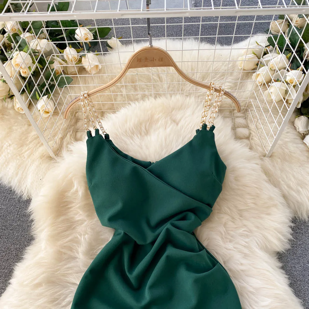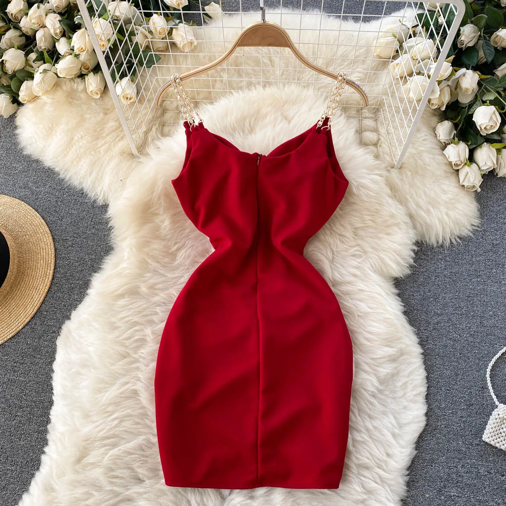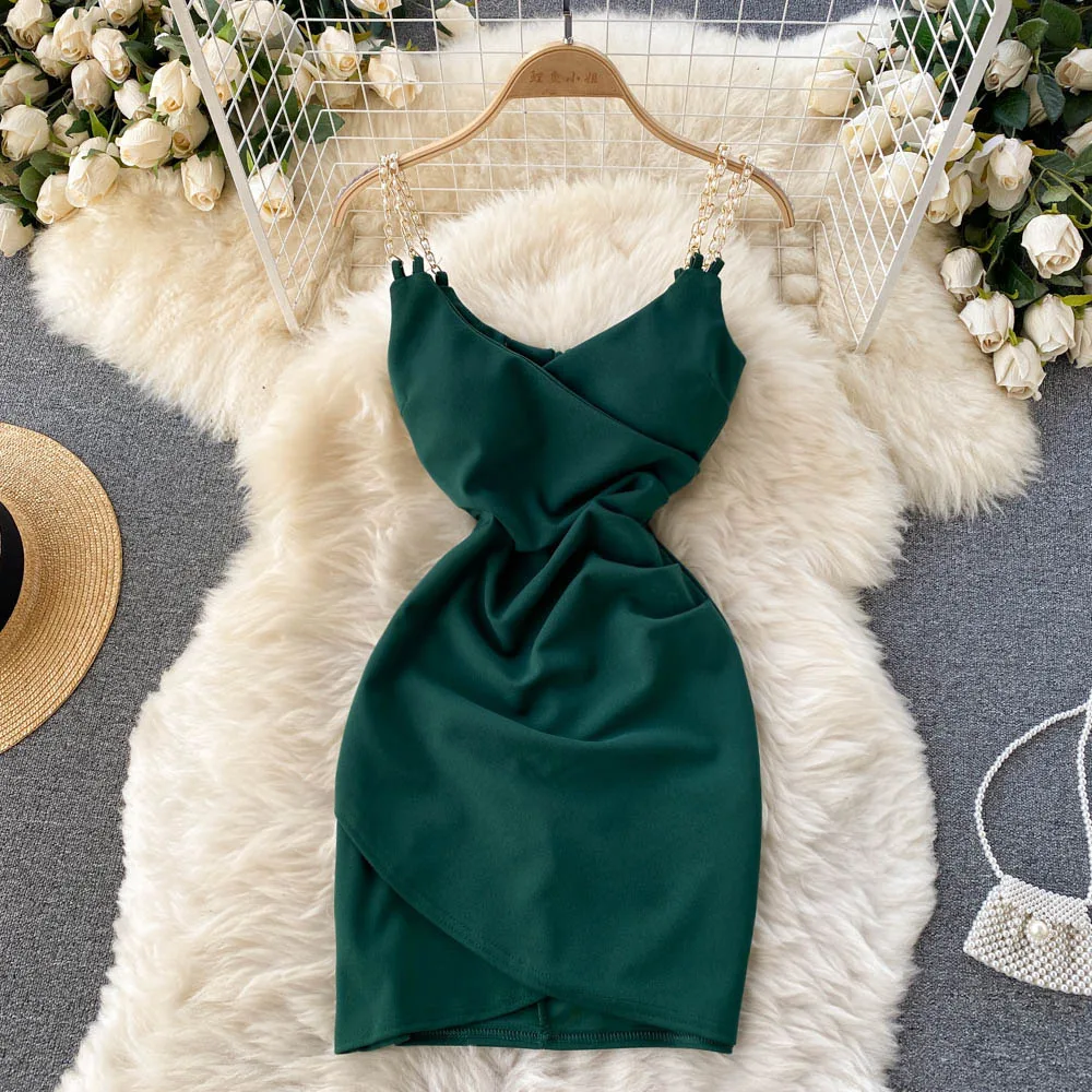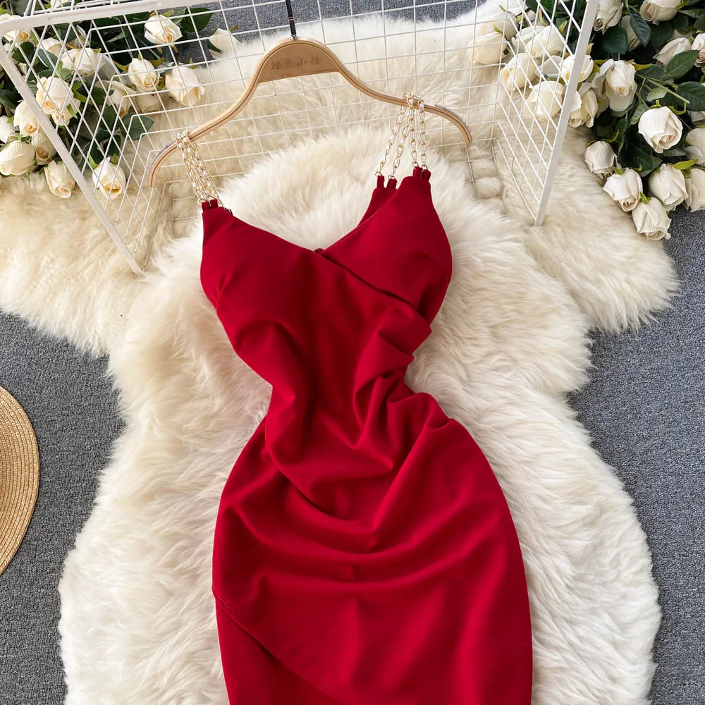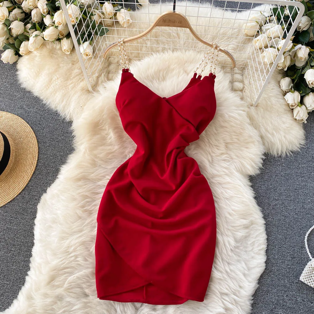 فستان نسائي براق بفتحة رقبة على شكل حرف V ، فستان حفلة بطيات ضيقة ، فستان نسائي قصير مثير ، سلاسل ، صيف ، جديد