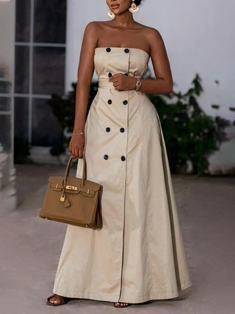 فستان Freeacy نسائي كاكي بدون حمالات مزدوج الصدر عالي الخصر بحزام أنيق ملابس مكتب غير رسمية 2025 فساتين حفلات جديدة