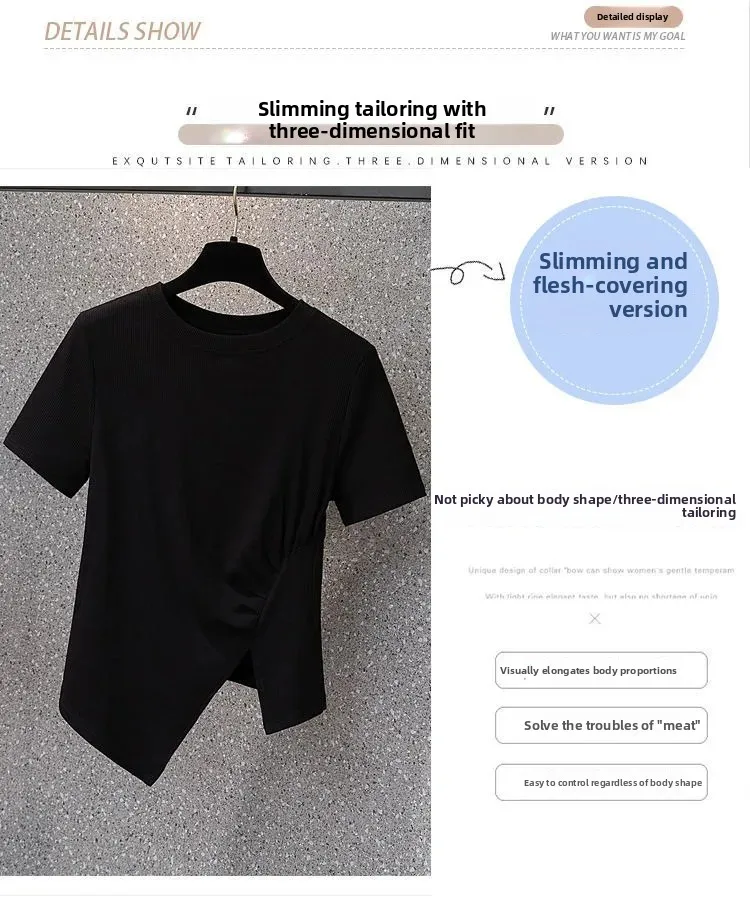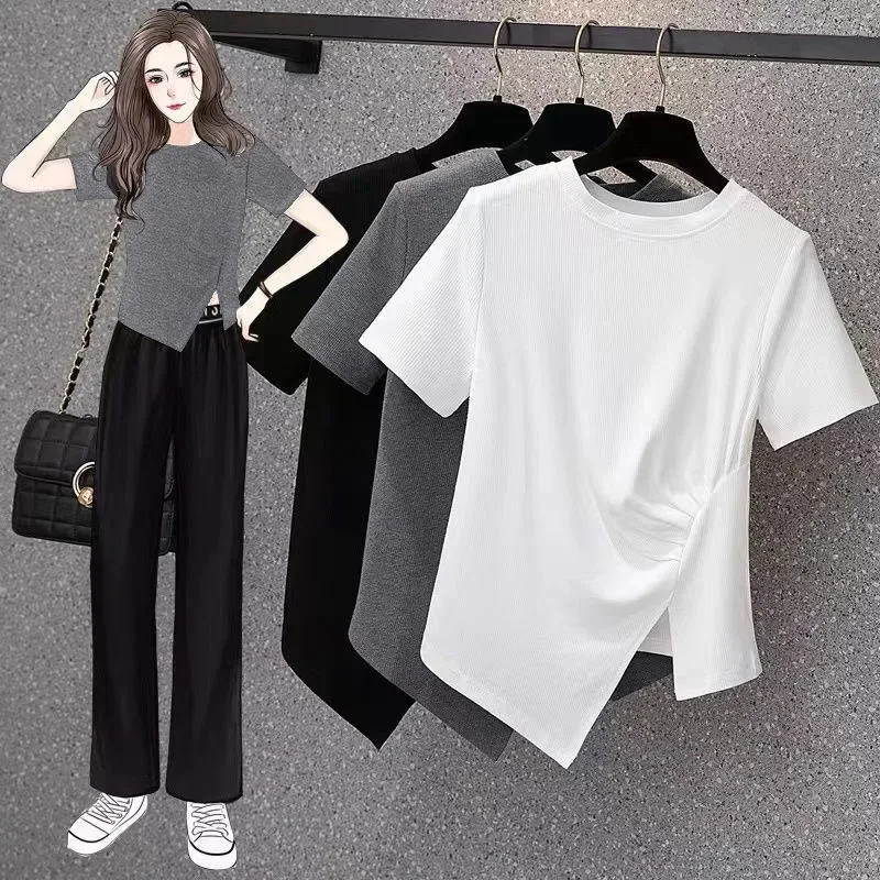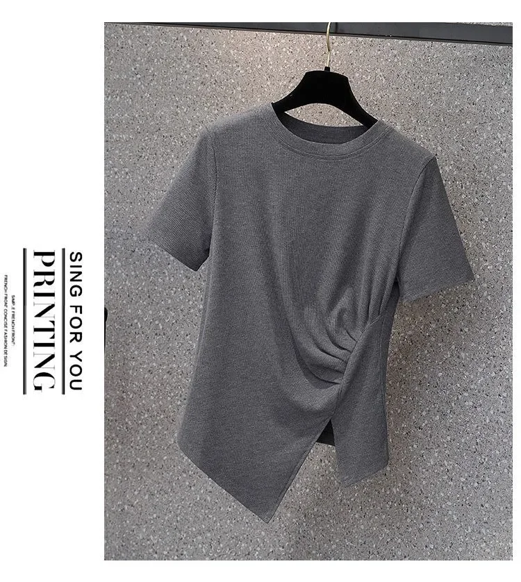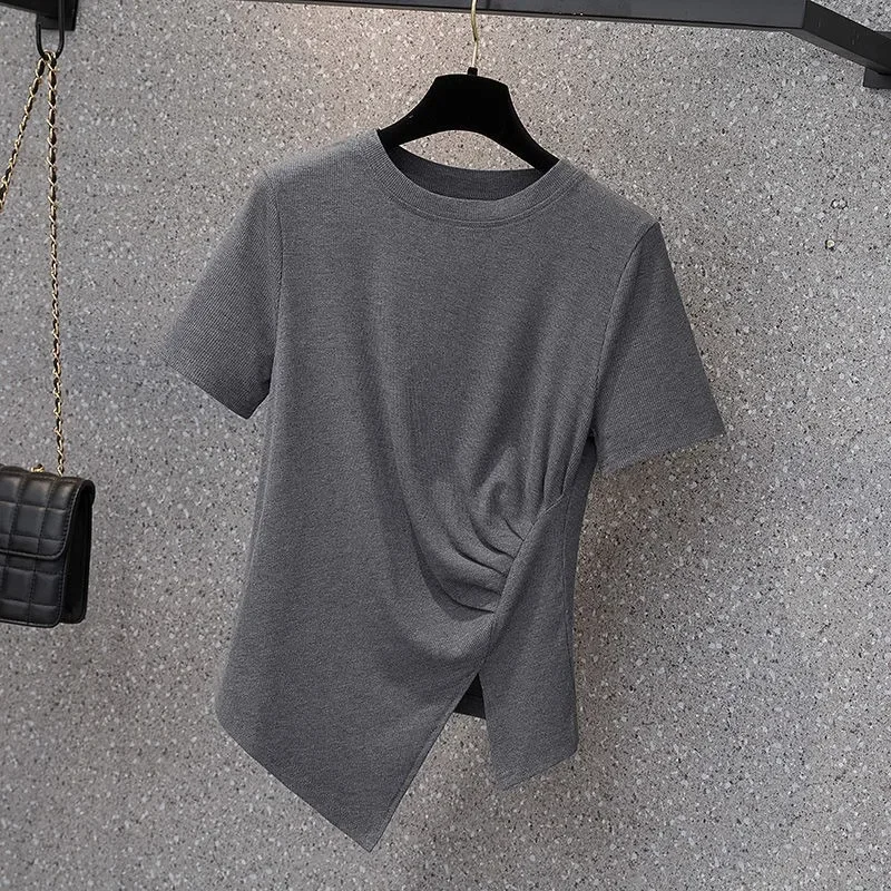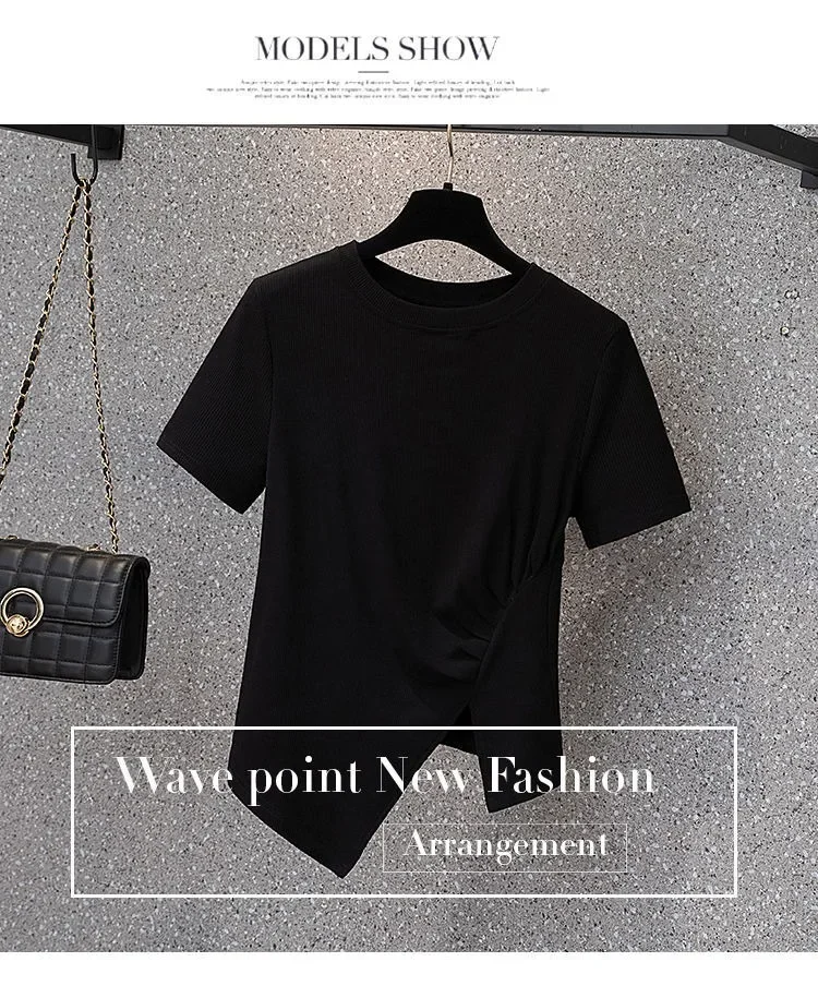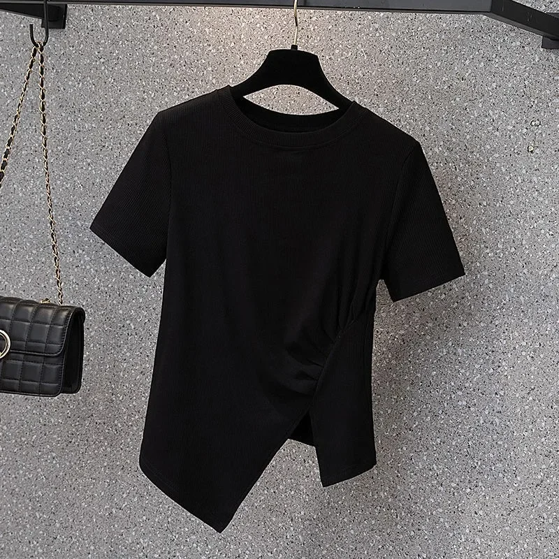 فضفاضة تناسب تي شيرت غير رسمي المرأة الصيف رائجة البيع للموسم نمط جديد غير المتماثلة لون نقي حجم كبير بلوزة قصيرة الأكمام للسيدة