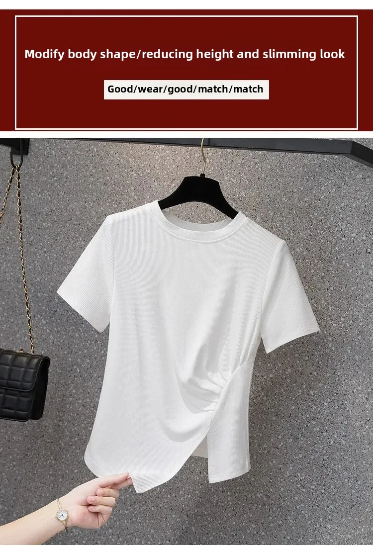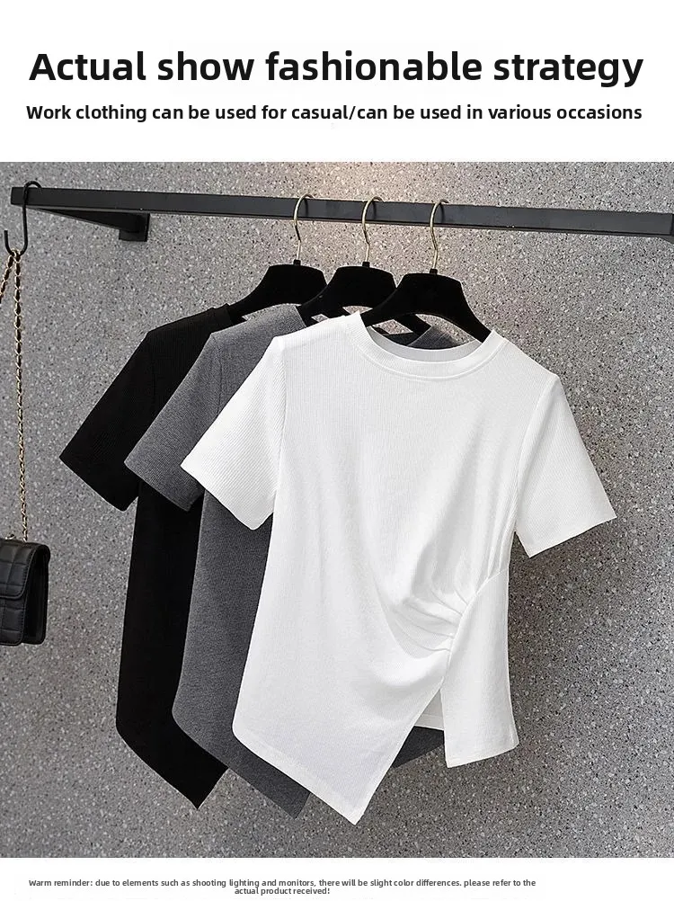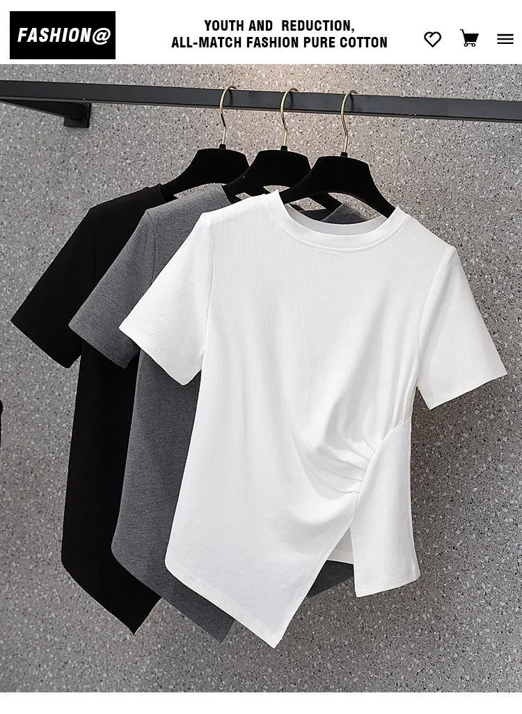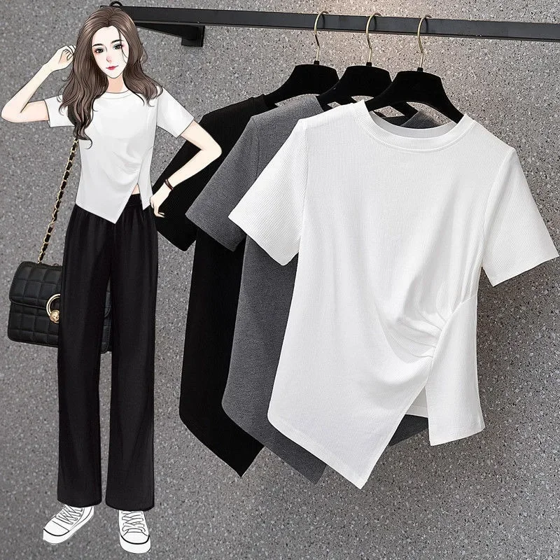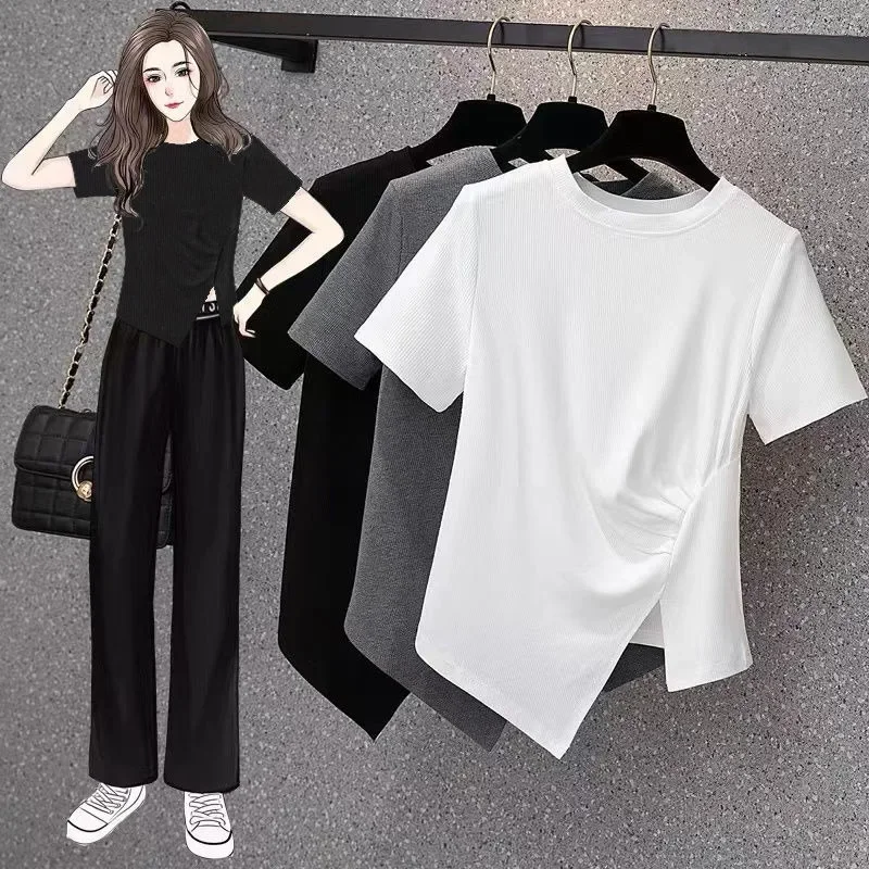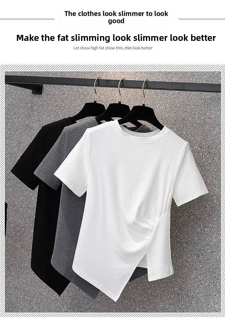 فضفاضة تناسب تي شيرت غير رسمي المرأة الصيف رائجة البيع للموسم نمط جديد غير المتماثلة لون نقي حجم كبير بلوزة قصيرة الأكمام للسيدة